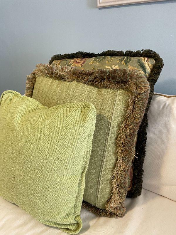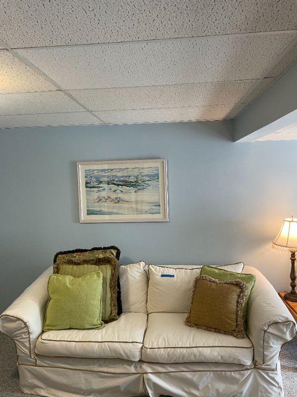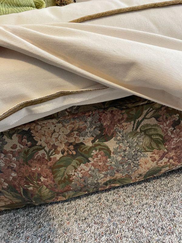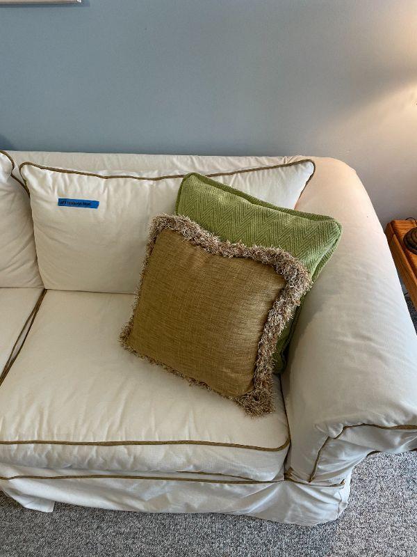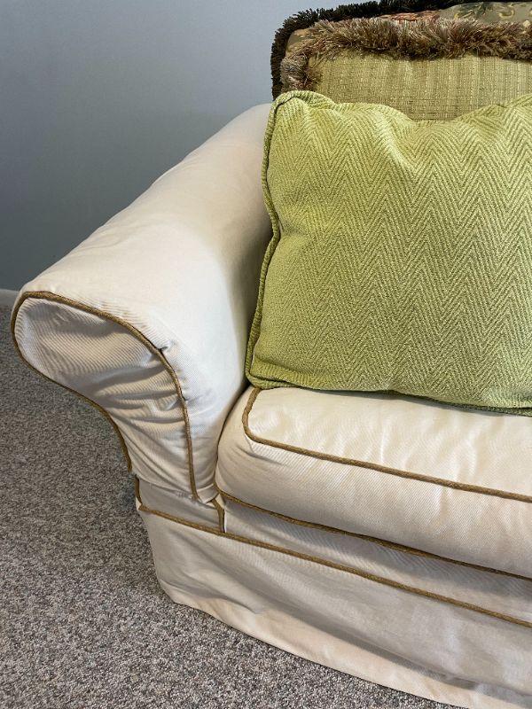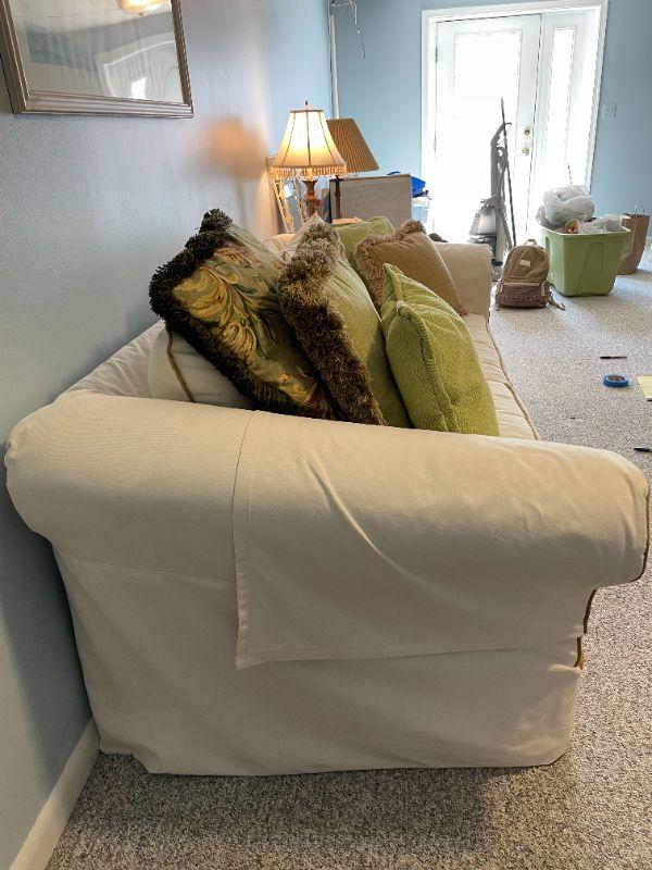 Couch with handmade cover (89'' L x 39'' W x 30'' tall), (5) throw pillows.