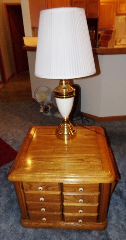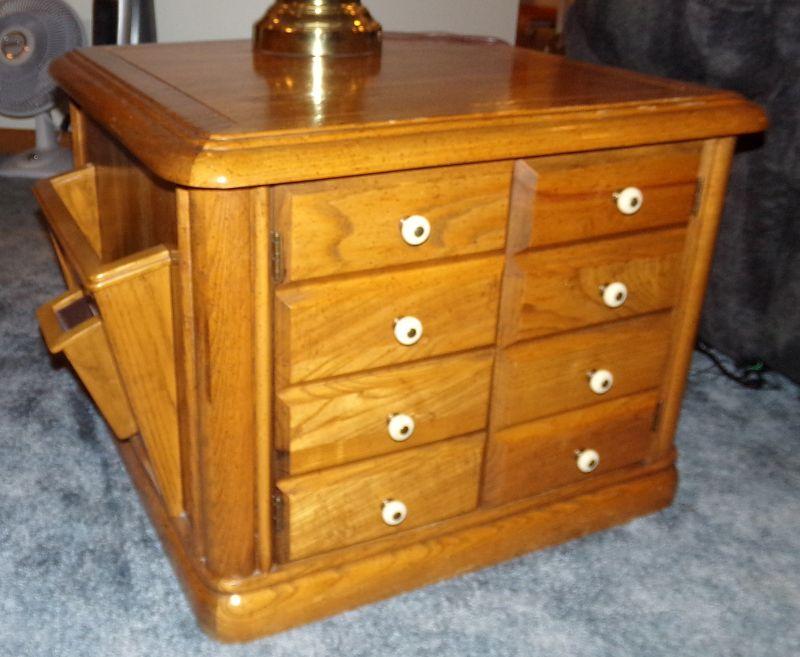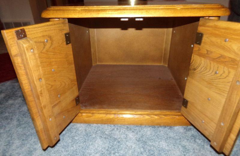 OAK END TABLE W/STORAGE BEHIND DOUBLE CABINET DOOR. THE TABLE ALSO HAS A MAGAZINE RACK ON EACH SIDE
