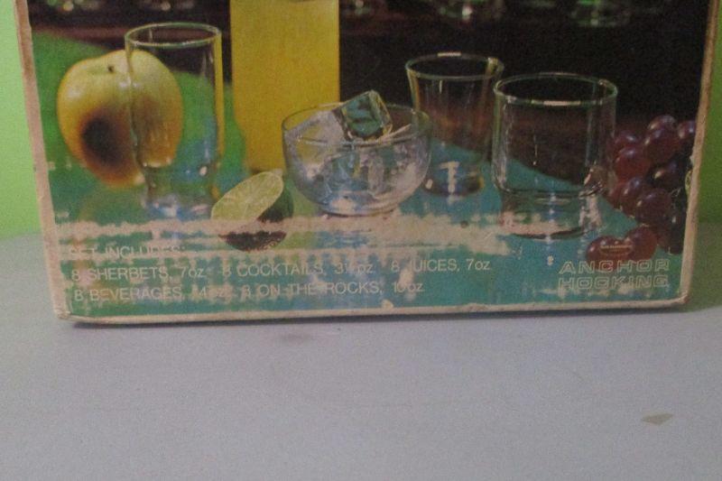 This set is by Anchor Hocking and the box has never been opened. It contains 5 each of: sherberts, cocktails, juices, on-the-rocks, and beverages.