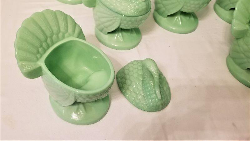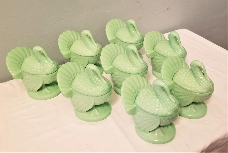 From what we can tell, these pieces were made about 20 years ago in the Jadite style - very heavy, highly detailed. 3-d Turkey Gobbler with removeable lid - perfect for soup or Gumbo....nice set of 8 - imagine one at each place setting on your Thanksgiving table! Each is 7.5" tall and 7" long. Like new condition. No boxes. I think these were done by the L.E. Smith Company. You are bidding on the entire set.