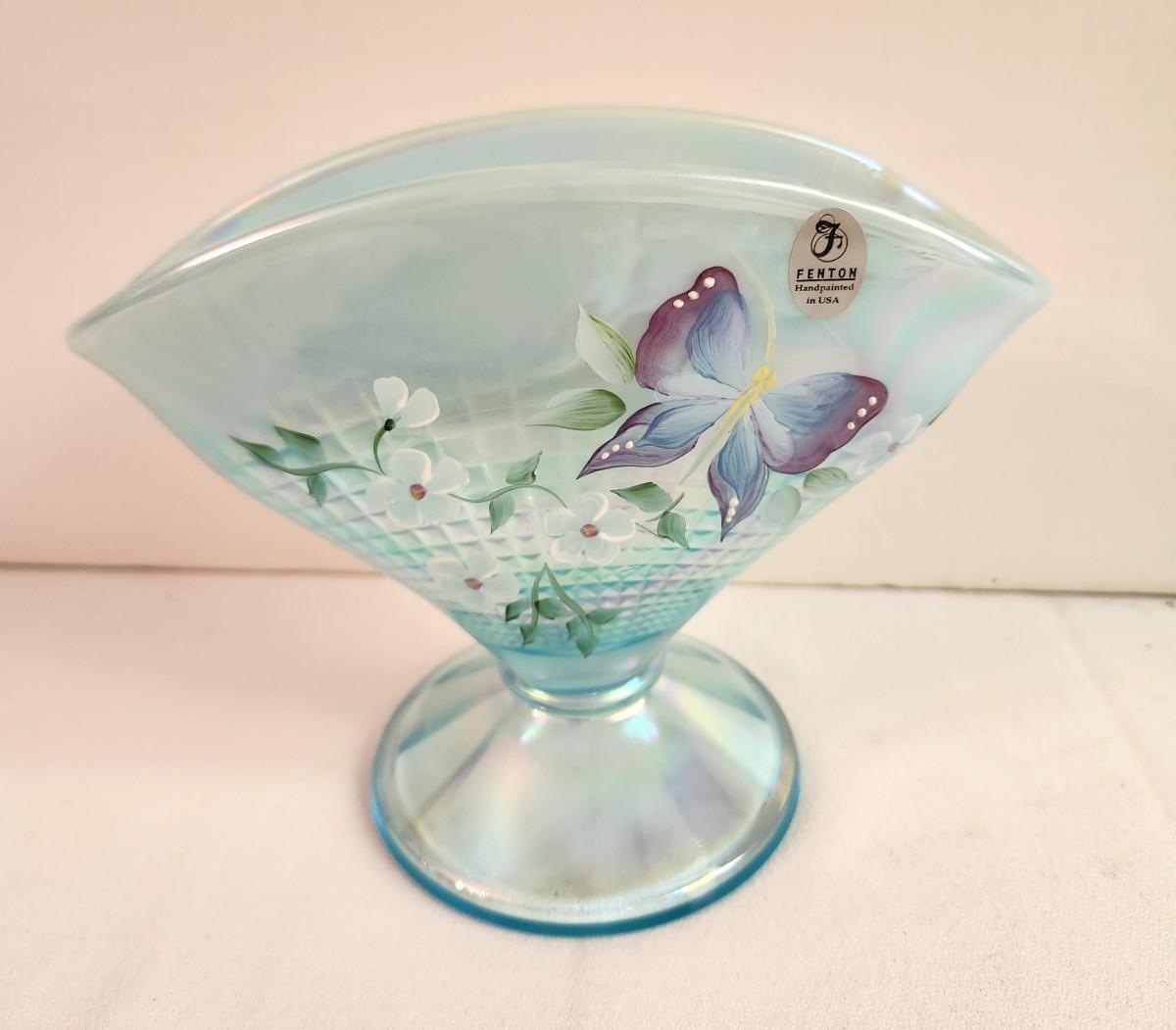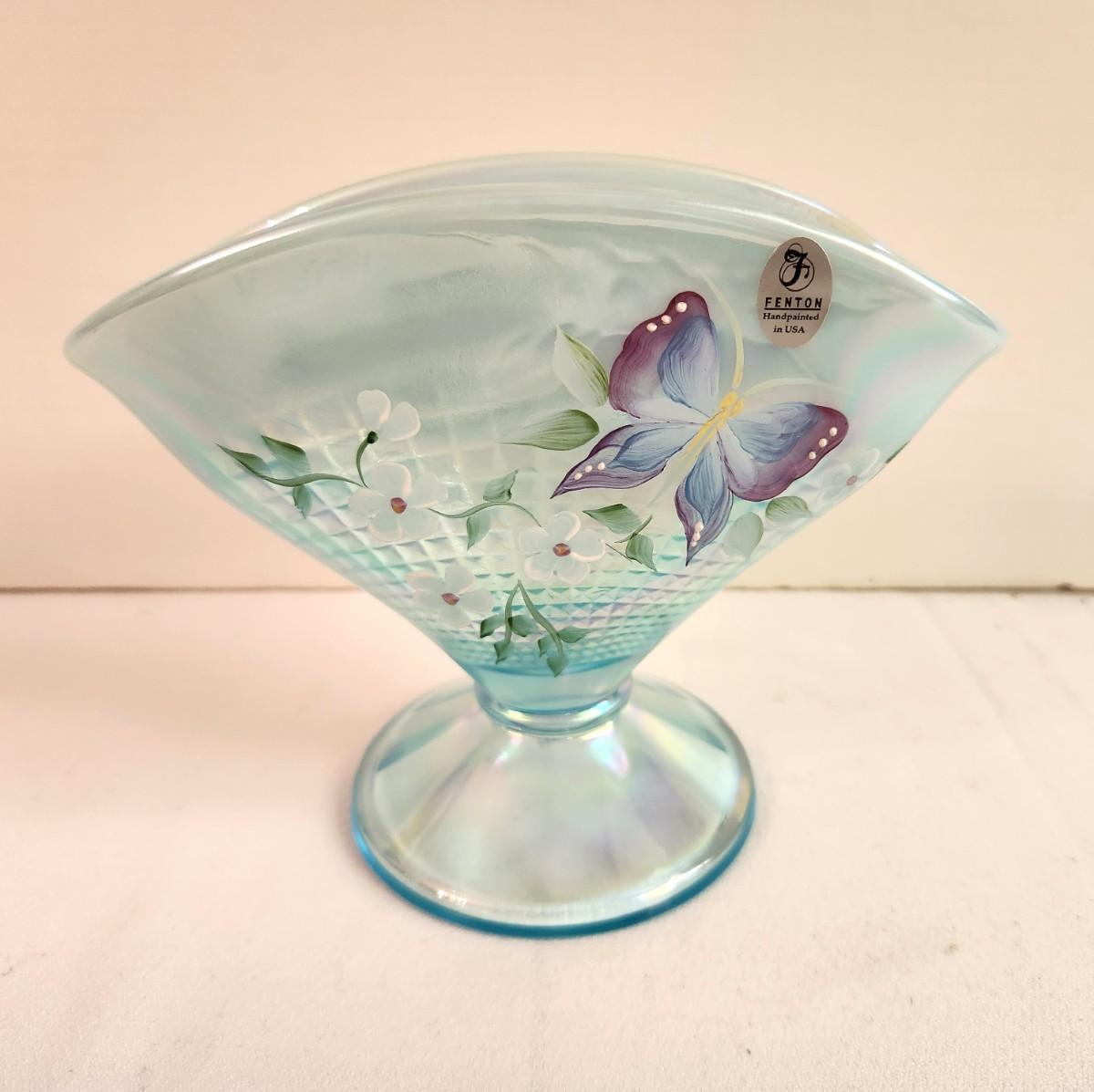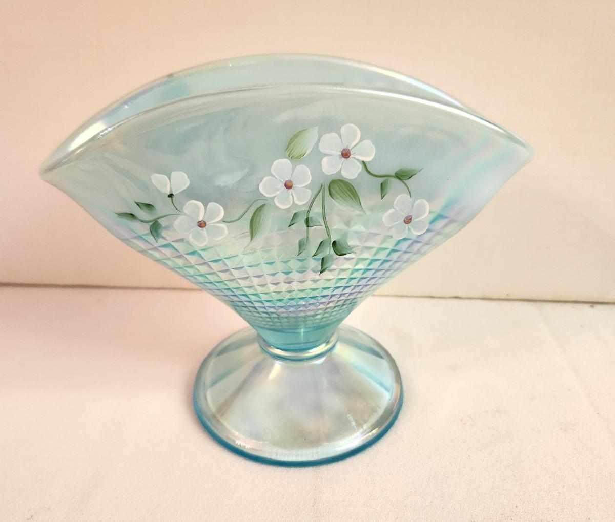 Pretty Fenton Opalescent Aqua Blue Fan Shaped vase - 1993 - hand painted, signed - label. 6" tall. Good condition. No box.