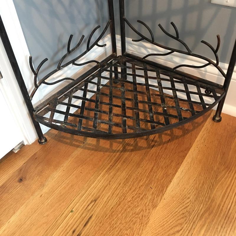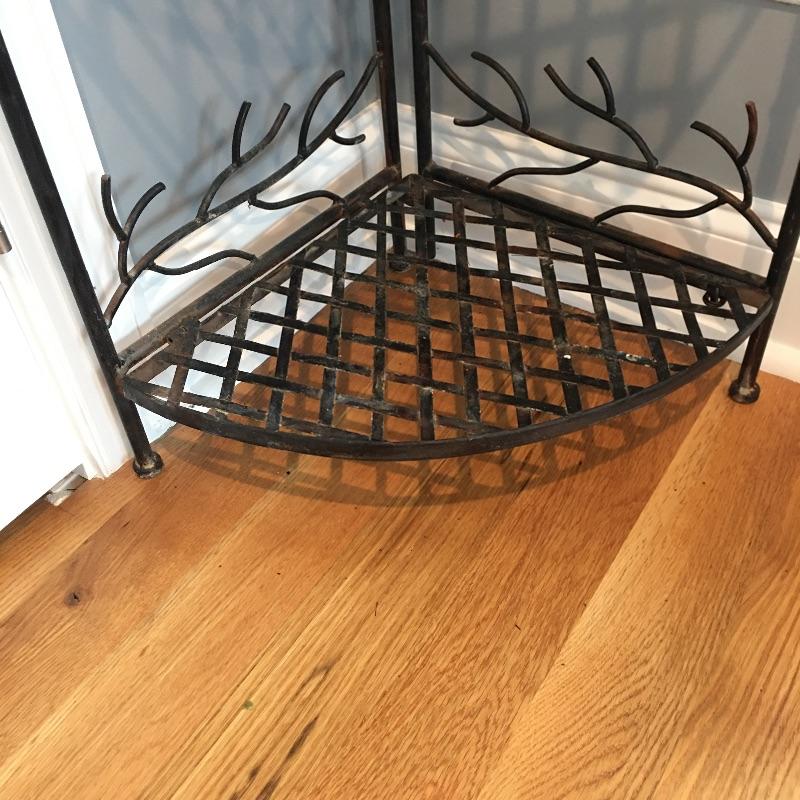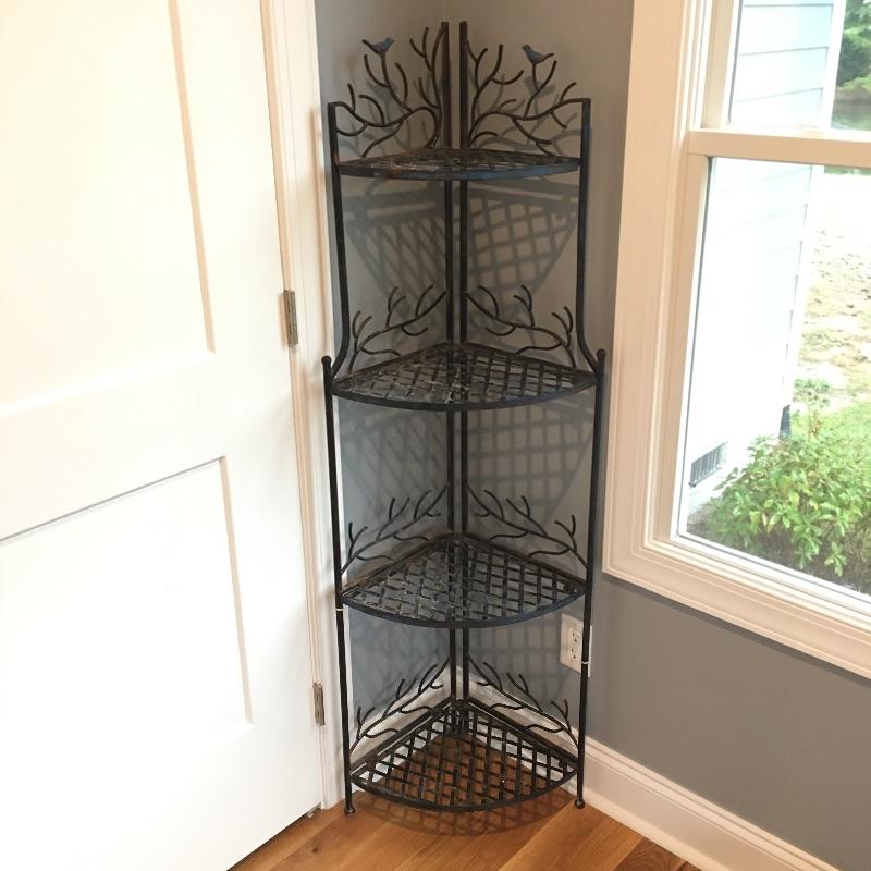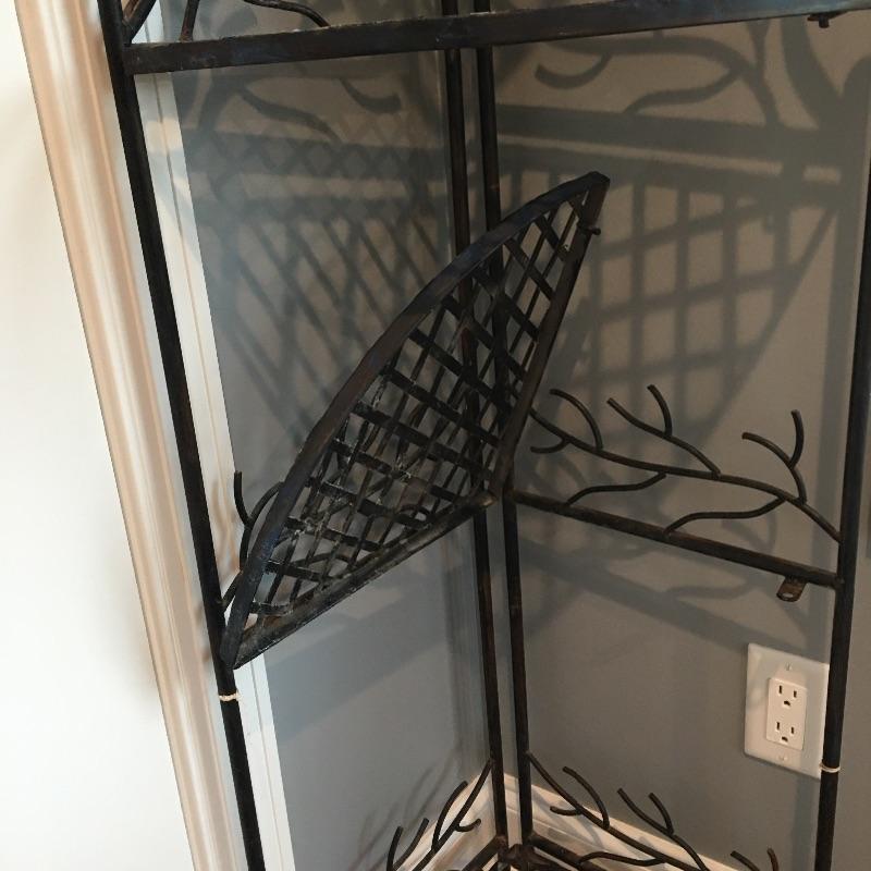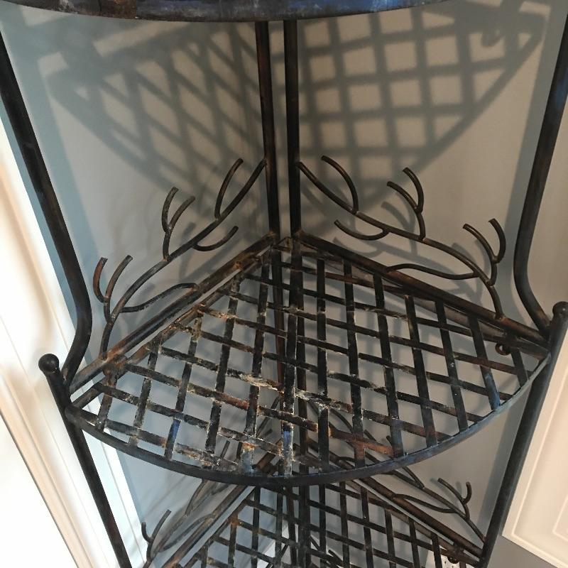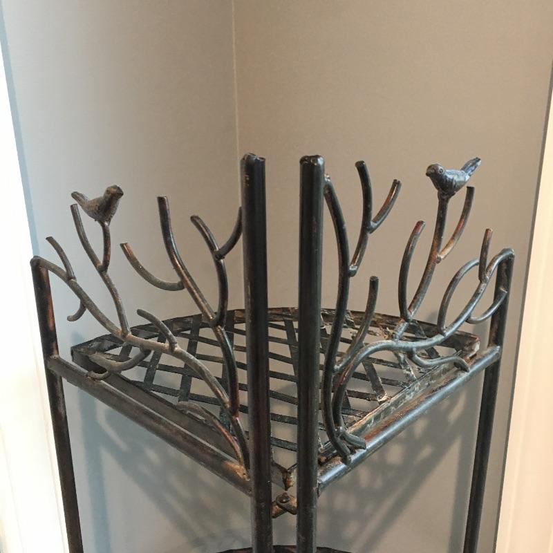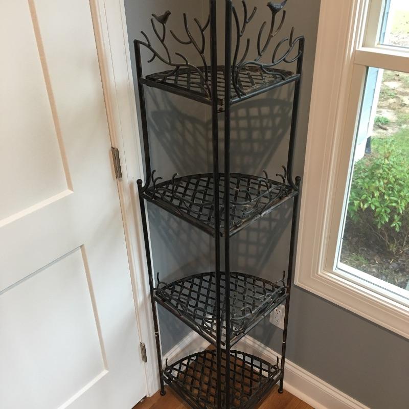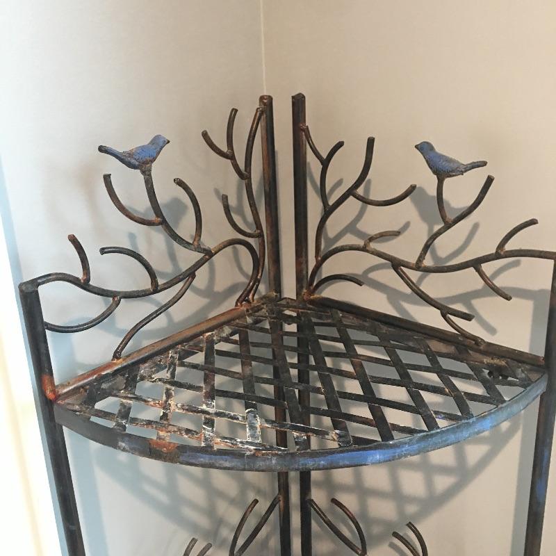 Attractive and so practical, fill out an unused corner of your space with this metal four tier folding corner shelf. This enchanting piece has delightful birds and branches design. Leave as is for a little rustic charm or an easy fix with paint for a more polished look. Shelf measures 13” x 19” x 60”.