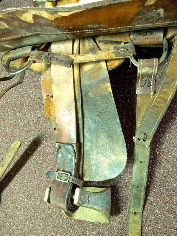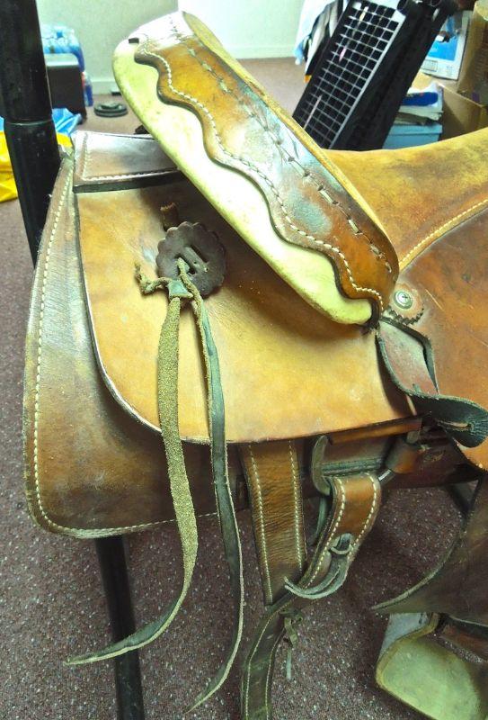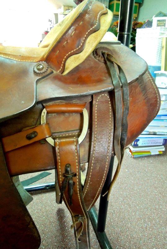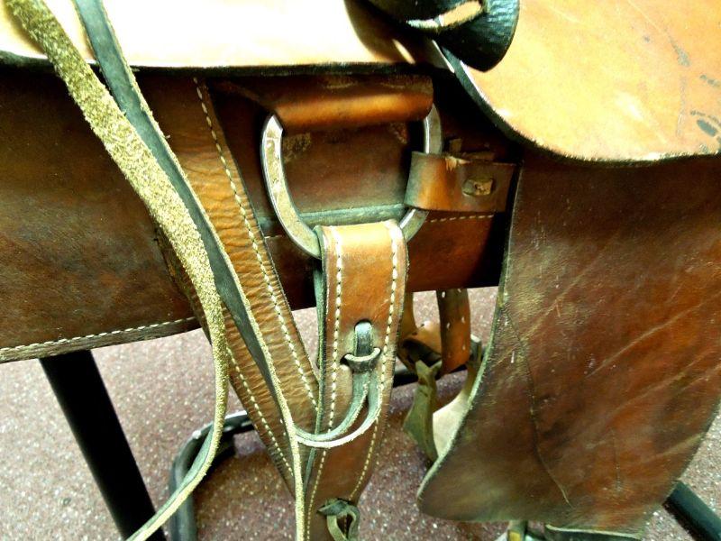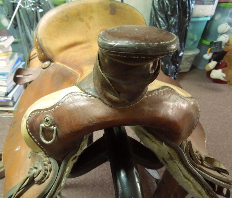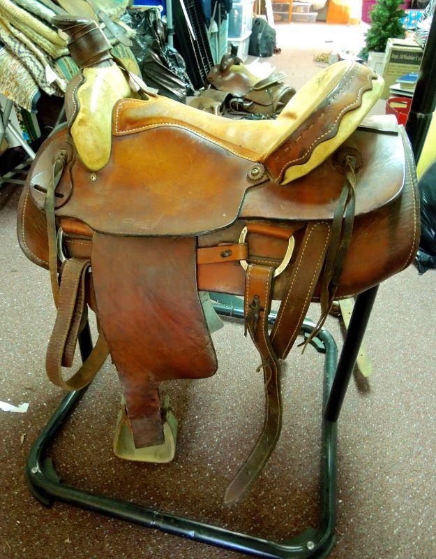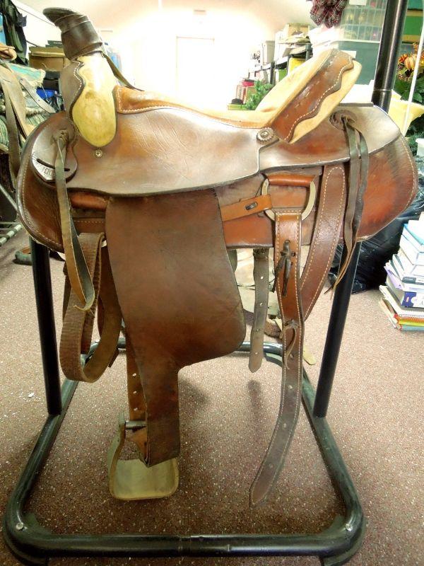 This beautiful gaited western pleasure trail horse saddle features an antique look with a gorgeous cheyenne roll fluted stitched design! Featuring numerous saddle ties and comfort. Wooden stirrups are in excellent condition. The fleece underside is lightly worn as well. In very good used condition with lots of miles and smiles left. 16" seat.