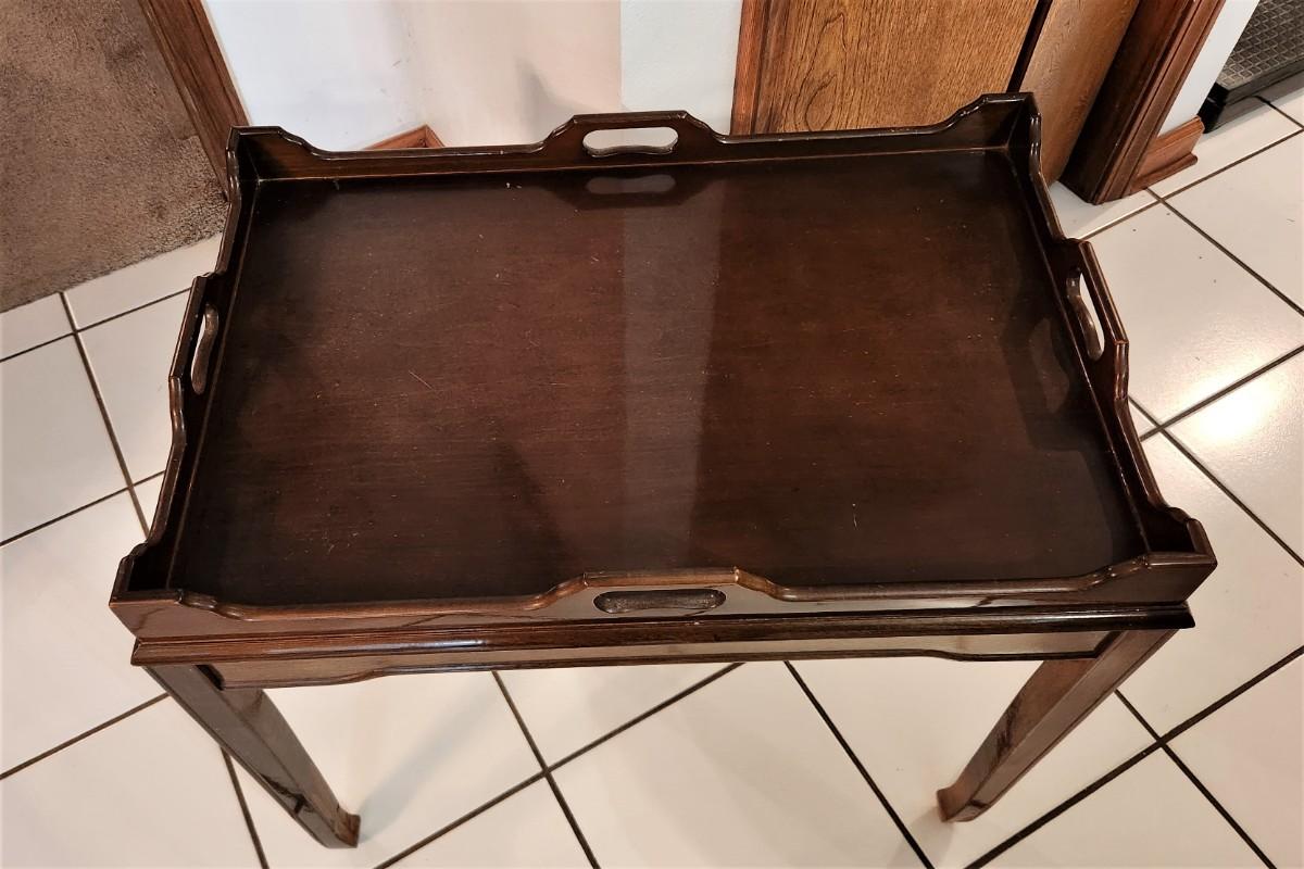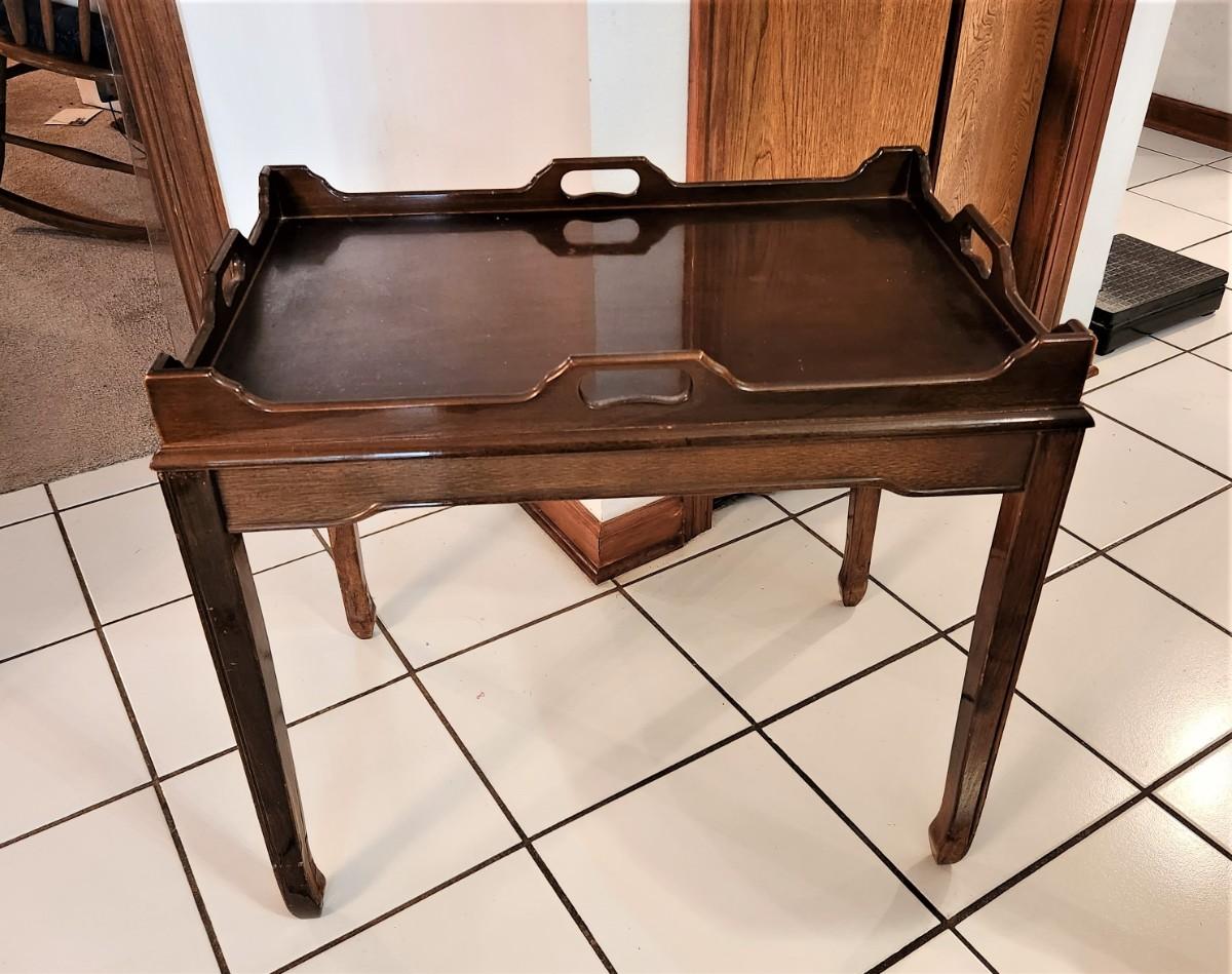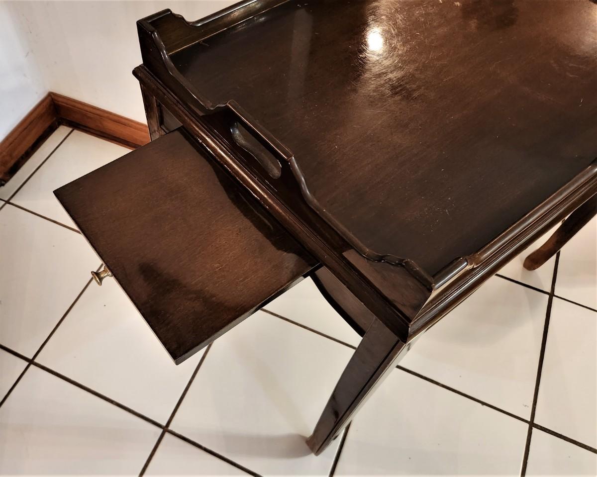 Mahogany Finish side table with gallery - slide out drink holders on both sides - no maker noted - 26" x 17", 22" tall. Good, gently used condition.