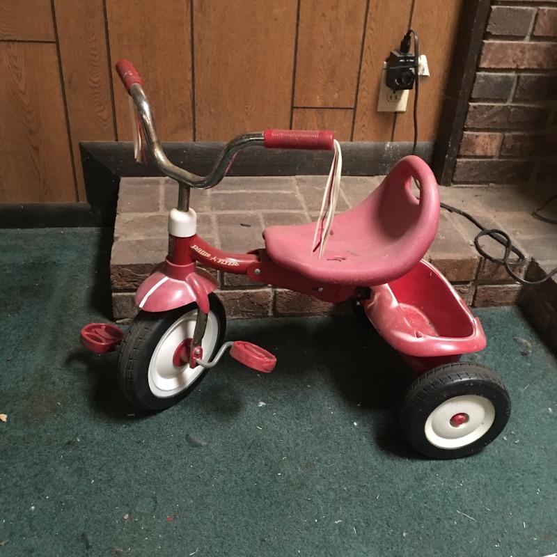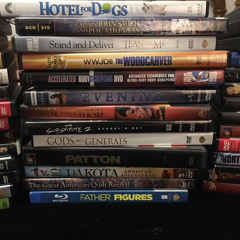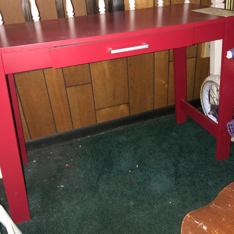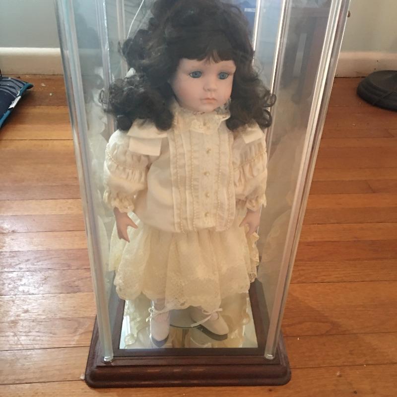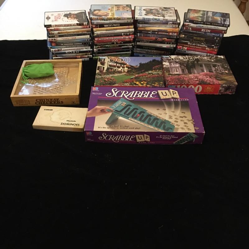 Keep yourself entertained for months to come with this assortment of DVDs, games, dolls and more. Lot includes DVDs, 3 life size dolls and a doll in a display case and two ceramic figurines. Games include Scrabble Up, Chinese Checkers, dominos, and puzzles. Also included is a stuffed animal rabbit, doll display table and shelf, wooden chair, red desk, headboard, Radio Flyer Tricycle, Princess Bicycle and more. Red desk measures 17.5” x 39.5” x 29”.