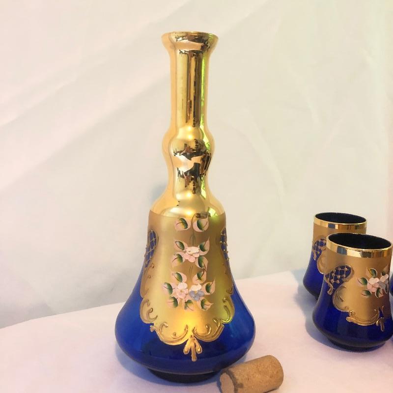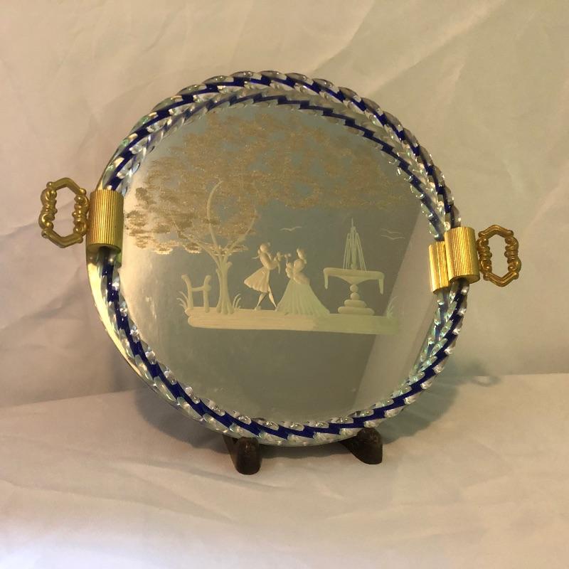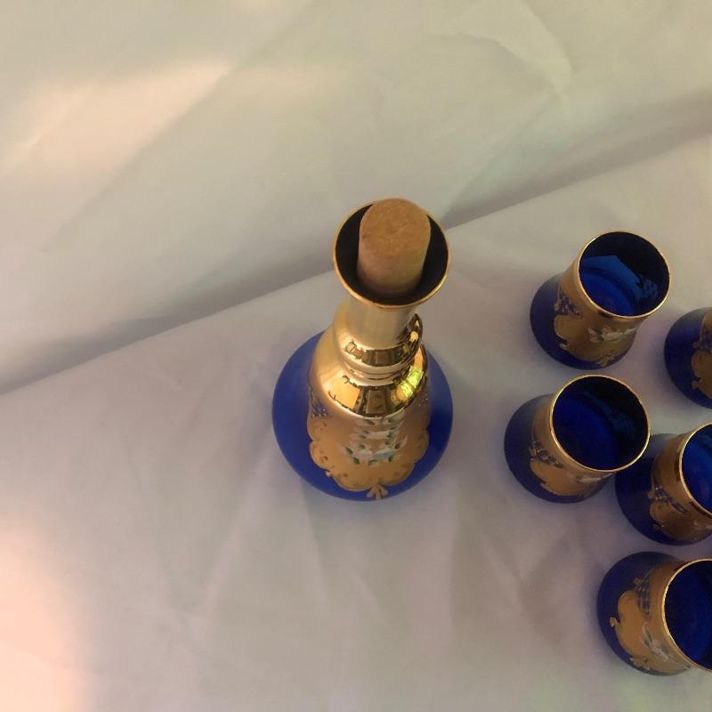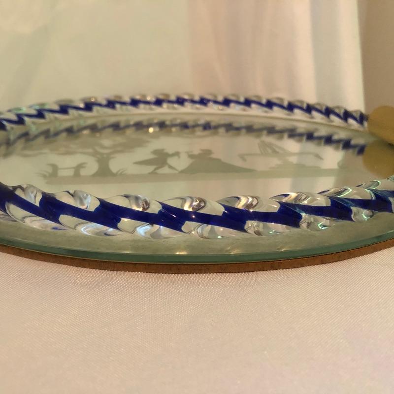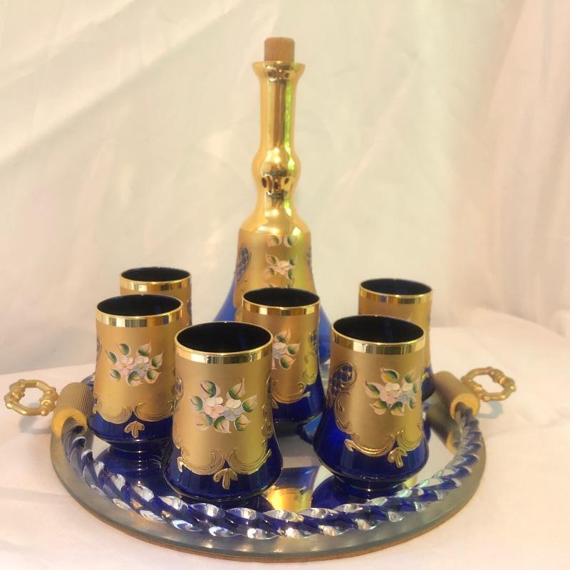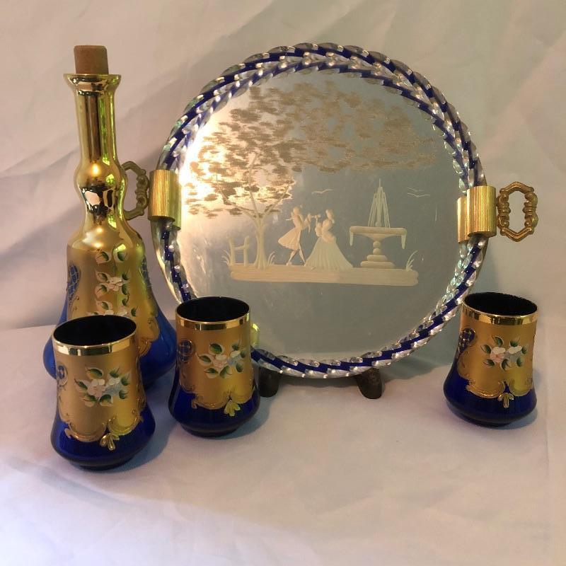 Lovely Decanter with six hand painted blue glass cups by Murano Glass. According to the family, they were purchased in Italy in 1975. Decanter has cork stopper. Lot also includes gorgeous mirrored tray. Mirror appears to be etched but has a smooth surface. Rim around the tray appears to be acrylic. Shipping available. Tray is 15” diameter at tray handles. Decanter is 12” tall