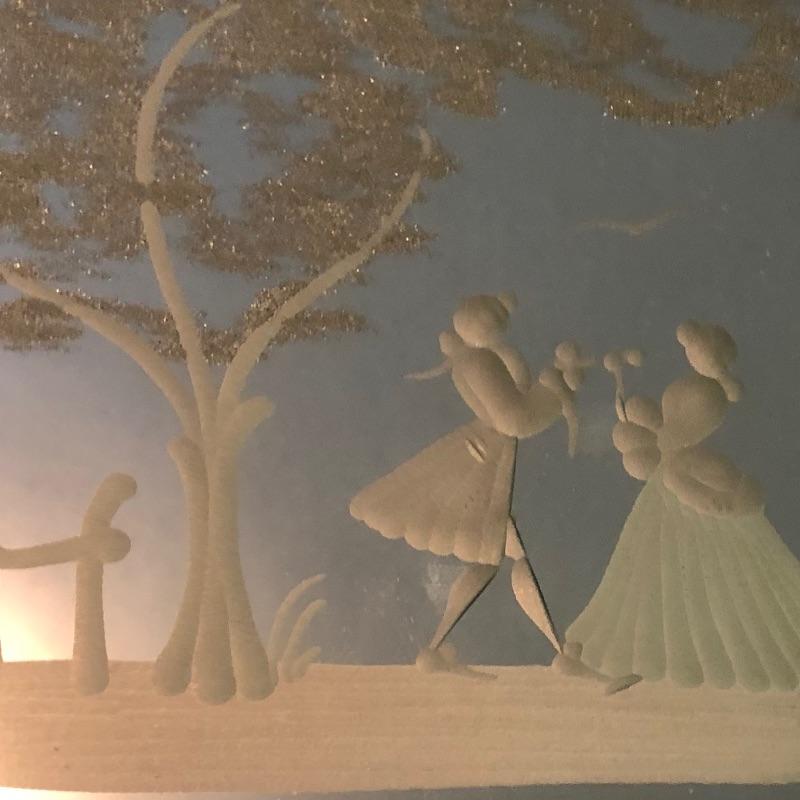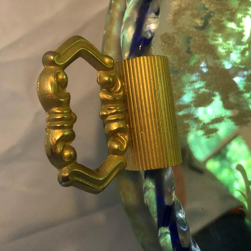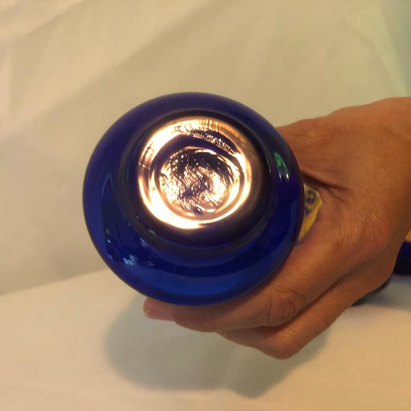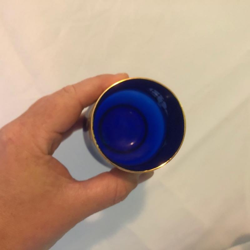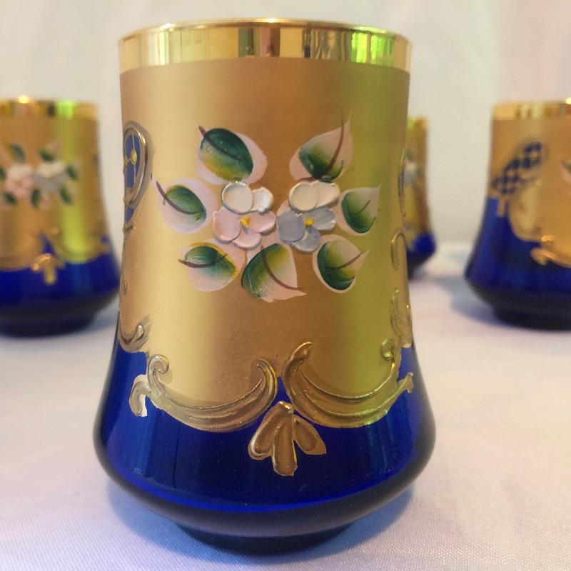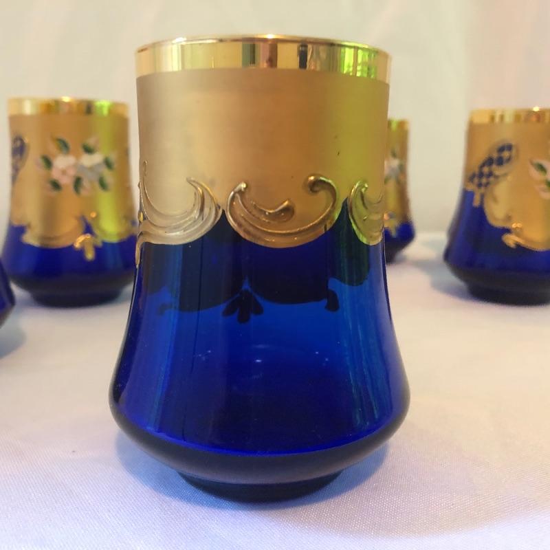 Lovely Decanter with six hand painted blue glass cups by Murano Glass. According to the family, they were purchased in Italy in 1975. Decanter has cork stopper. Lot also includes gorgeous mirrored tray. Mirror appears to be etched but has a smooth surface. Rim around the tray appears to be acrylic. Shipping available. Tray is 15” diameter at tray handles. Decanter is 12” tall