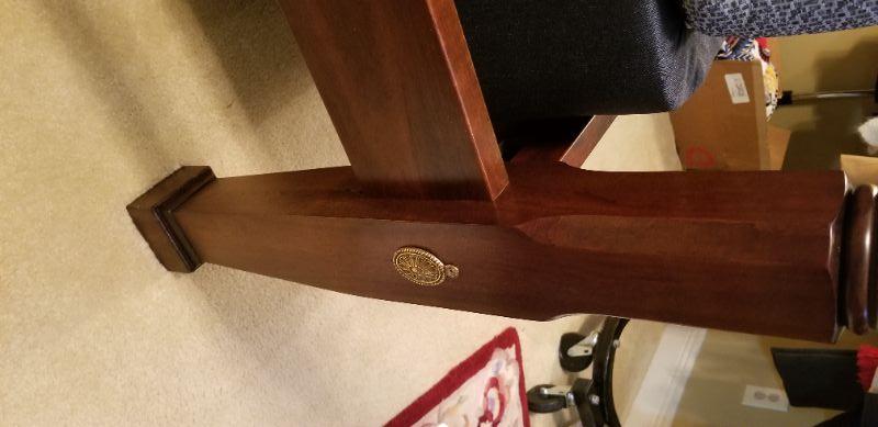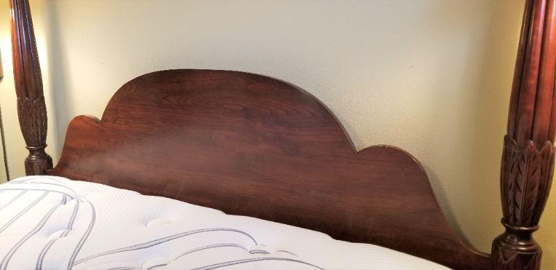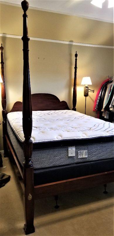 This beautiful bed is handcrafted by the Stratton furniture company - classic four poster Queen with super clean Serta Perfect Sleeper pillow top mattress. It's tall - you will need some bed steps to climb into it. Headboard 65.75 inches wide, it's 88" tall, 88" long. Mattress is 3.5 feet off the floor. Very nice.