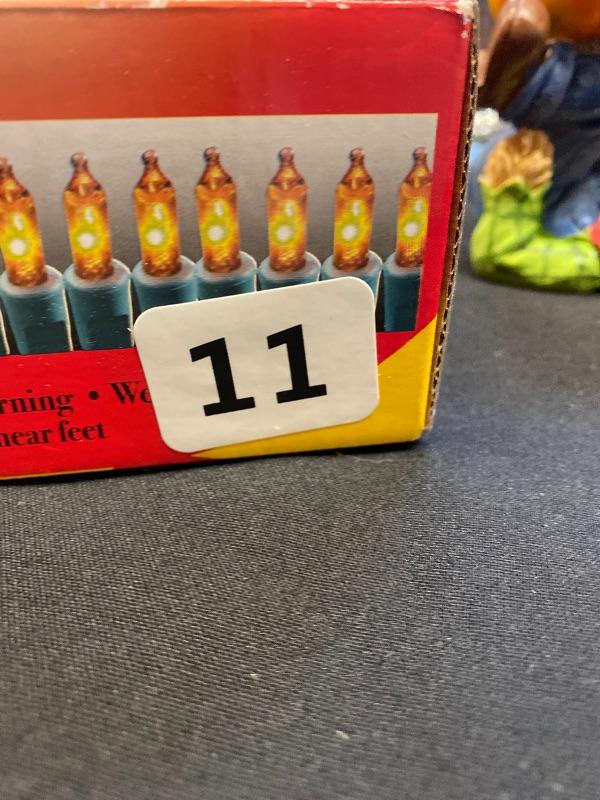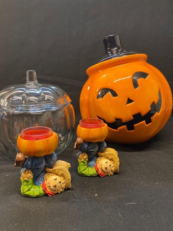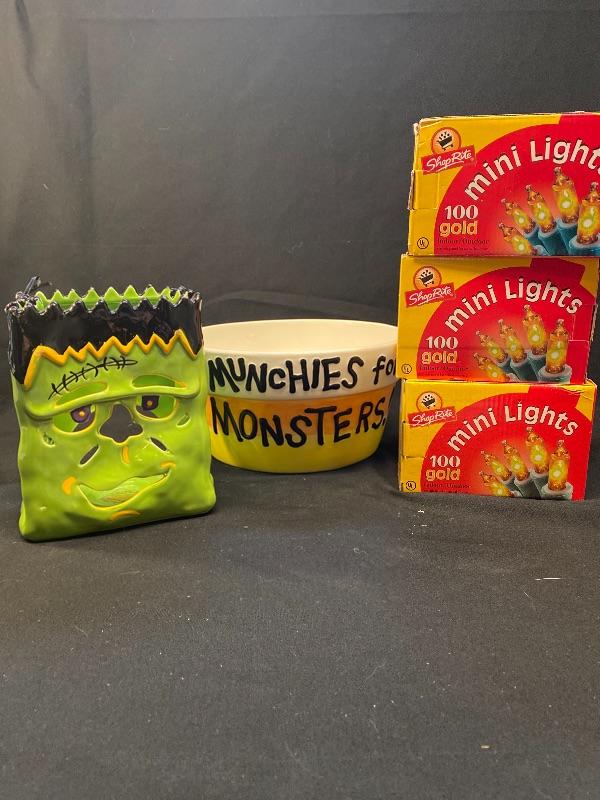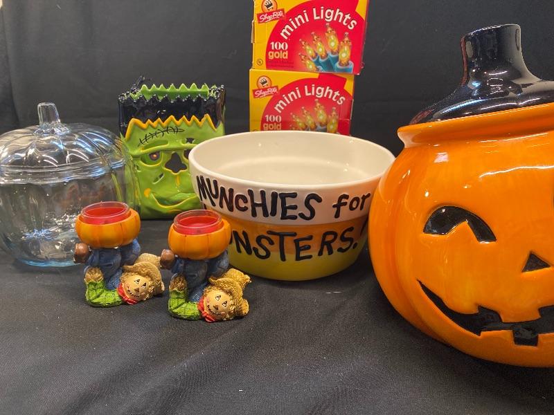 Pumpkin cookie jars, gold mini lights, scarecrow candle holders, large can’t bowl and Frankenstein head.