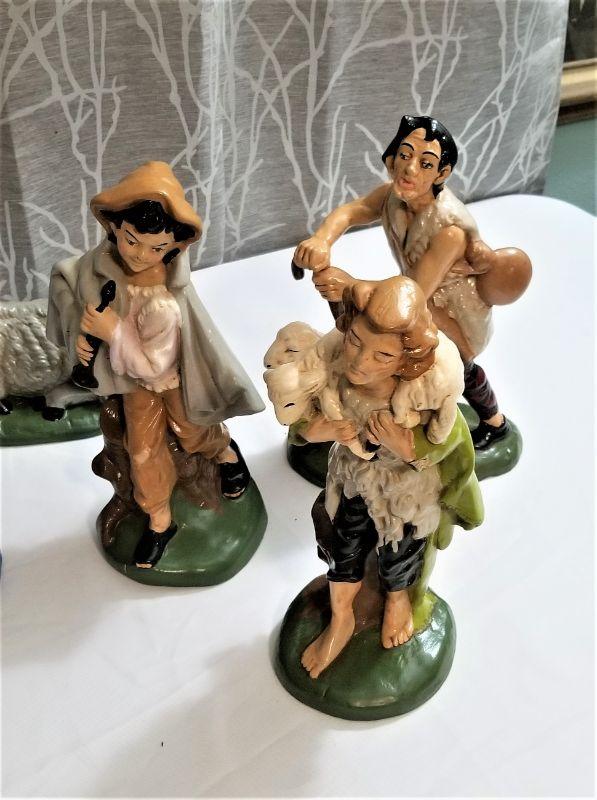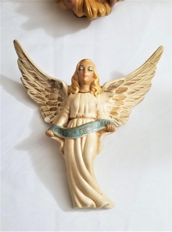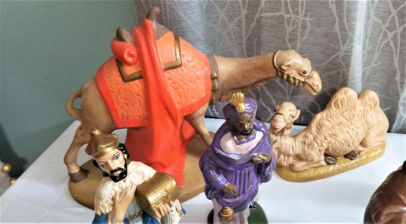 This vintage ceramic Manger scene is one for the ages...check out the groovy blue eye shadow on the Virgin Mary and the angels and the Brontosaurus-like camel! Circa 1970's - no creche, just the figures. Big Camel has a chip on the back of the base, Angel made to hang on the front of or above the manger has had a wing-tip repair (common in these older sets). To get an idea of scale, the Black King stands 12" tall and the Shepherds average 11" tall. What you see is what you get.