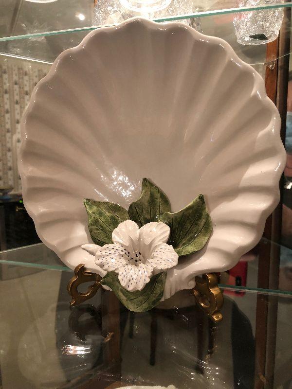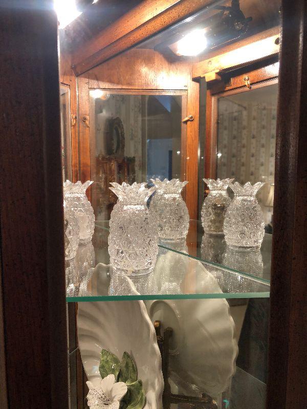 Lighted Corner Curio (4 Glass Shelves), 4 Shannon Crystal Pineapple Salt & Pepper Shakers, Ardalt Pottery (made in Spain) and Other Fine Collectibles and Wall Art. Plate Stand is not included.