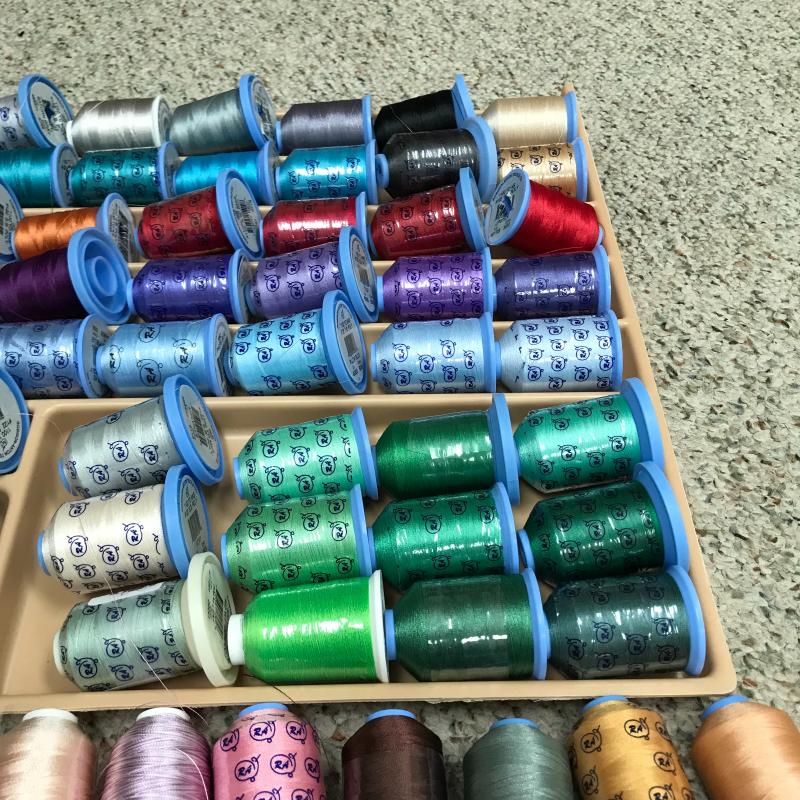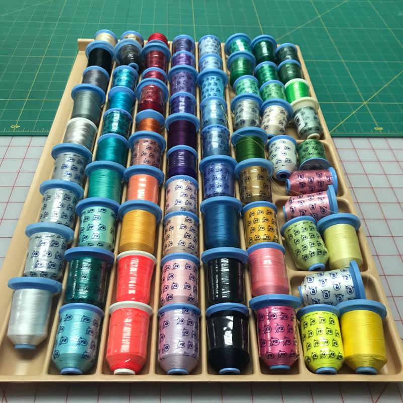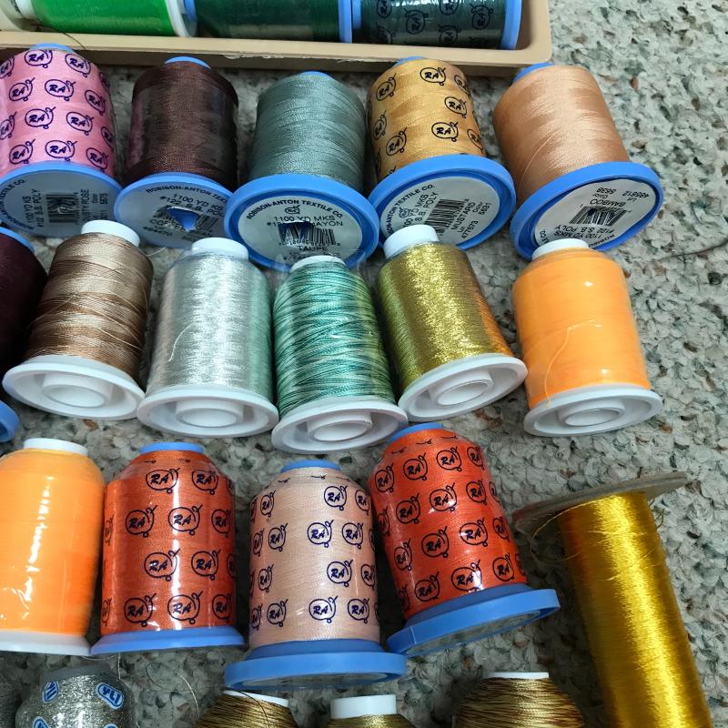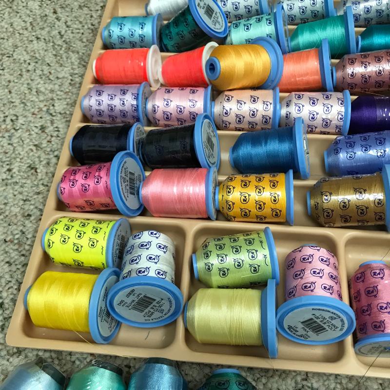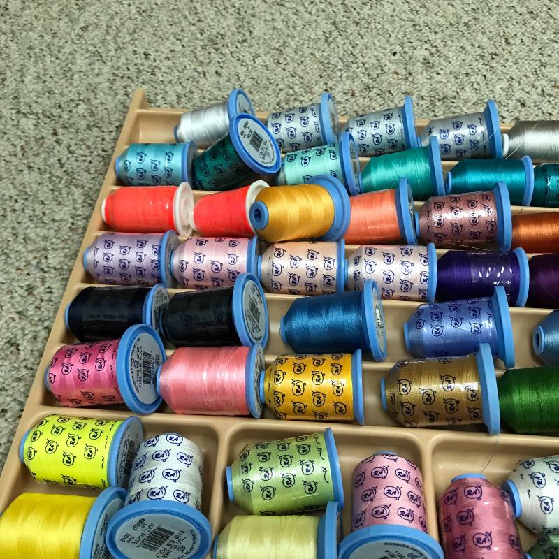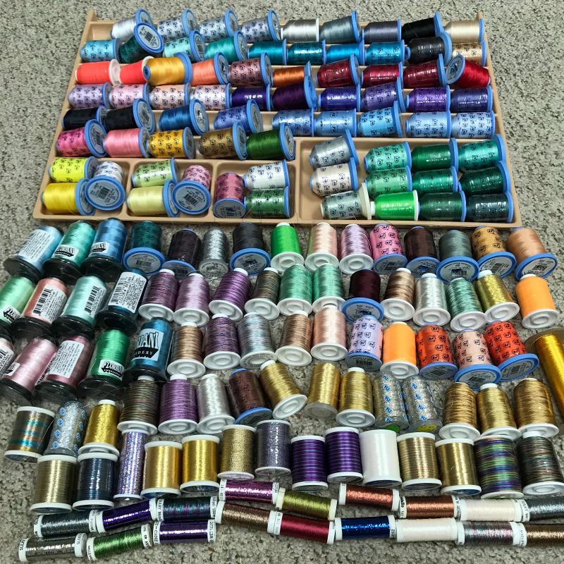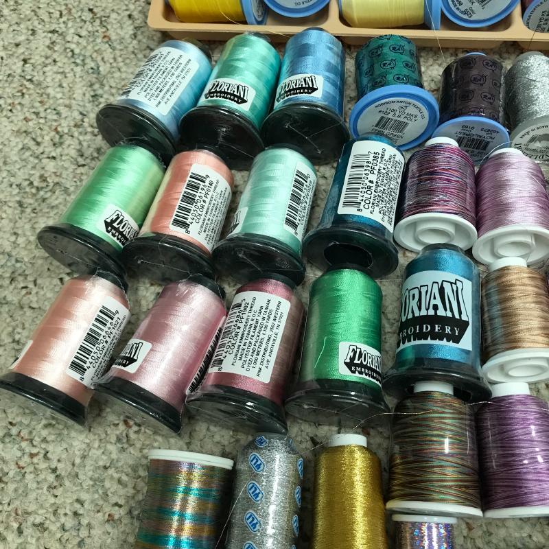 Lot includes dozens of small spoils of machine embroidery thread. Many still have packaging. Many different colors. See photos. Tray not included. Shipping available.