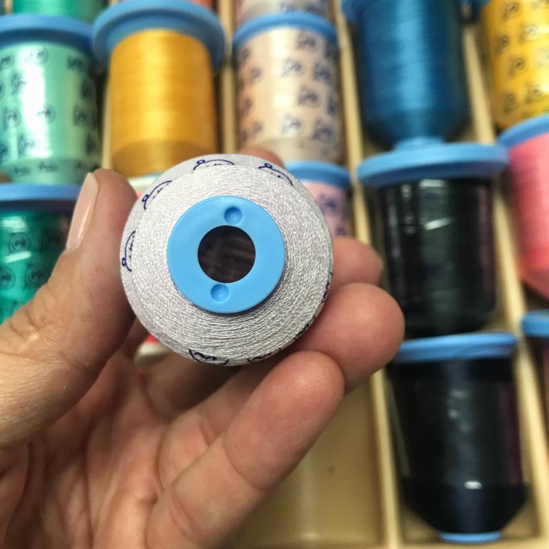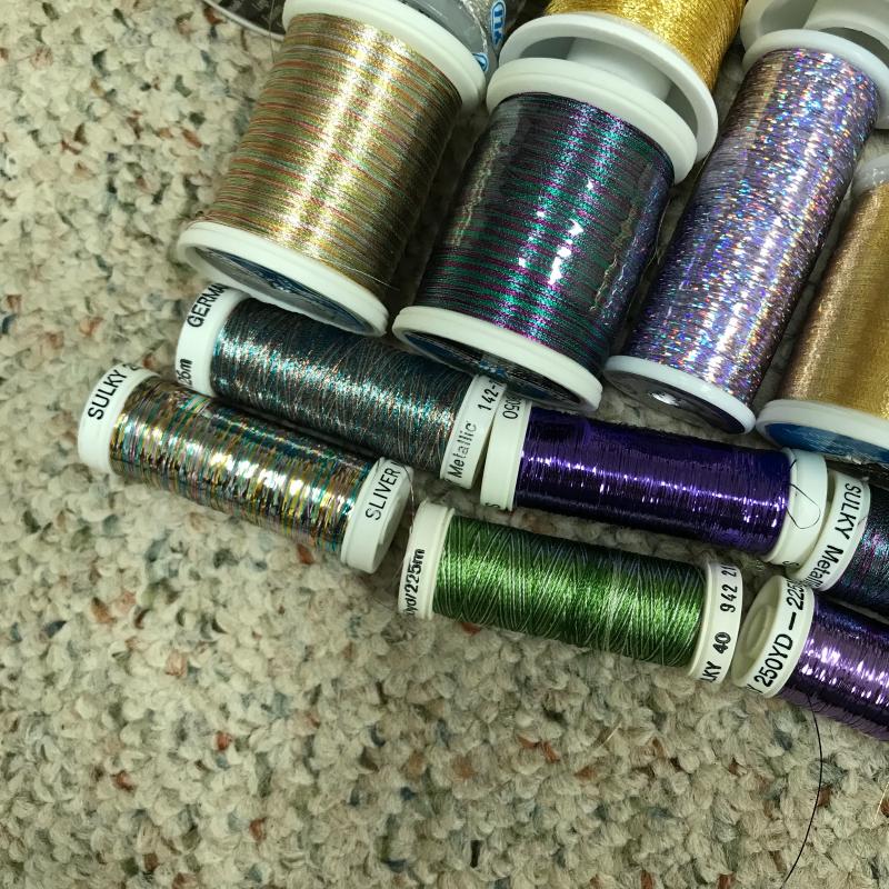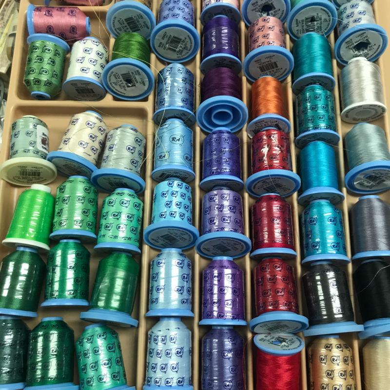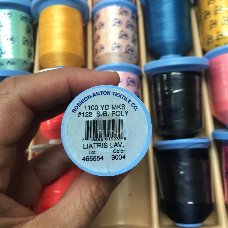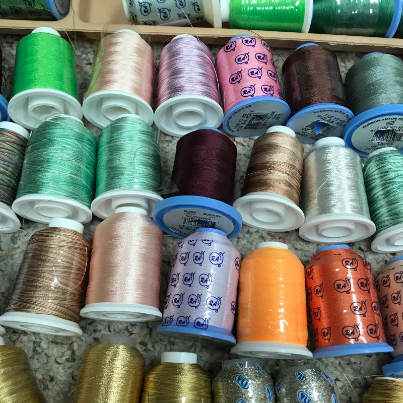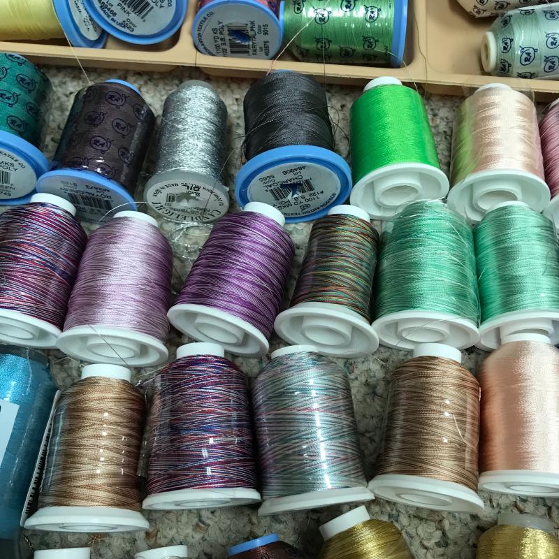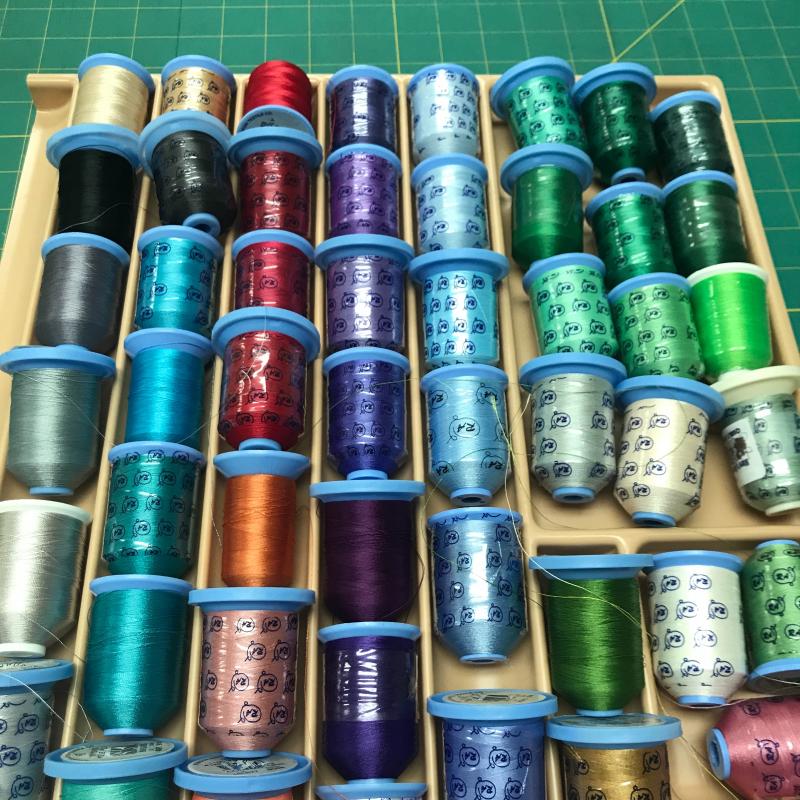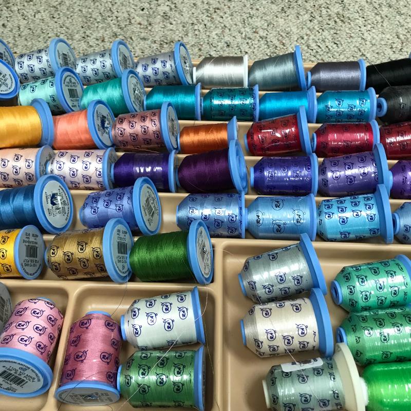 Lot includes dozens of small spoils of machine embroidery thread. Many still have packaging. Many different colors. See photos. Tray not included. Shipping available.