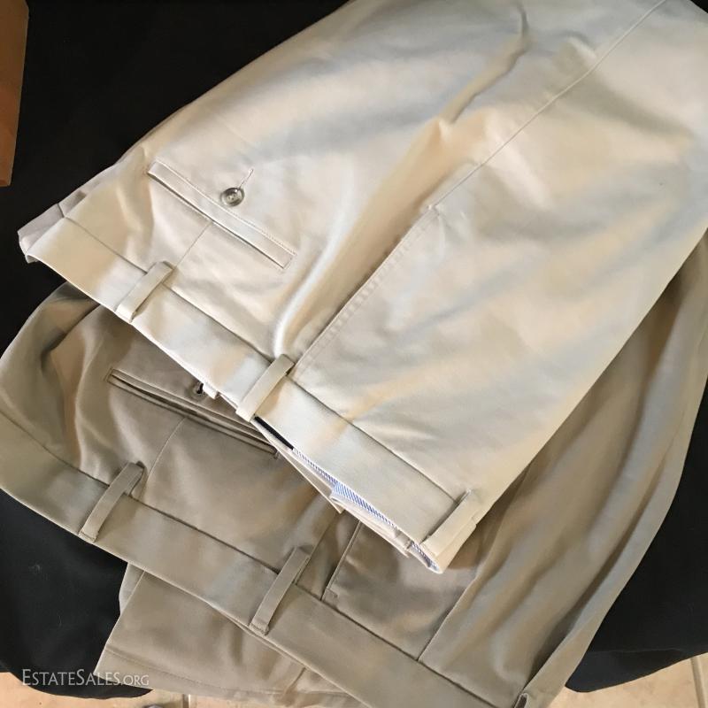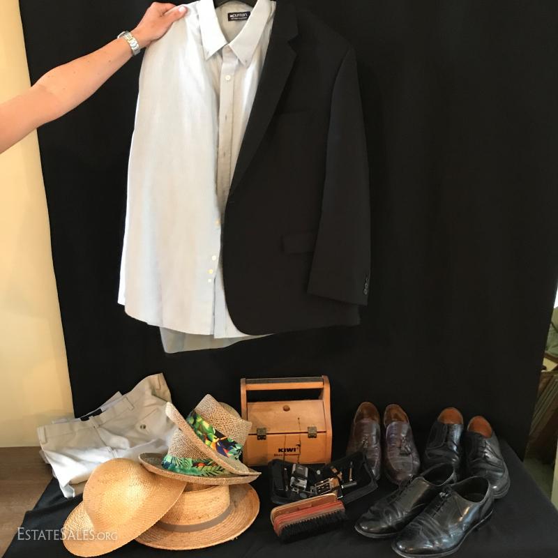 Clothing and kits. Includes two like-new trousers that are 38x32 and 42x32. Croft & Barrow Jacket R50. Three pairs of shoes size 13D. Shoe shine kit and bathroom kit. Three hats (two Panama Jack). Shipping available or local pick up In Flat Rock, NC.