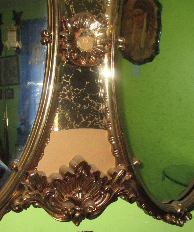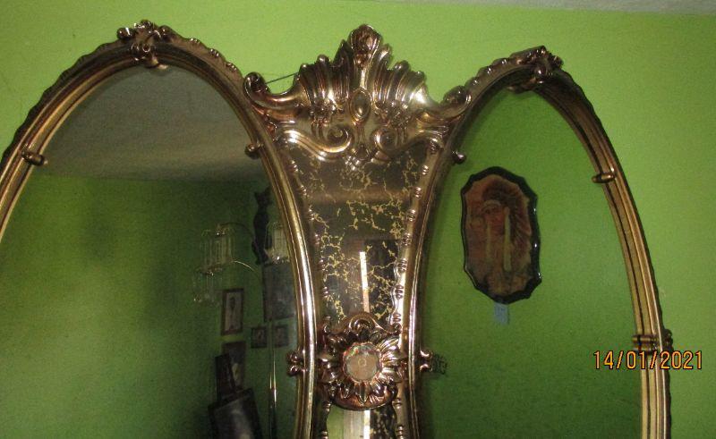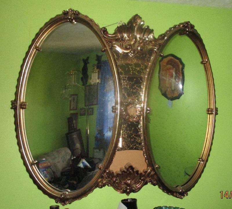 This mirror is a conversation starter! The side mirrors are angled so that it really will show all parts of the room as well as reflect light throughout the room. There is damage to the mirror in the center piece, but that should be either fairly easy to replace or to put something else there instead of a mirror. It has a plastic casing so the heavy part is the mirror, not the frame. It is about 45" tall and 58" wide.