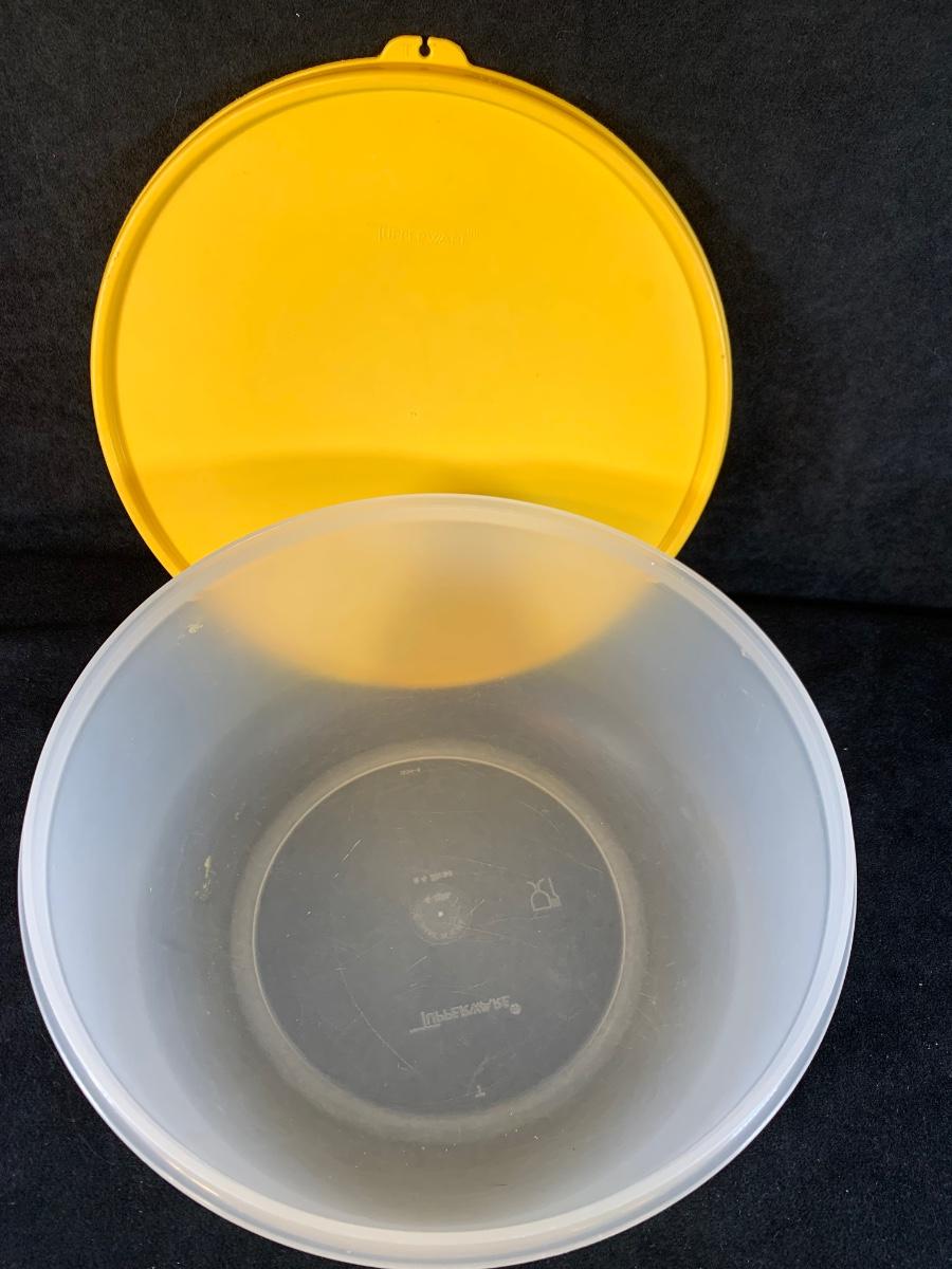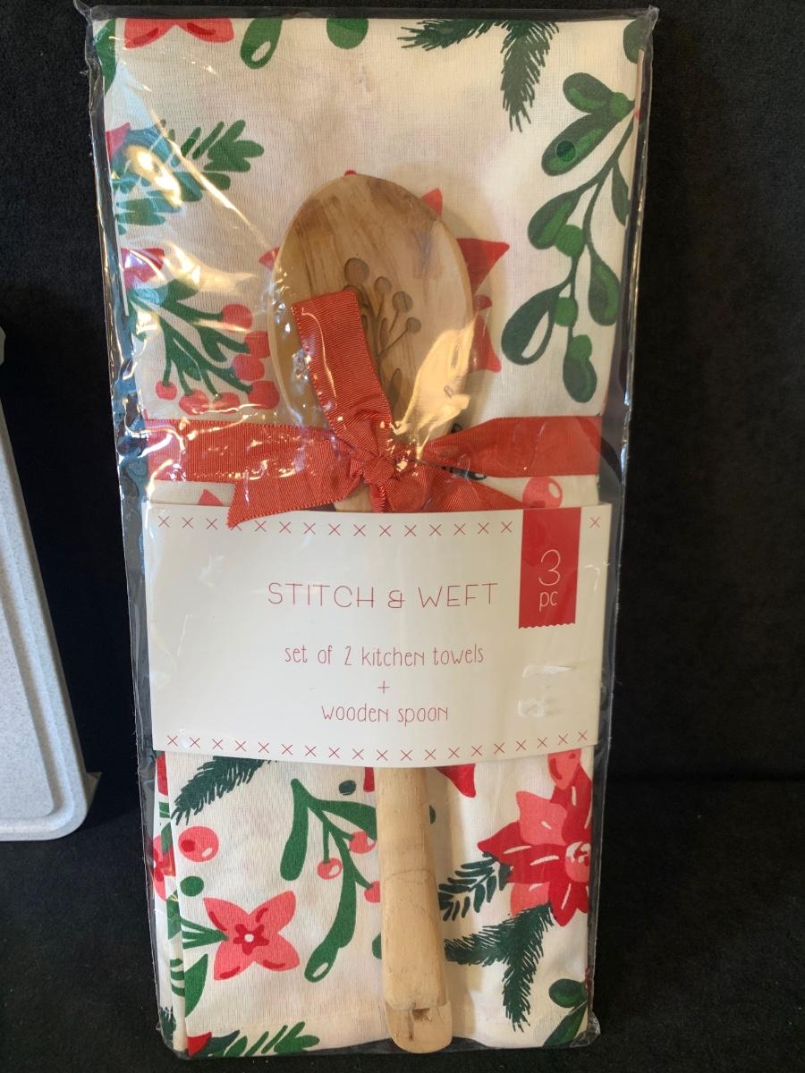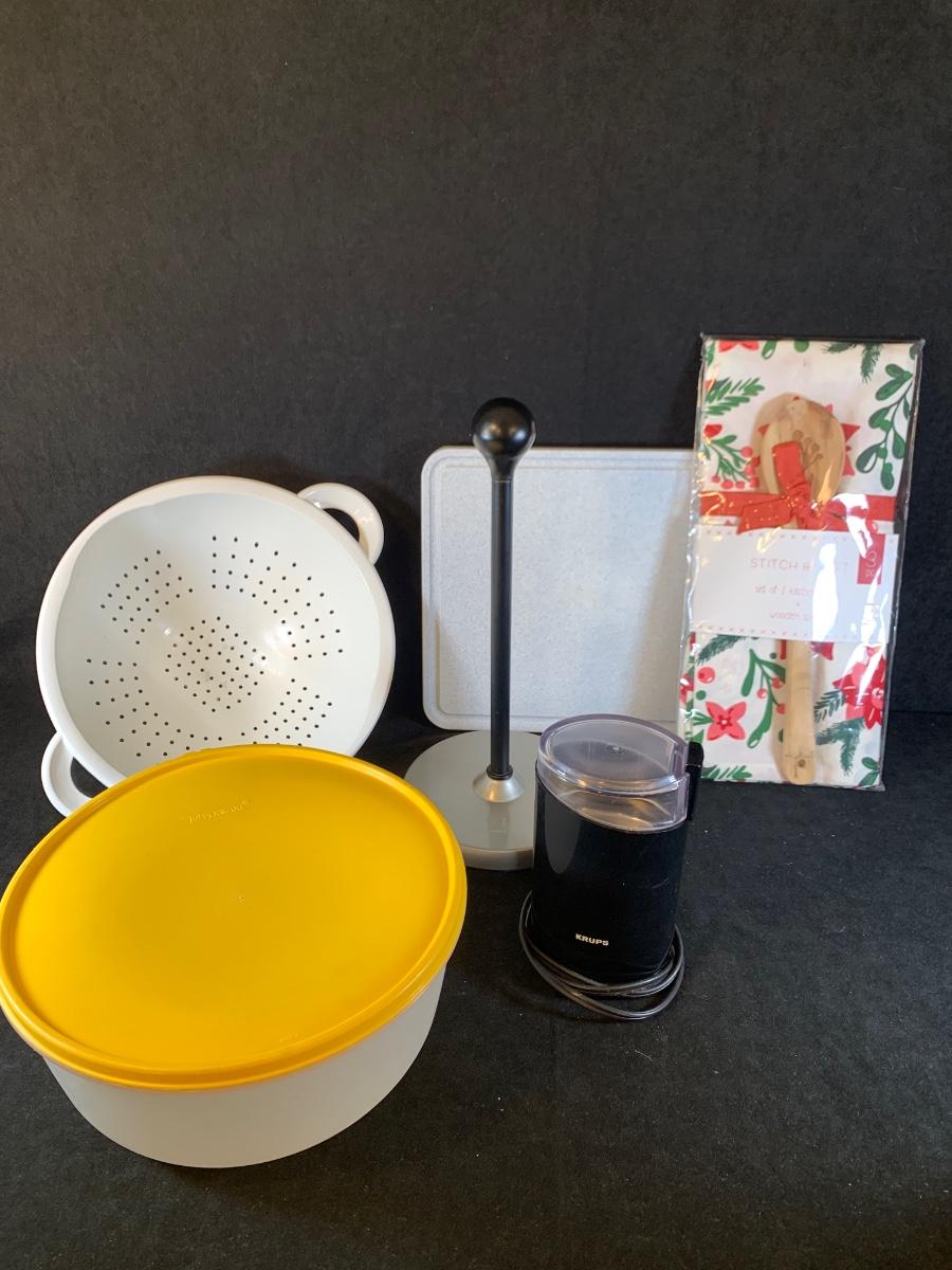 Includes plastic strainer, plastic cutting board, Tupperware bowl, Krups electric coffee grinder, paper towel holder and set of brand new in packaging Christmas towels with a wooden spoon.