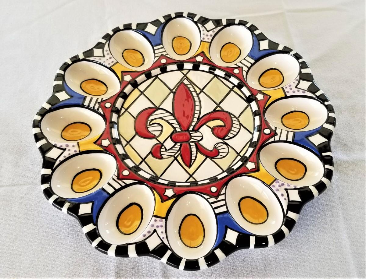 Cool New Orleans themed Devilled Egg dish - bright and colorful. 11.5" across, like new.