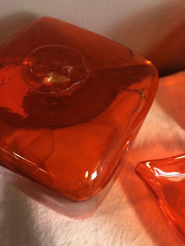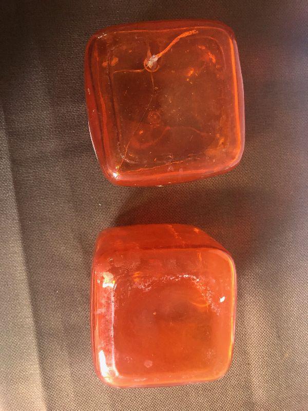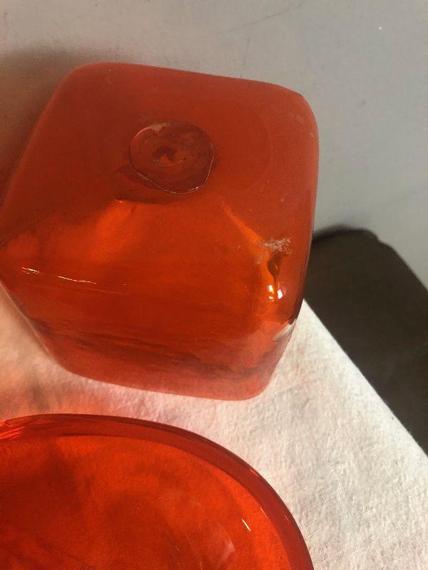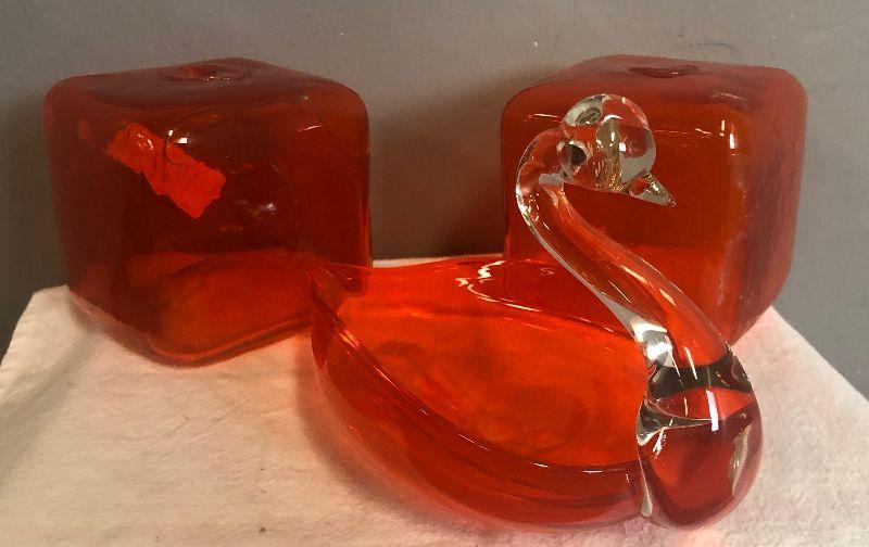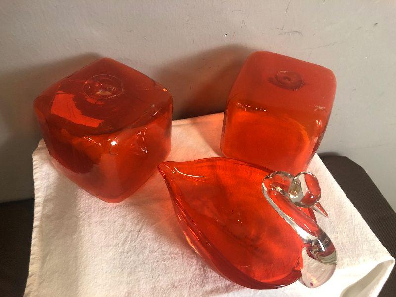 2 glass cubes one is cracked, 4" square, swan in good condition.