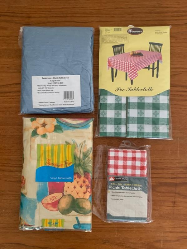 4 Vinyl Tablecloths - all new and unopened. Red /white checks, 54” x 72” rectangle, Blue Basket Weave, large round fits 45” - 56” diameter, Summer Fruit, oblong 60” x 84,” Green /white checks, oblong, 52” x 70.”