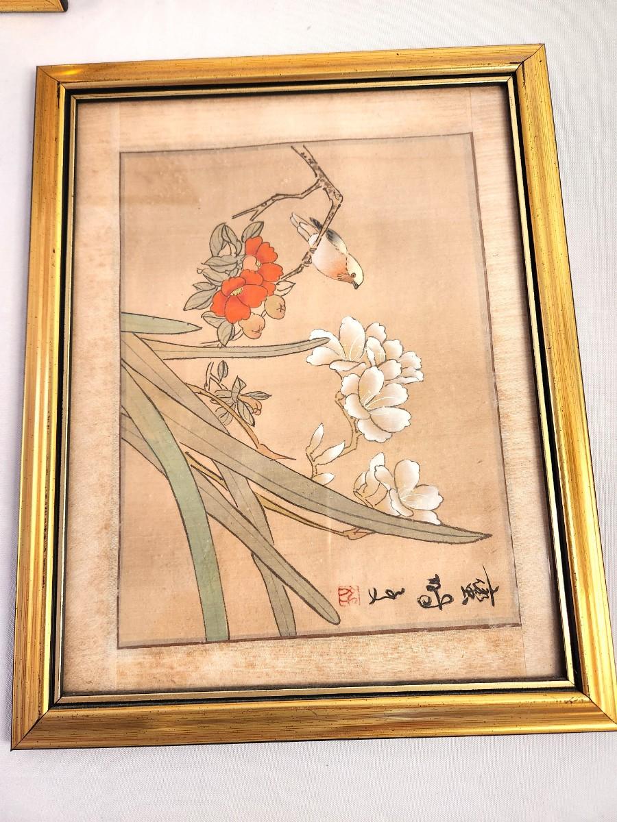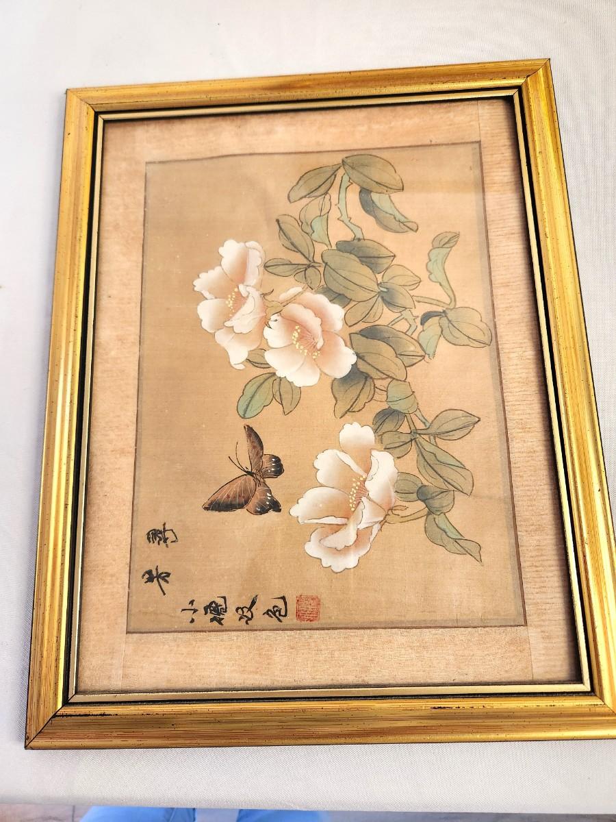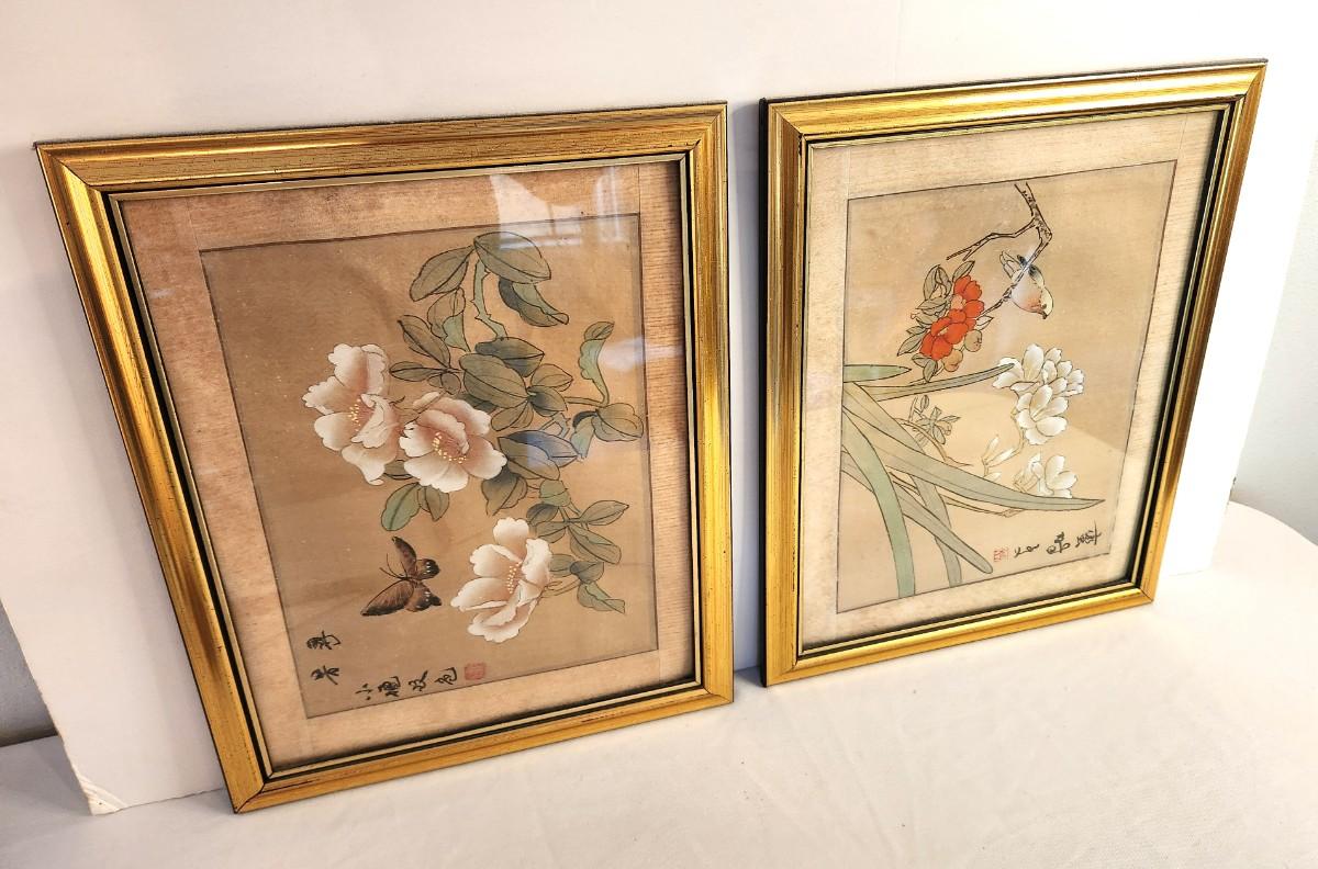 Nice Pair of floral paintings on silk, in the Asian Style. Framed. 12" x 14.5".