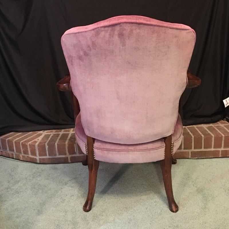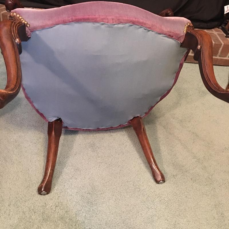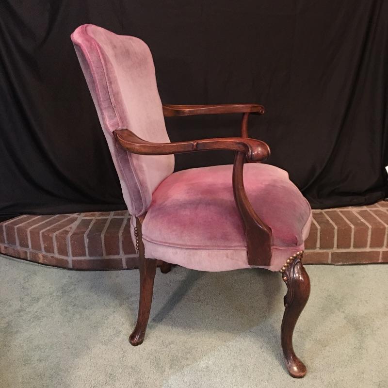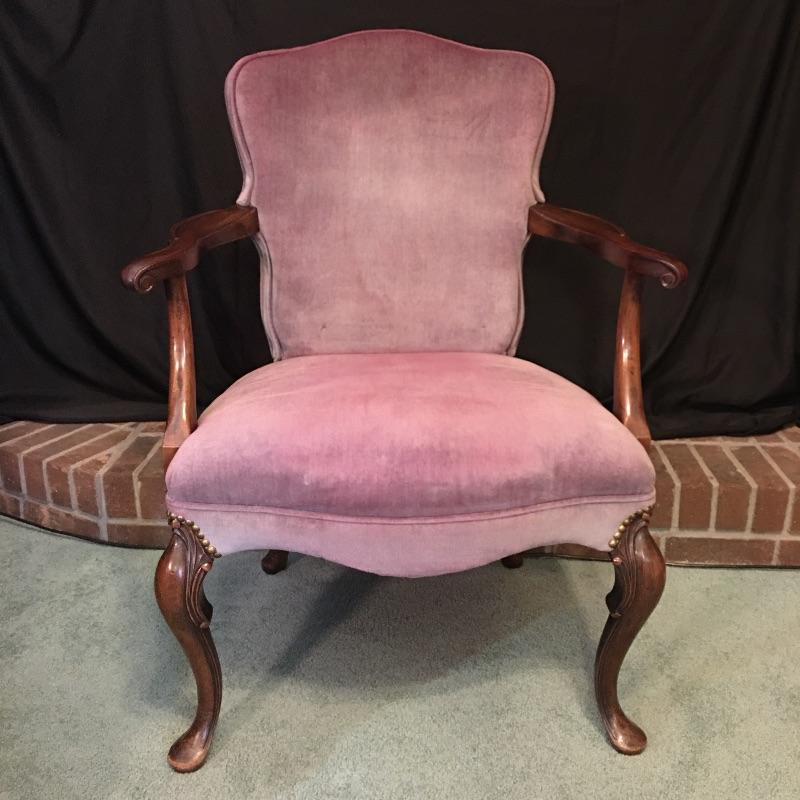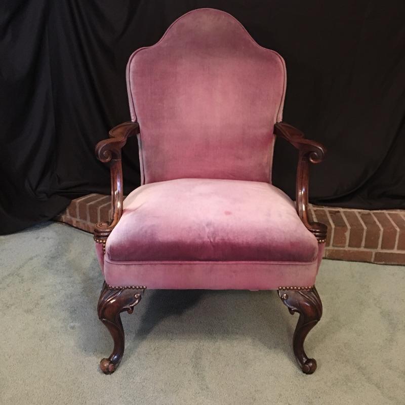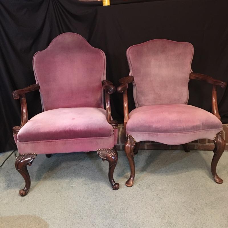 These two purple armchairs are a must see. Sturdy, quality antique chairs with fabulous curved and carved arms and legs and what was once a deep red upholstery, now faded to mauve; some might say the color has improved with age! This pair of comfortable reception chairs are in excellent condition.
