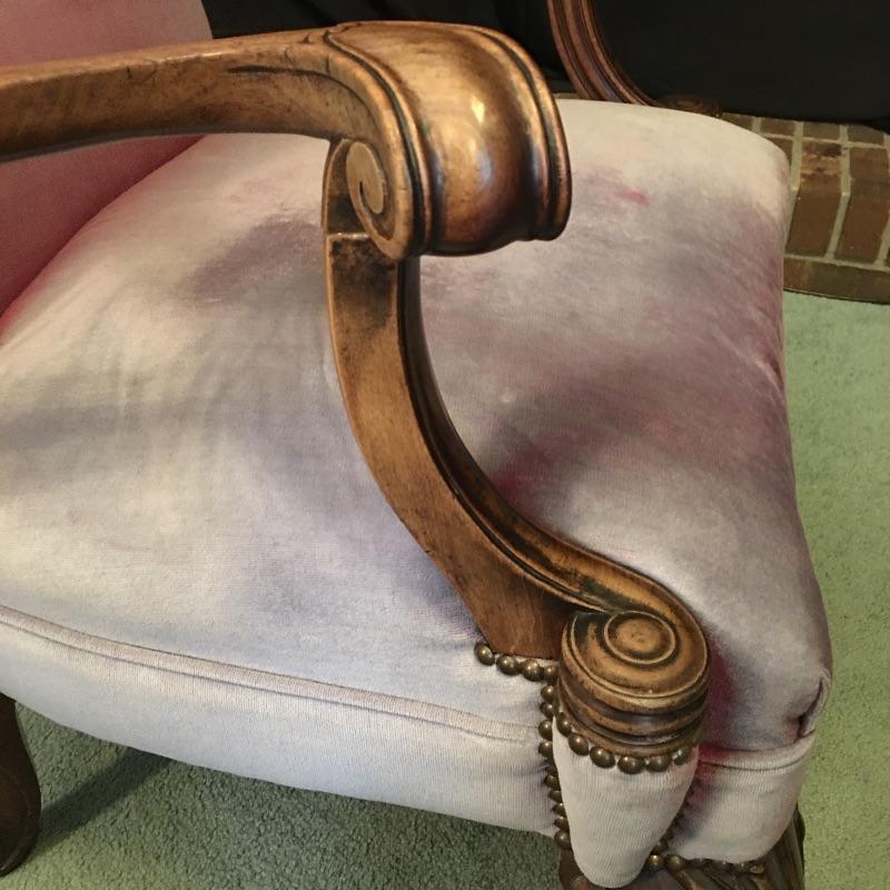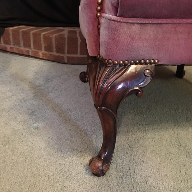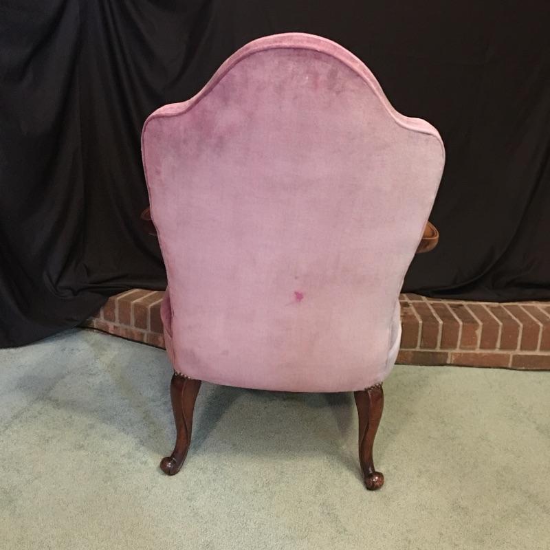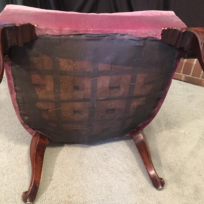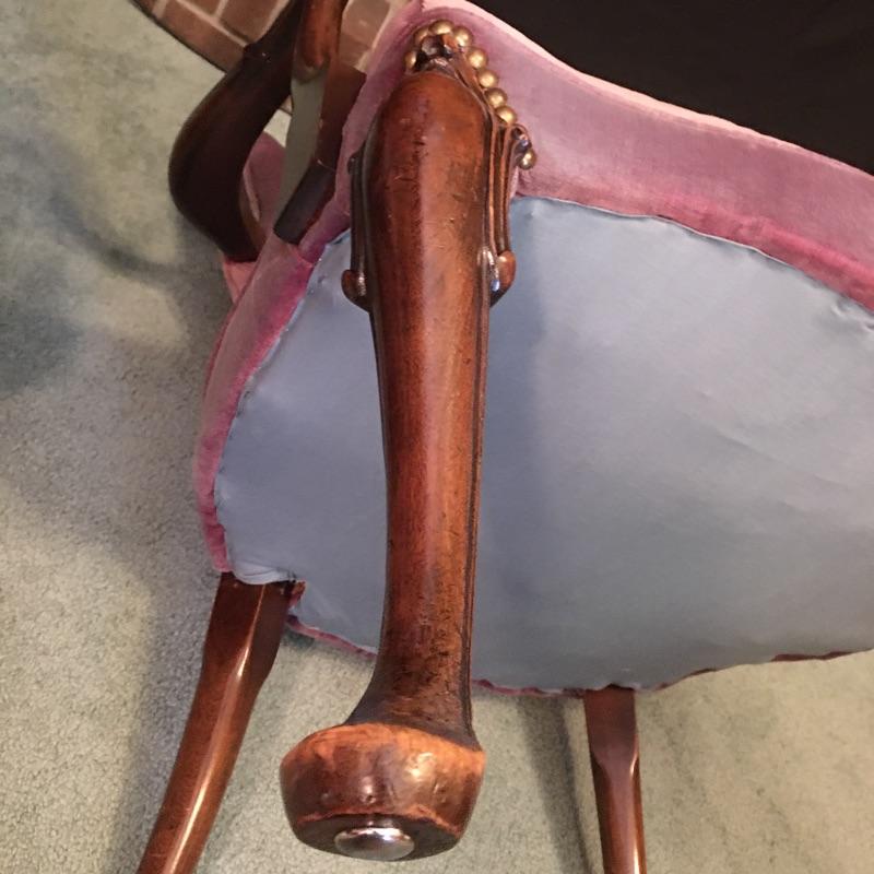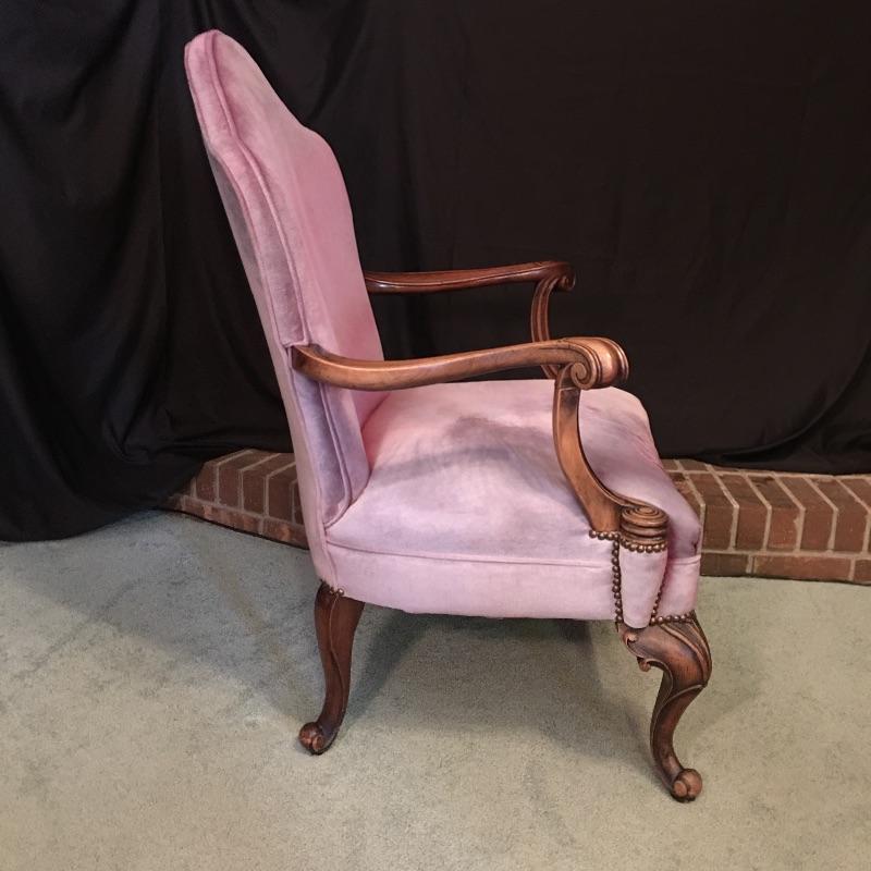 These two purple armchairs are a must see. Sturdy, quality antique chairs with fabulous curved and carved arms and legs and what was once a deep red upholstery, now faded to mauve; some might say the color has improved with age! This pair of comfortable reception chairs are in excellent condition.