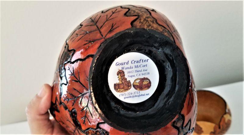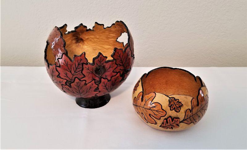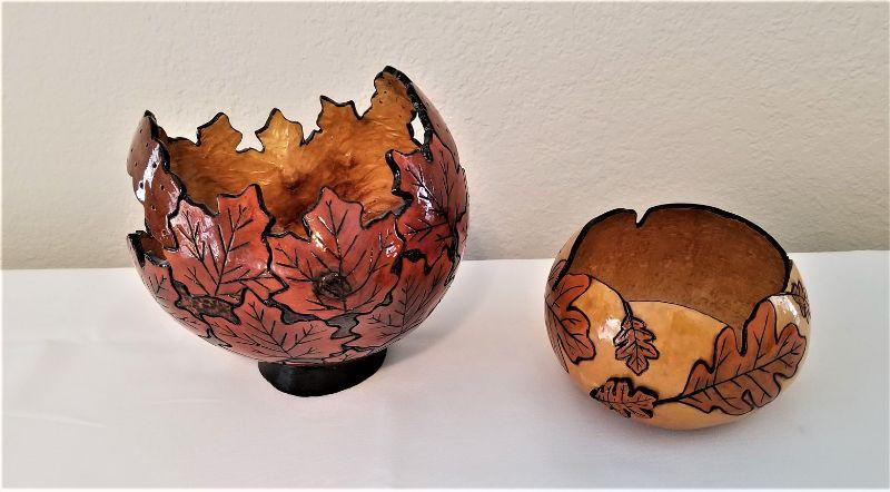 This pair of intricately hand-carved natural gourds is by a Napa, California artist, Wanda McCart. The largest is 6" tall and the smaller one 3.5" tall. Good condition.
