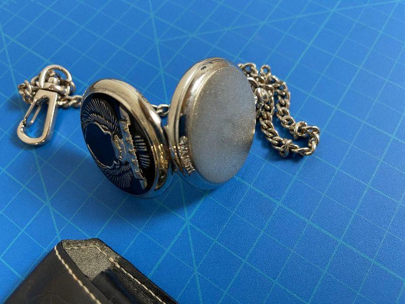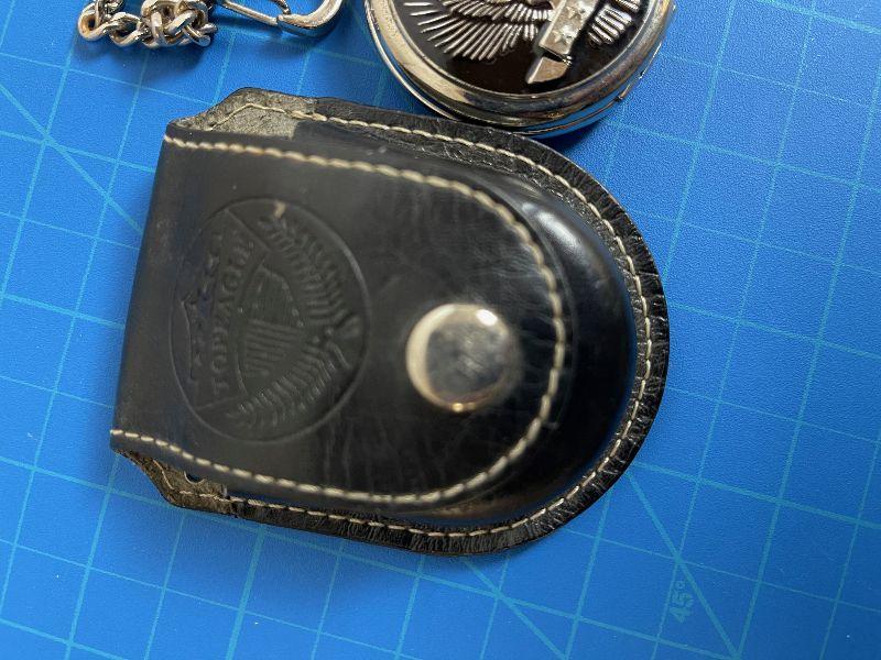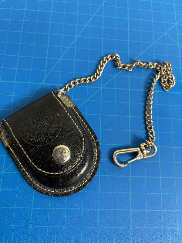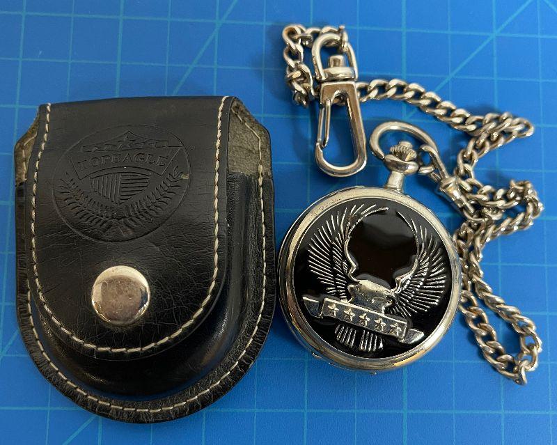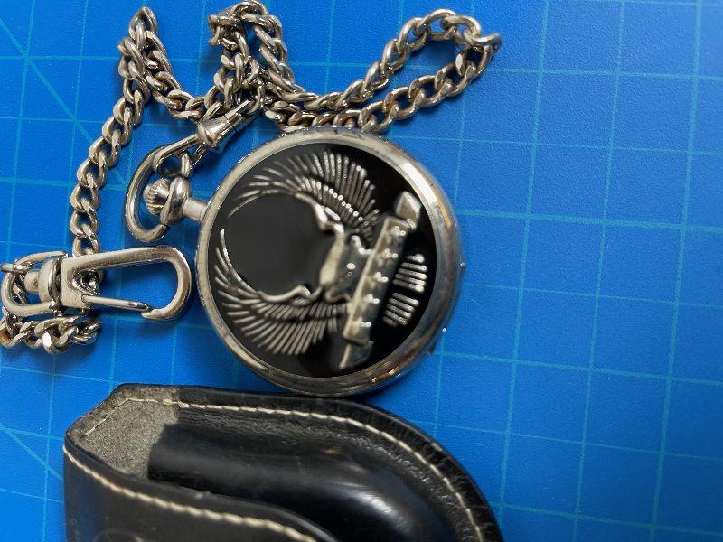 Has a Harley like Eagle, Called "Talk Eagle" With Leather Case and Chain.
