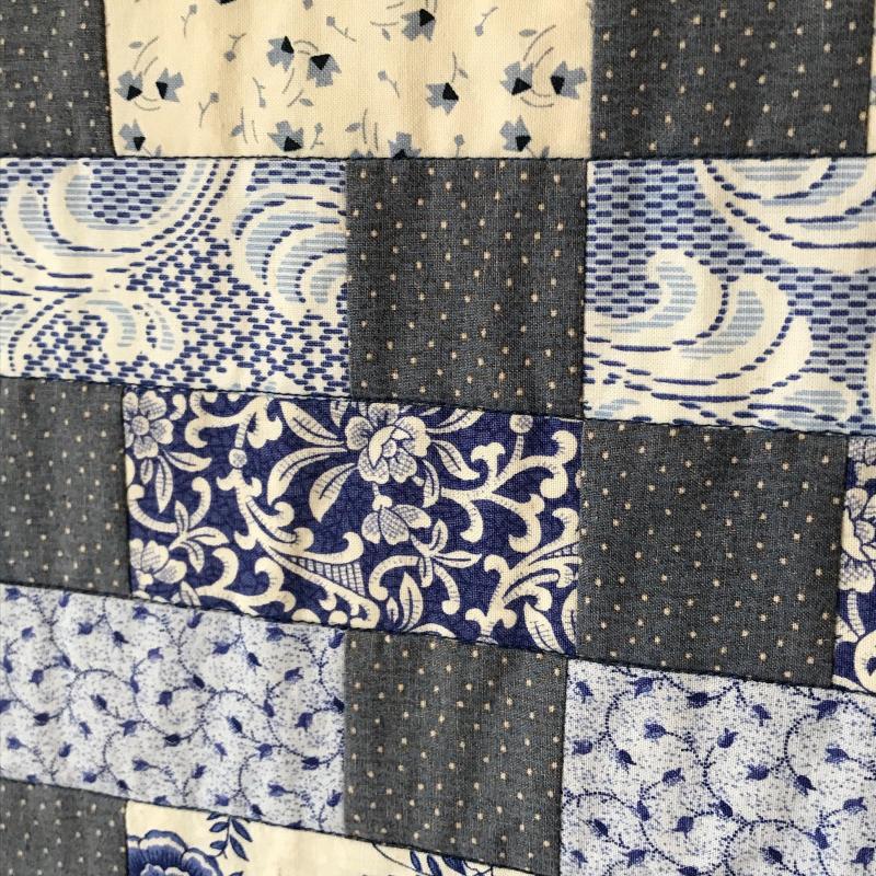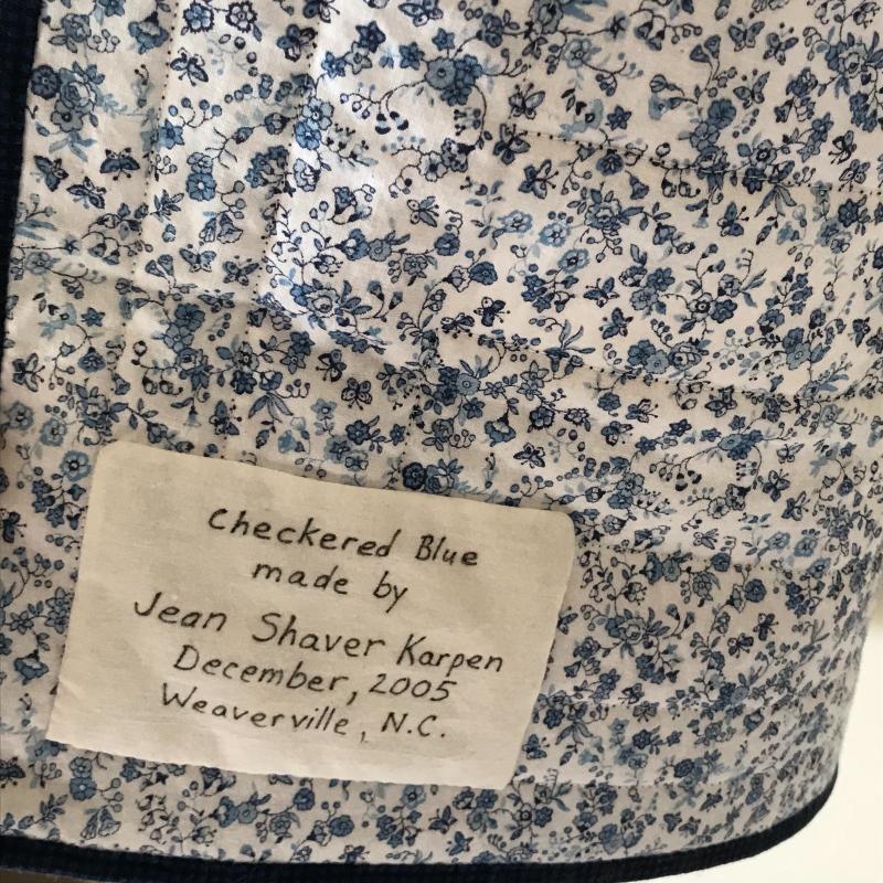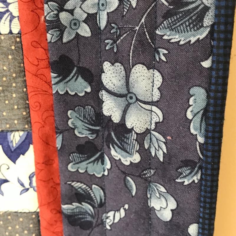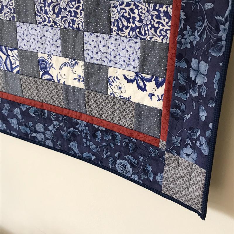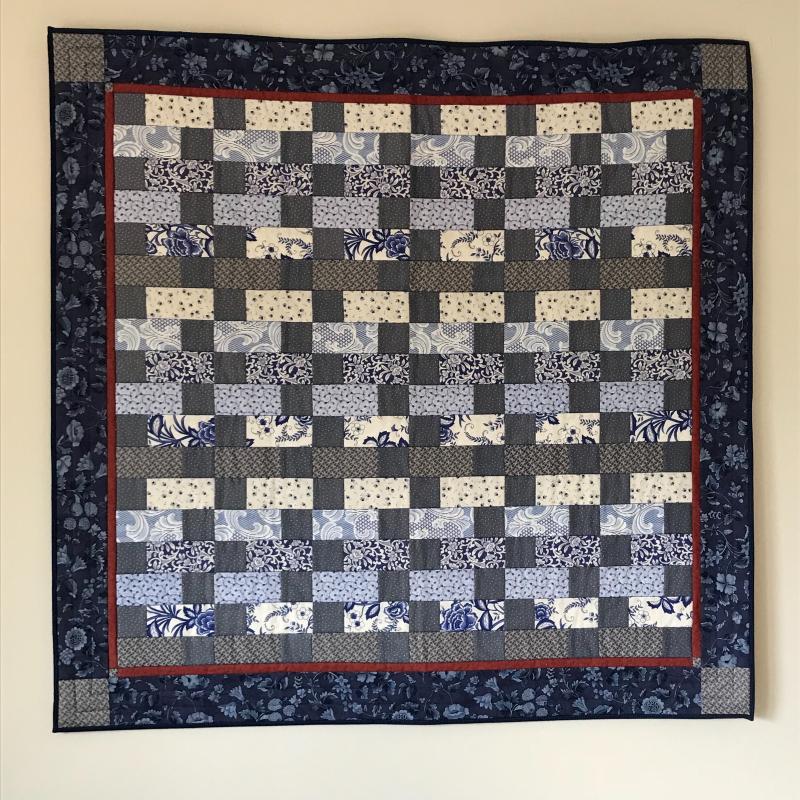 This beautiful quilted art piece is a floral patchwork of cream and blues. Approx. 39” x 38”, it can easily be hung using curtain rod and sewn-on curtain rod holder on the back. Shipping available.