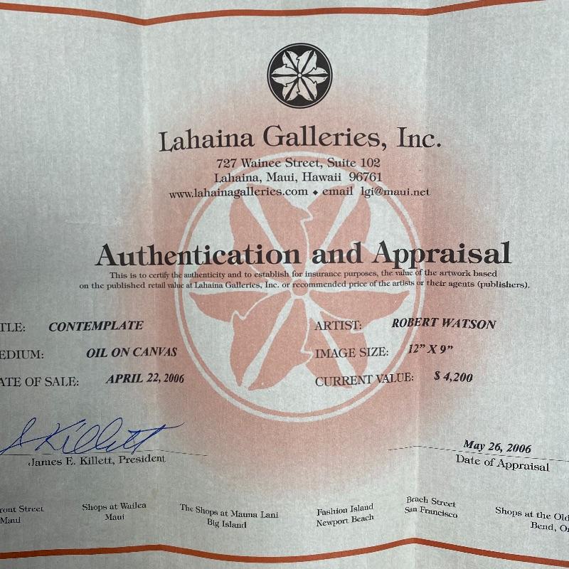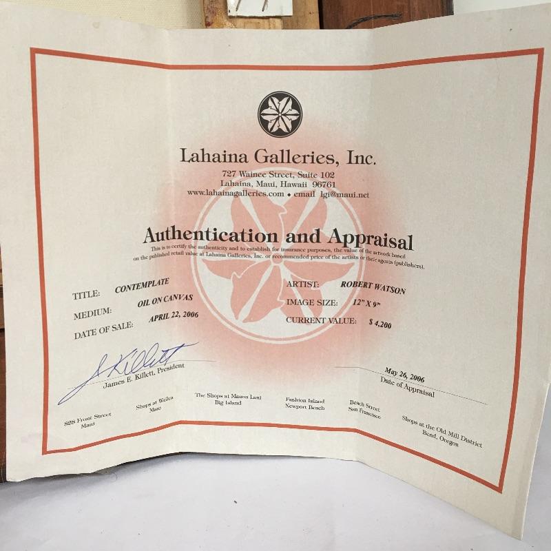 This signed and framed Robert Watson oil on canvas painting comes with a Certificate of Authentication and Appraisal from Lahaina Galleries. Frame measures 17” x 20” x 2.25”.
