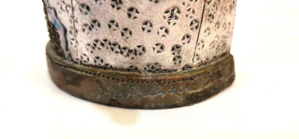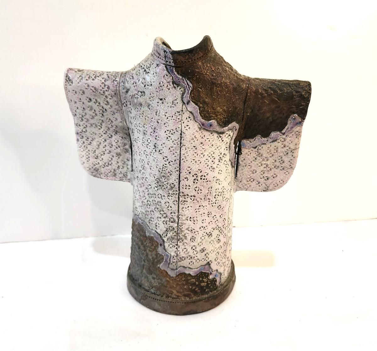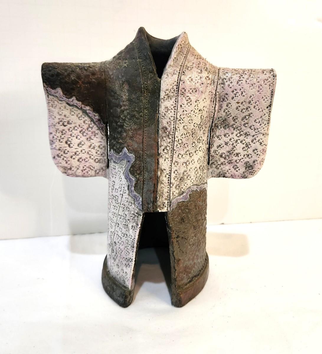 Contemporary art pottery - Roku - indistinct signature on bottom - in the form of a kimono. 9" tall, 8" across. Good condition.