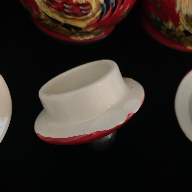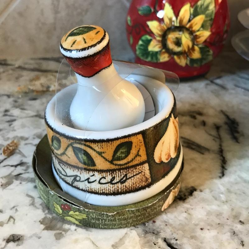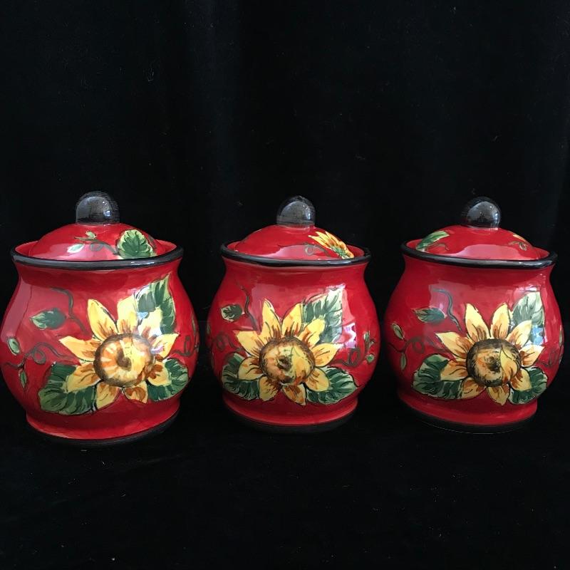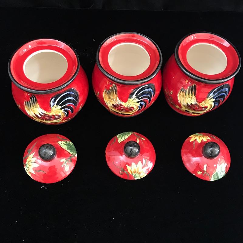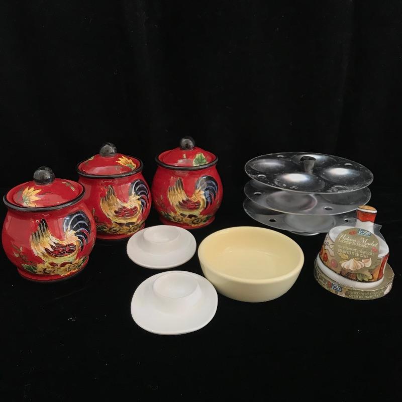 Fun pieces every kitchen needs! Three small bold King Rooster canisters by Maxcera standing about 5” high with sunflower accents. One lid is chipped underneath, see photos. Crack the perfect egg with Rosle’s egg topper! Lot also features a three tiered egg poacher, two small Kuchenprofi egg plates and a new garlic mortar and pestle. See photos. No shipping.