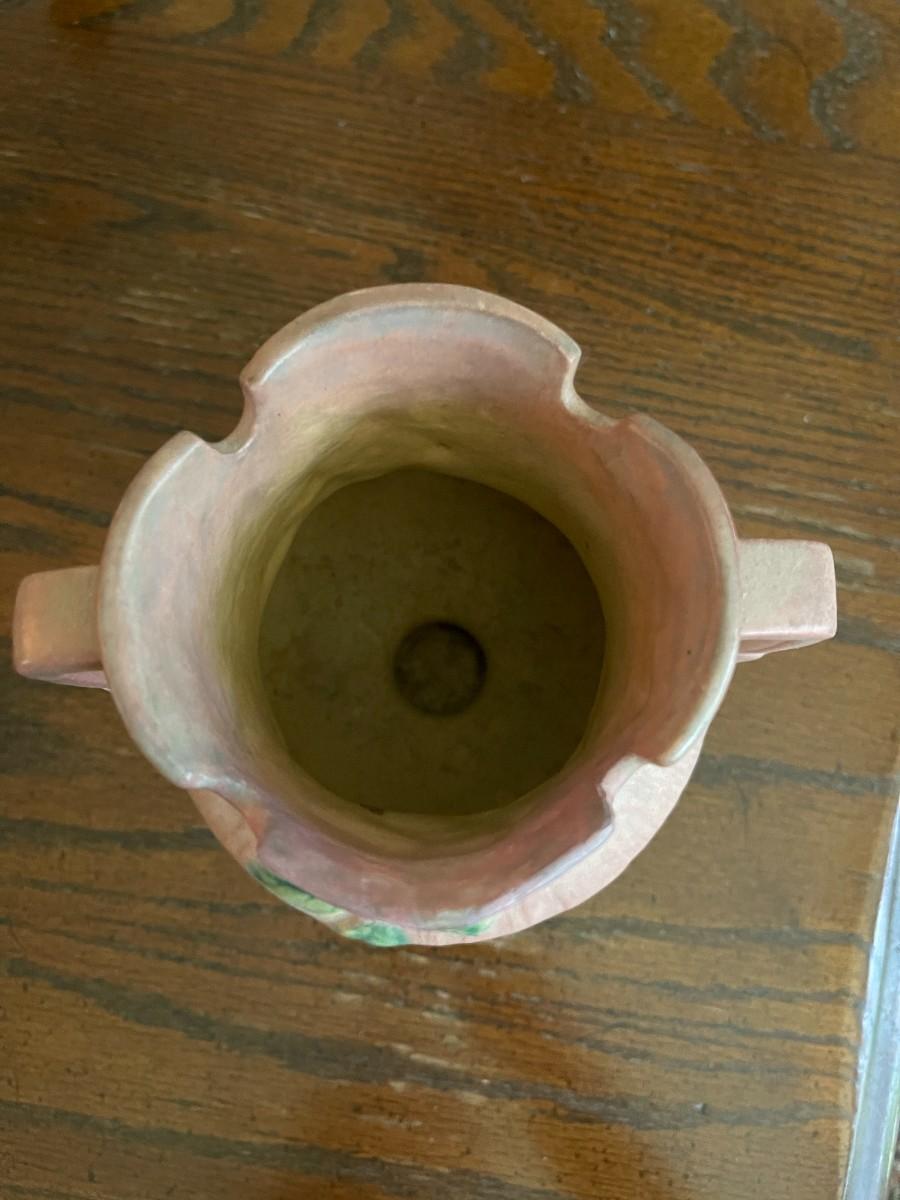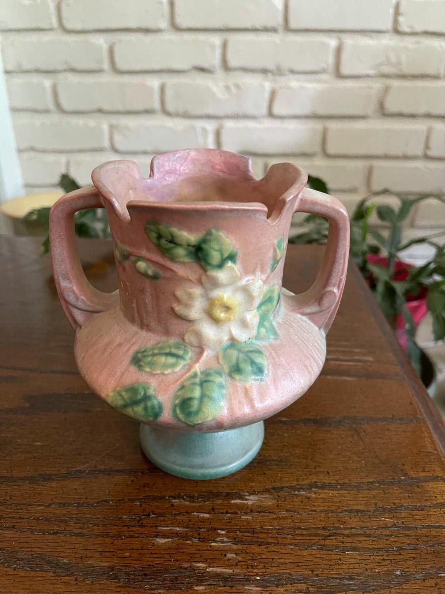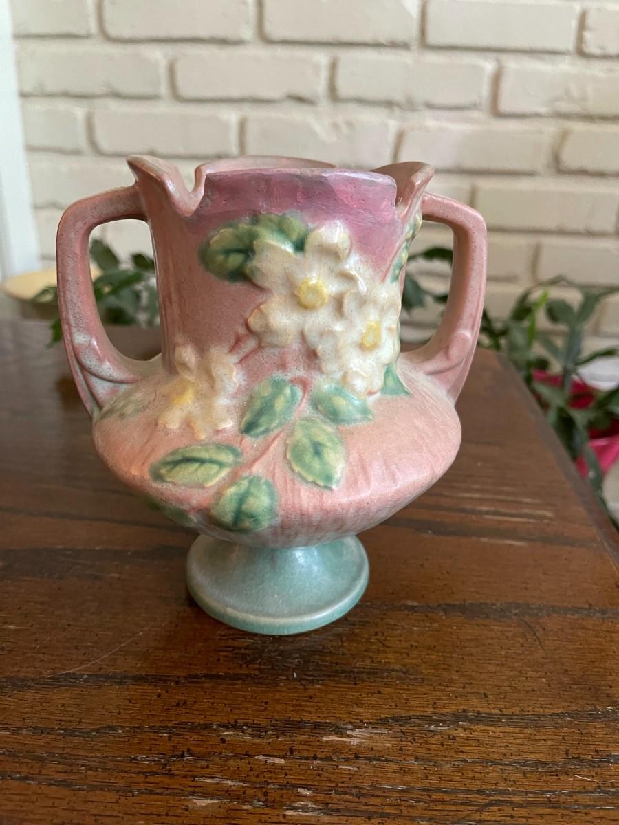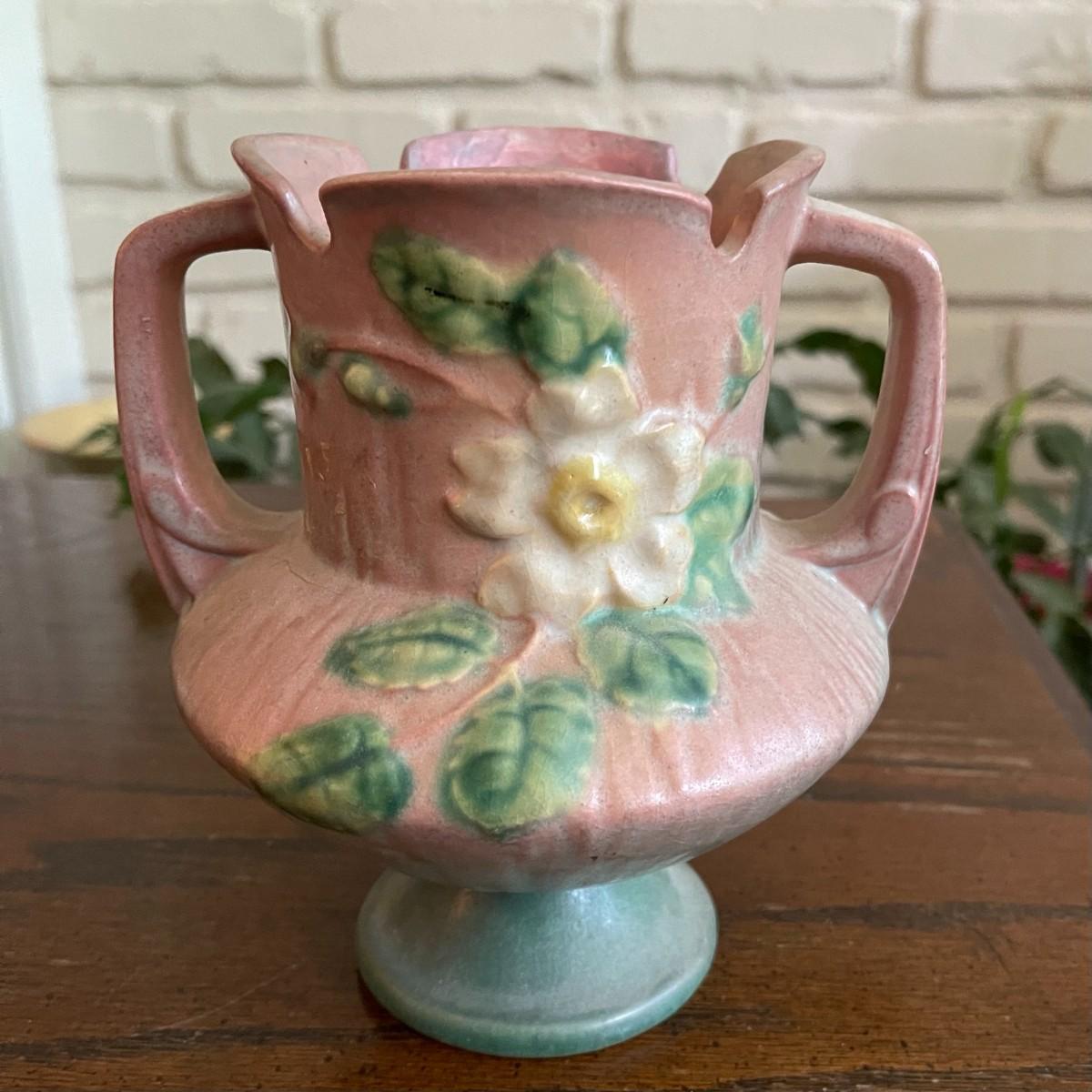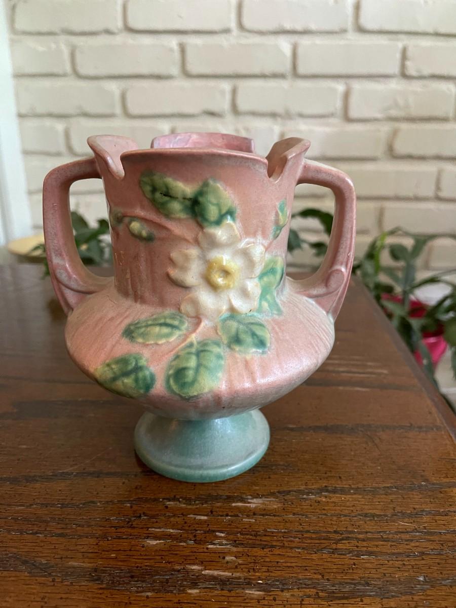 Vintage Roseville Pottery, White rose collection, Pink trophy vase with handles, 146-6
