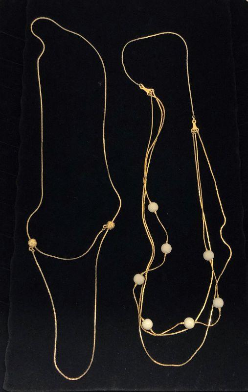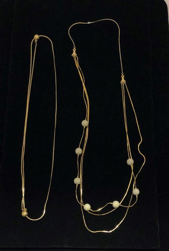 The slider chain adjusts to either be a long single chain or you can make it shorter and multi-strand. The other chain has a single chain that is linked to connectors that have three chains and light ivory colored beads.