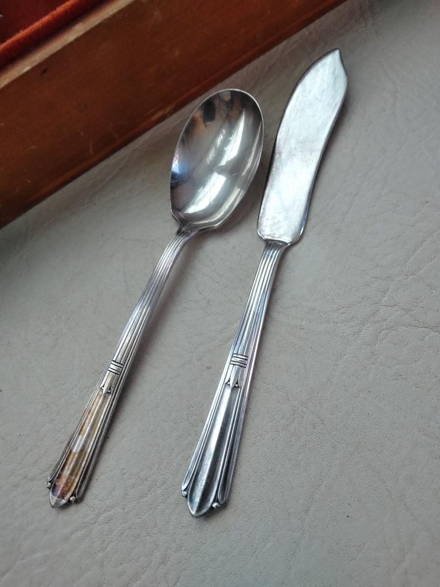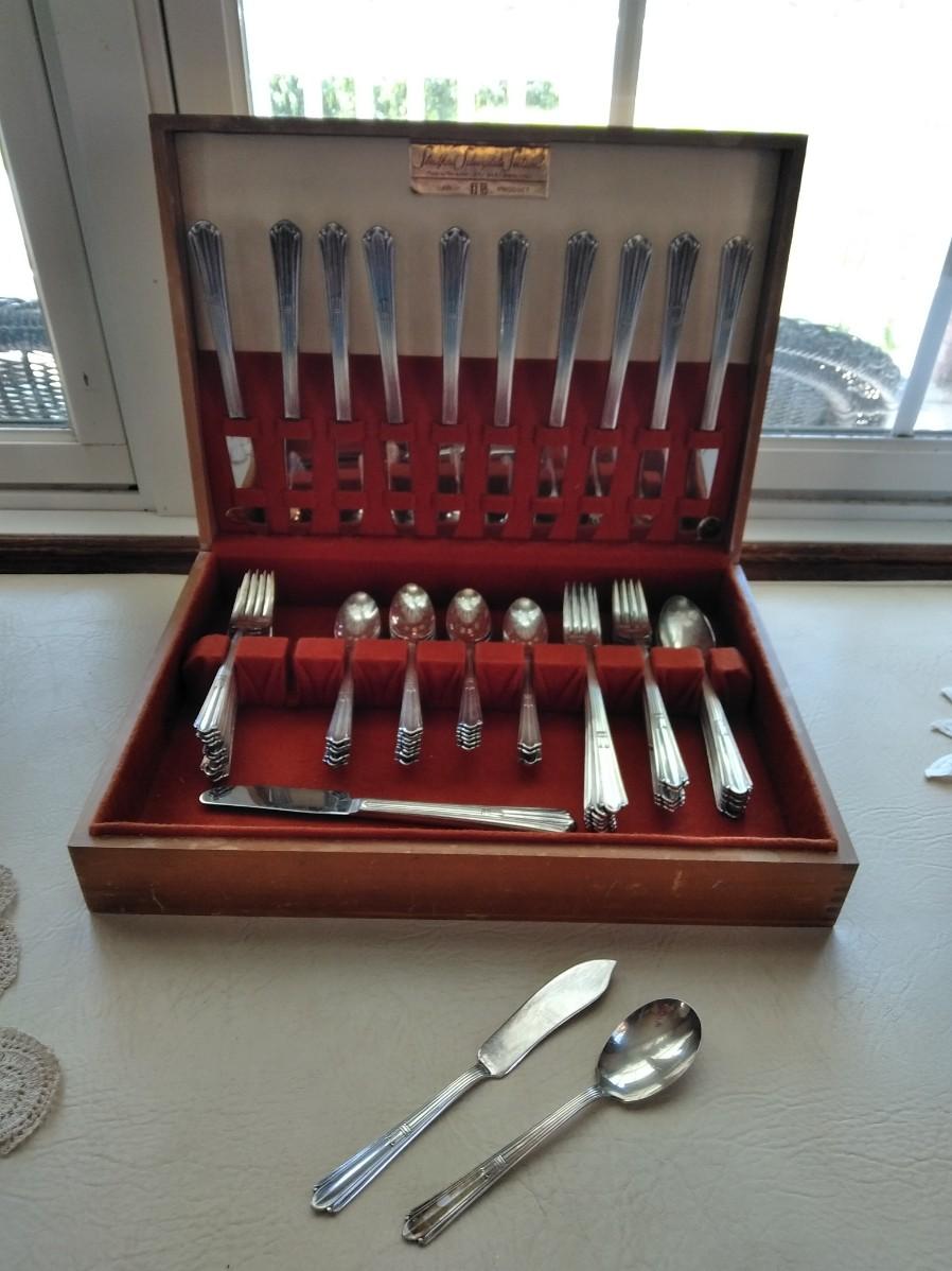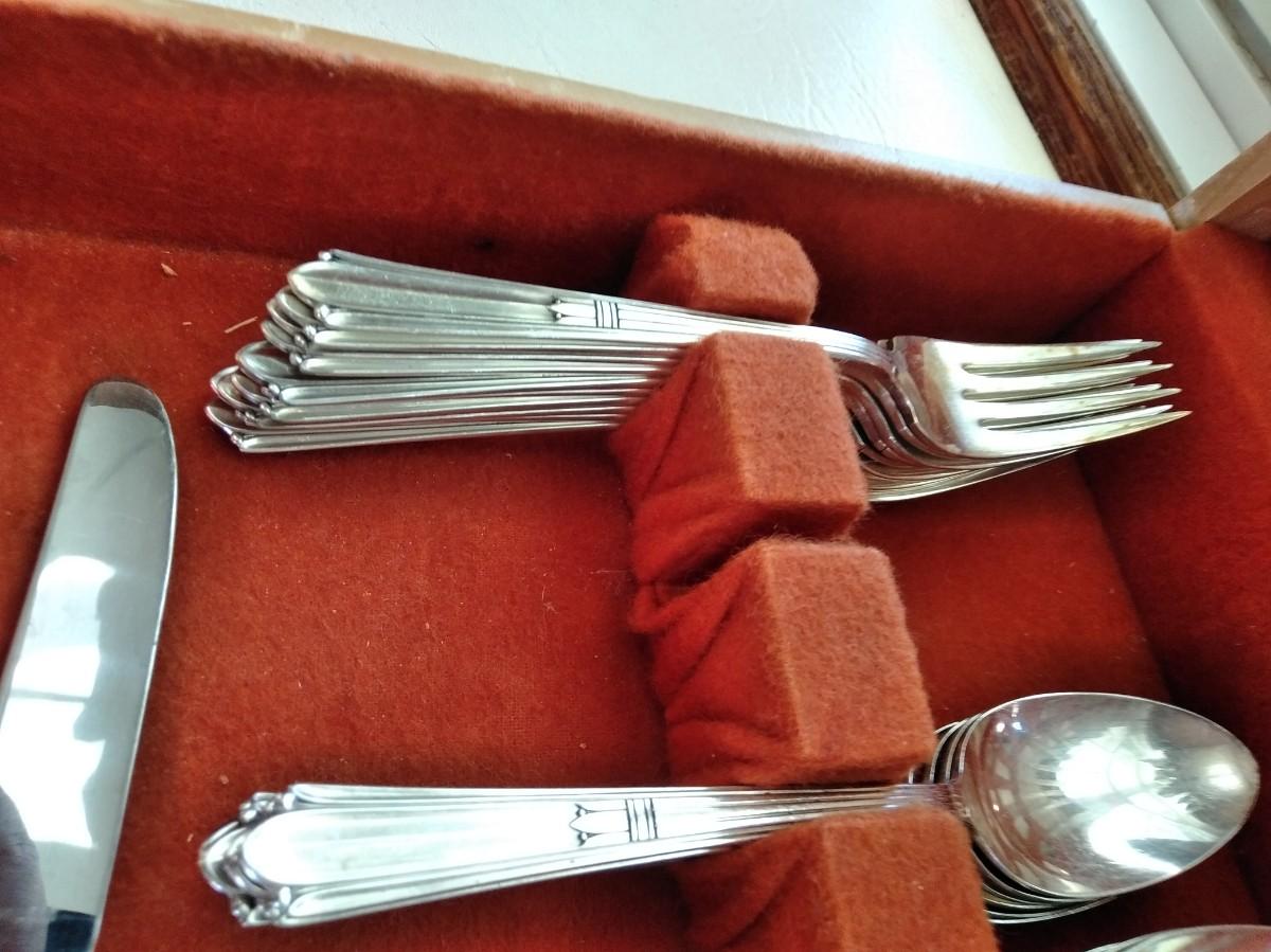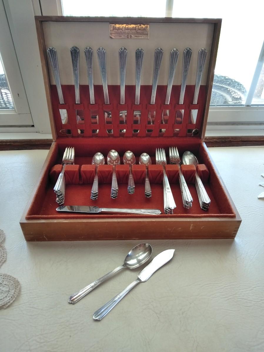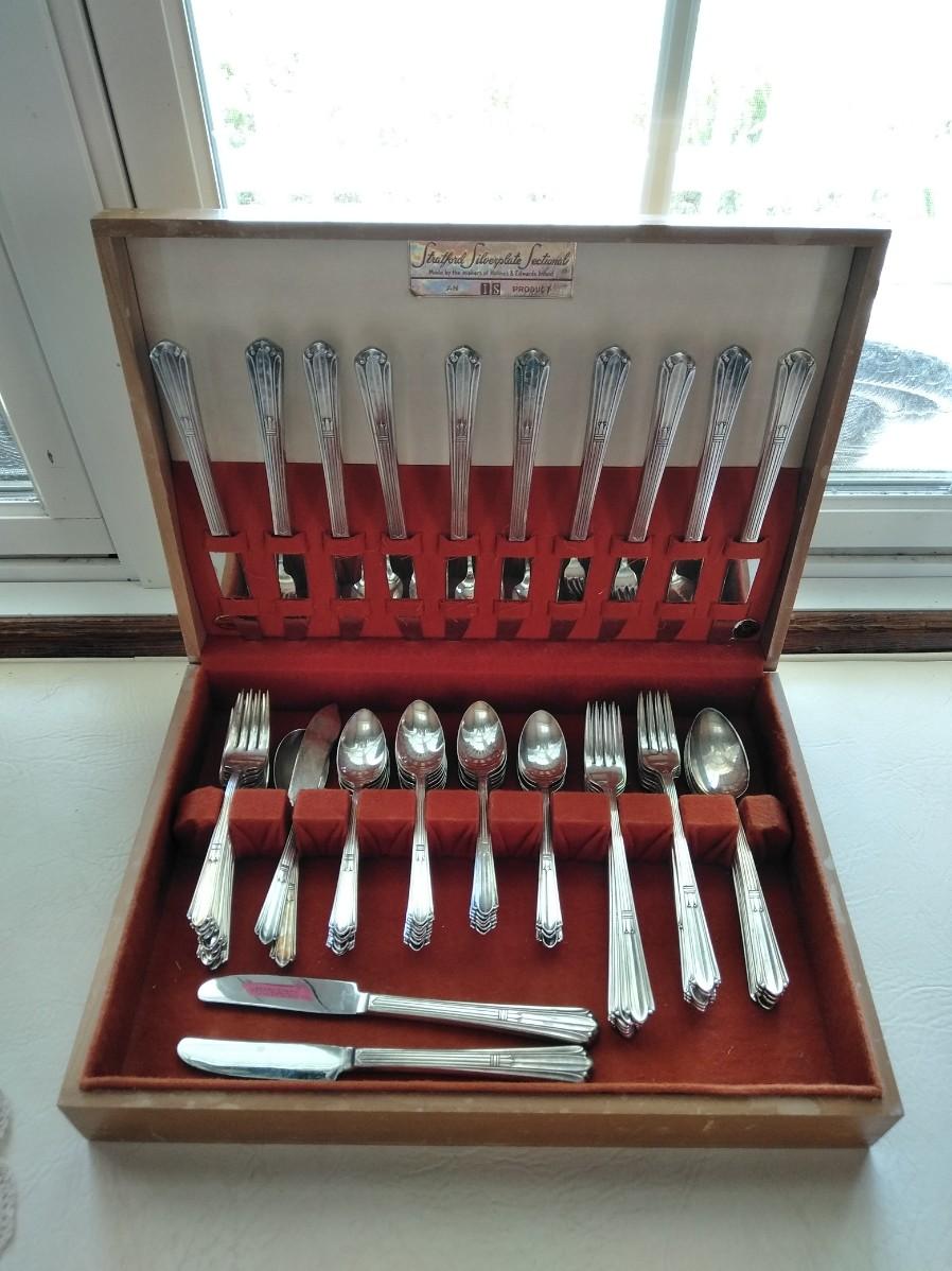 STRATFORD SIVERPLATE SECTIONAL SILVERWARE SET HOLMES & EDWARD THIS SET INCLUDES 12 KNIVES, 6 LARGE SPOONS, 5 FORKS, 7 LONG HANDLED FORKS, 10 SMALL FORKS, 24 SPOONS, 1 SPREADING KNIFE, AND 1 WIDE SPOON.