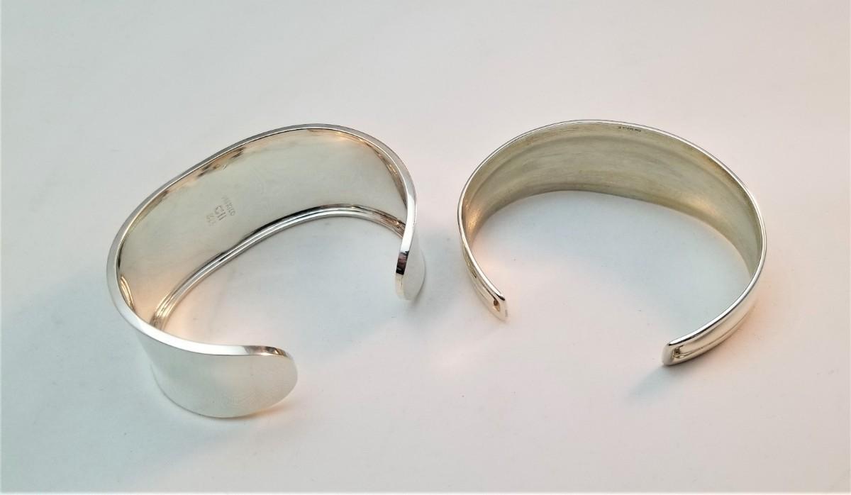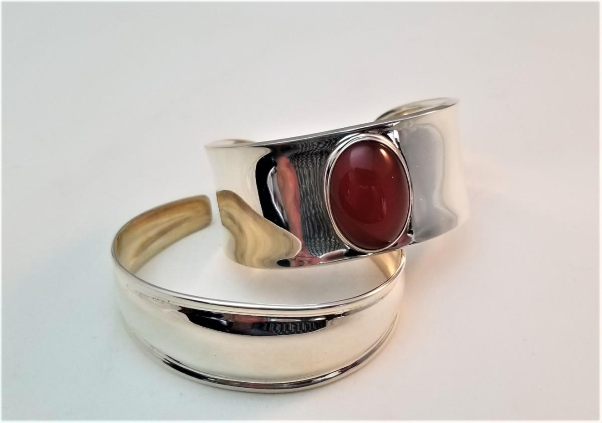 Two contemporary Sterling Silver Cuff Bracelets - one is plan, the other has an amber cabochon and is marked "Mexico." Larger is 1.25" wide, the smaller is 1" wide. Good condition.