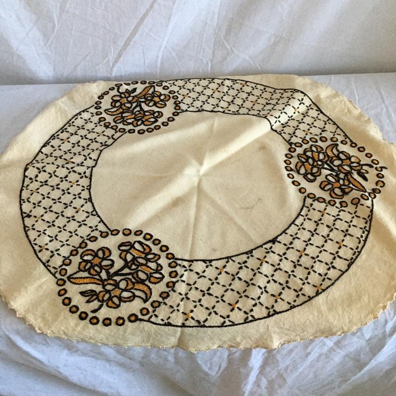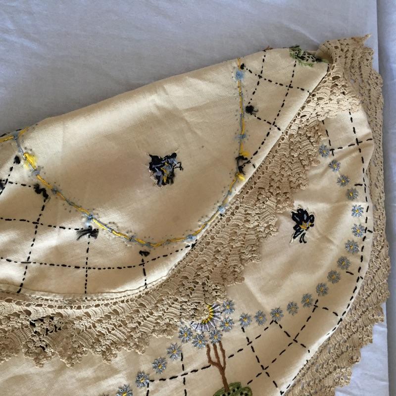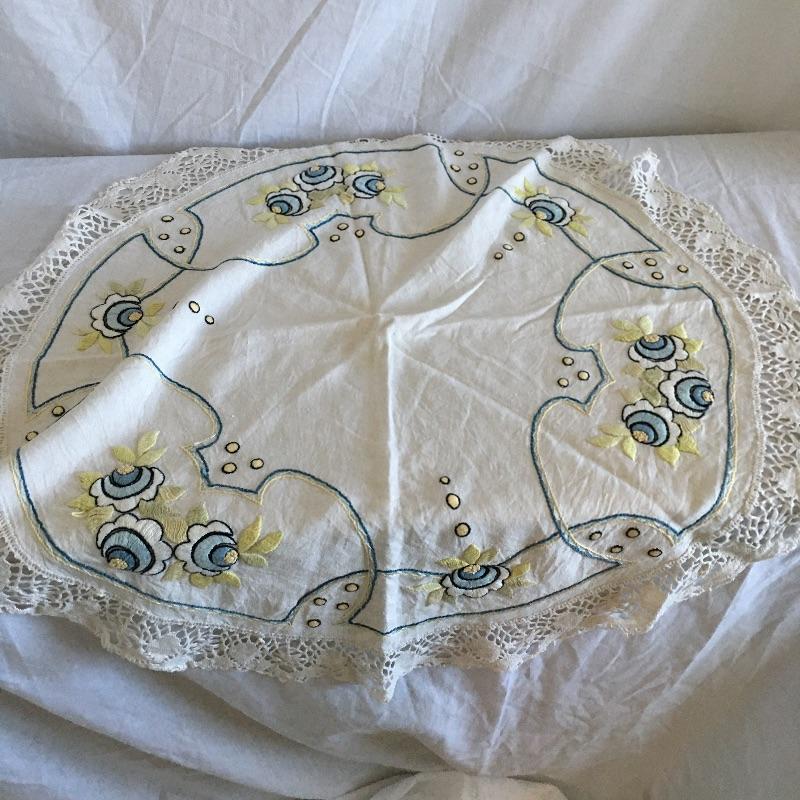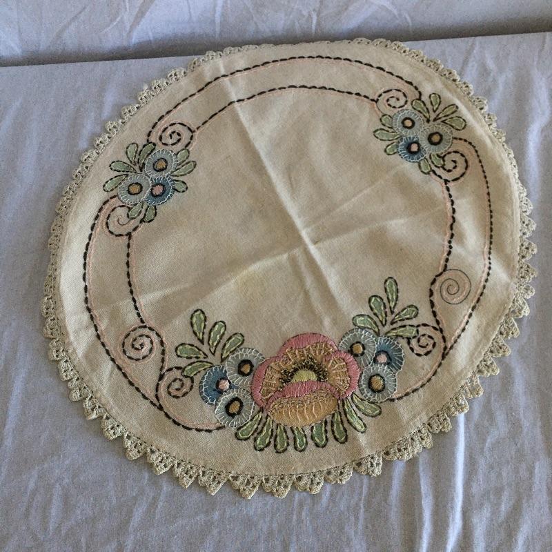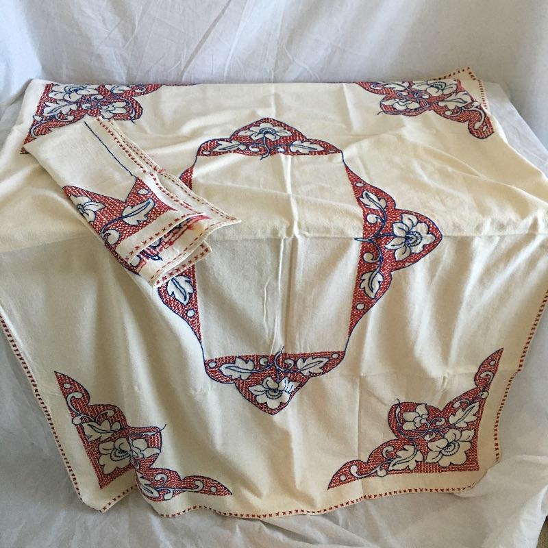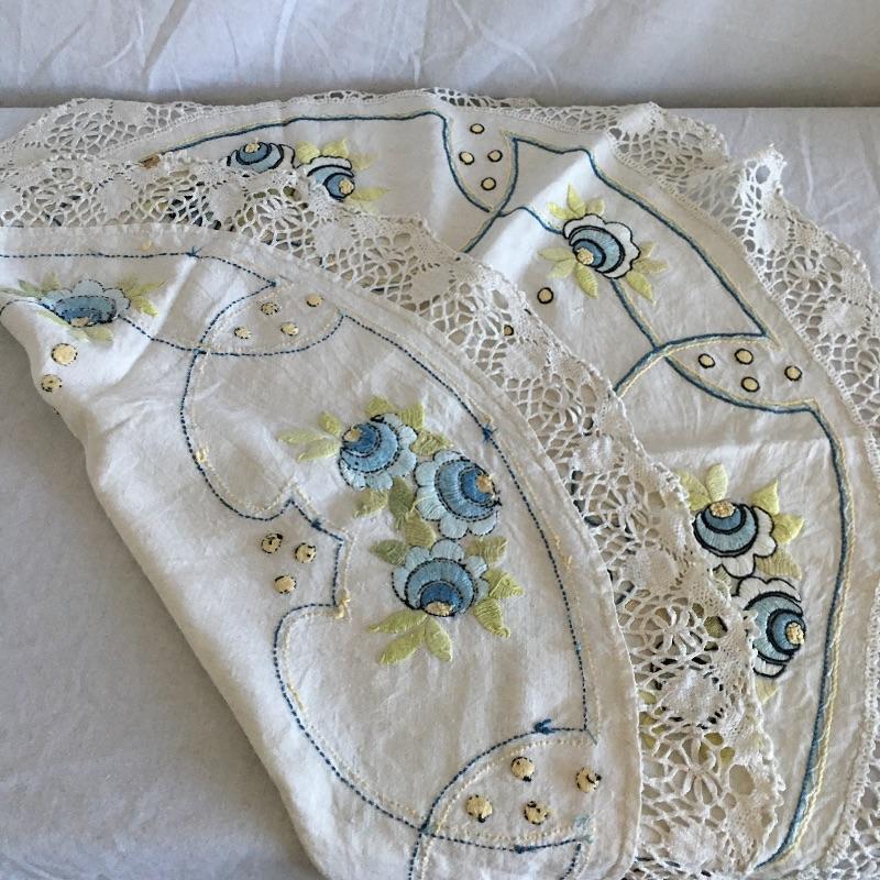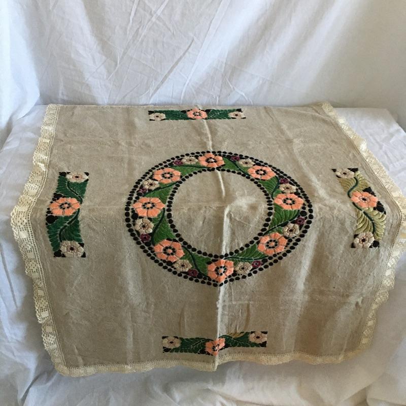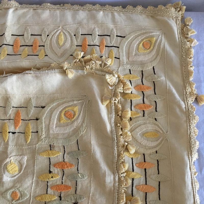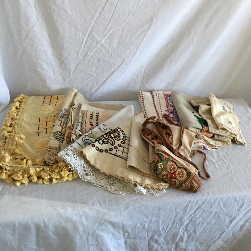 Vintage craftsman linens and catalog includes round and rectangular tablecloths, apron, placemat and a reprint of a vintage catalog. Some of the most lovely linens you will find, the craftsmanship is on display with the details in the work. The two bags have small stains, see pictures. Largest cloth measures 45” x 60”.