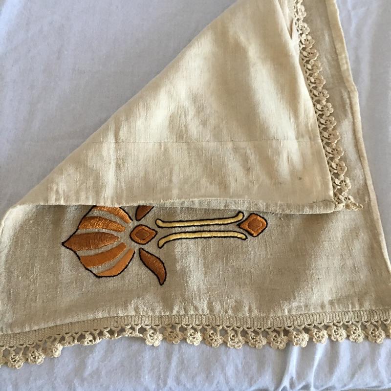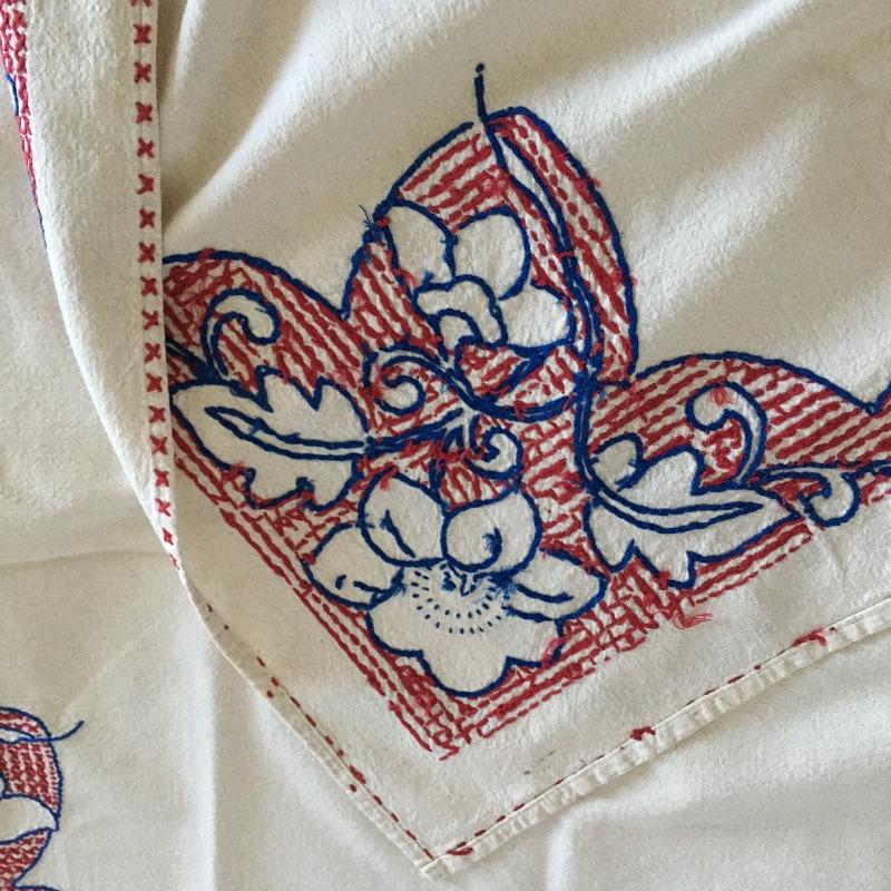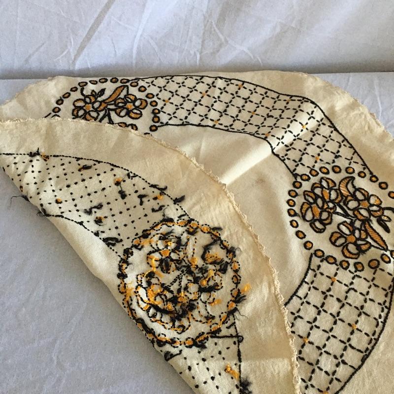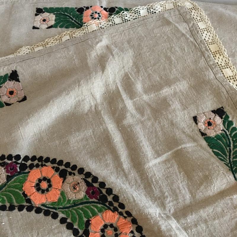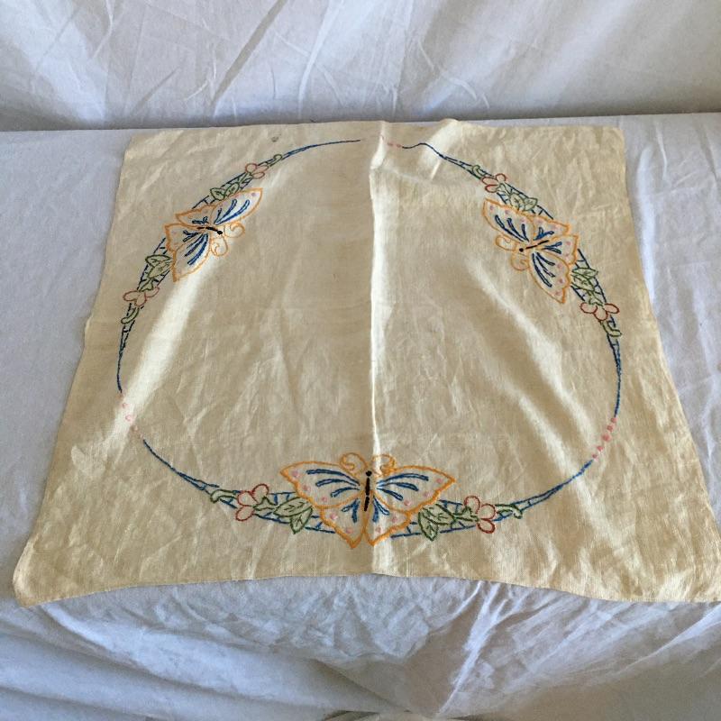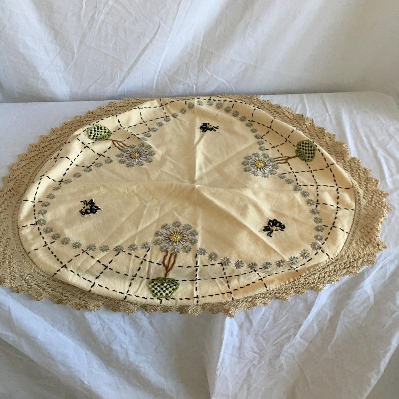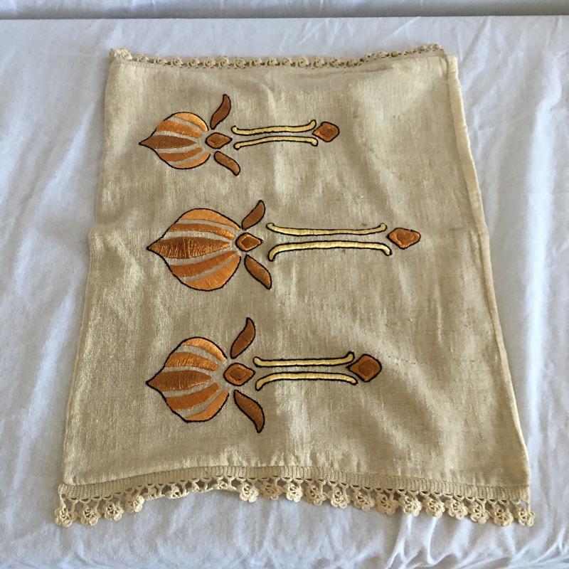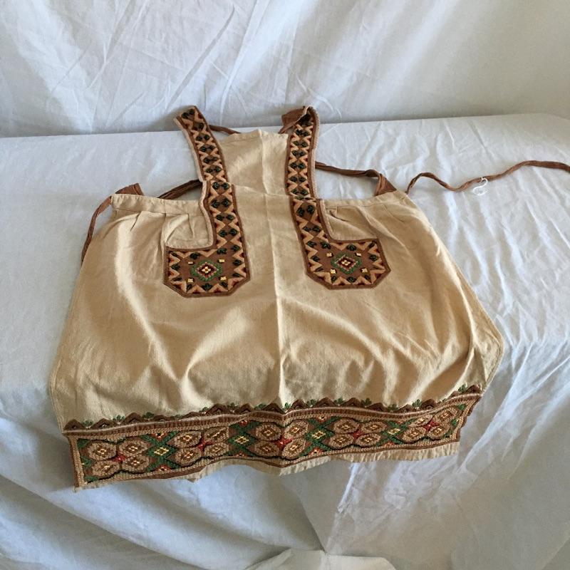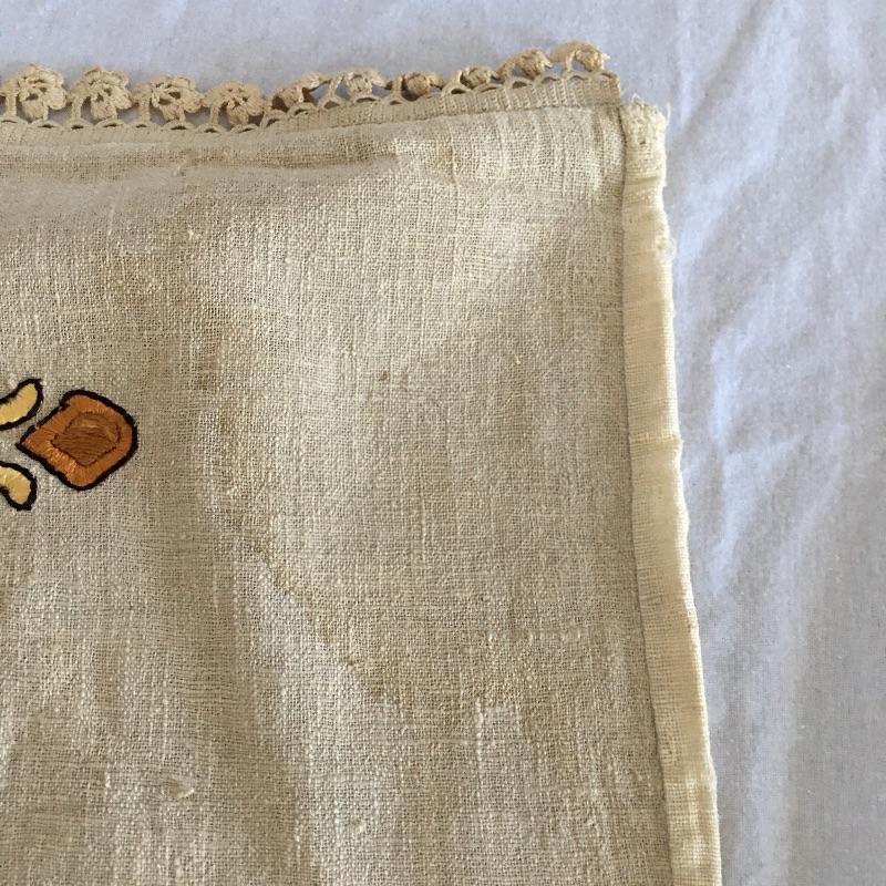Vintage craftsman linens and catalog includes round and rectangular tablecloths, apron, placemat and a reprint of a vintage catalog. Some of the most lovely linens you will find, the craftsmanship is on display with the details in the work. The two bags have small stains, see pictures. Largest cloth measures 45” x 60”.