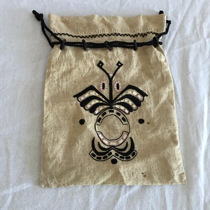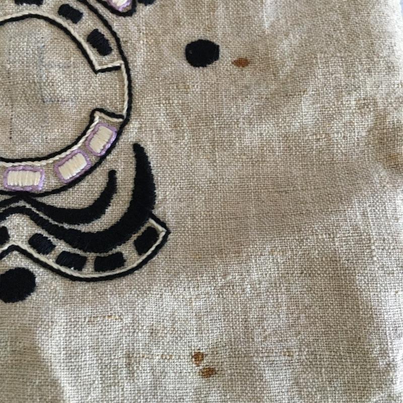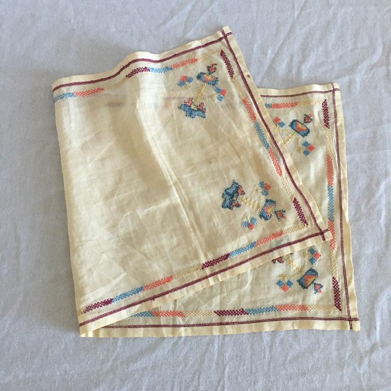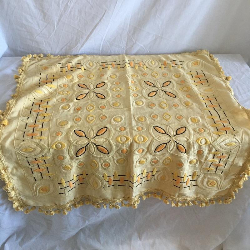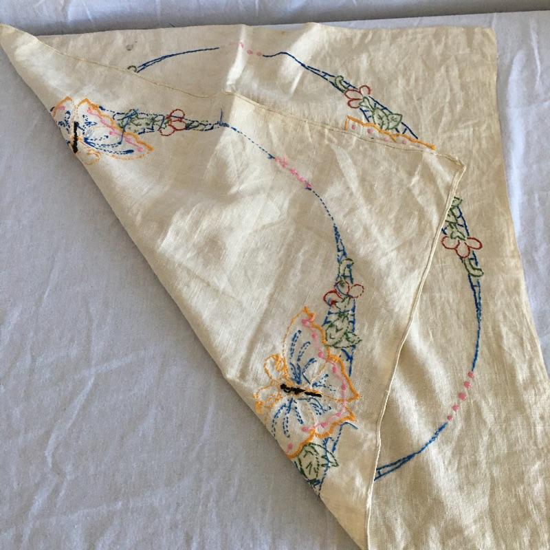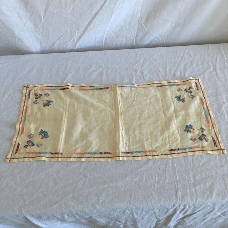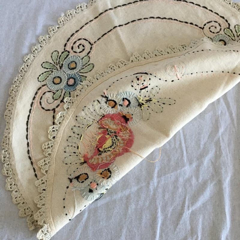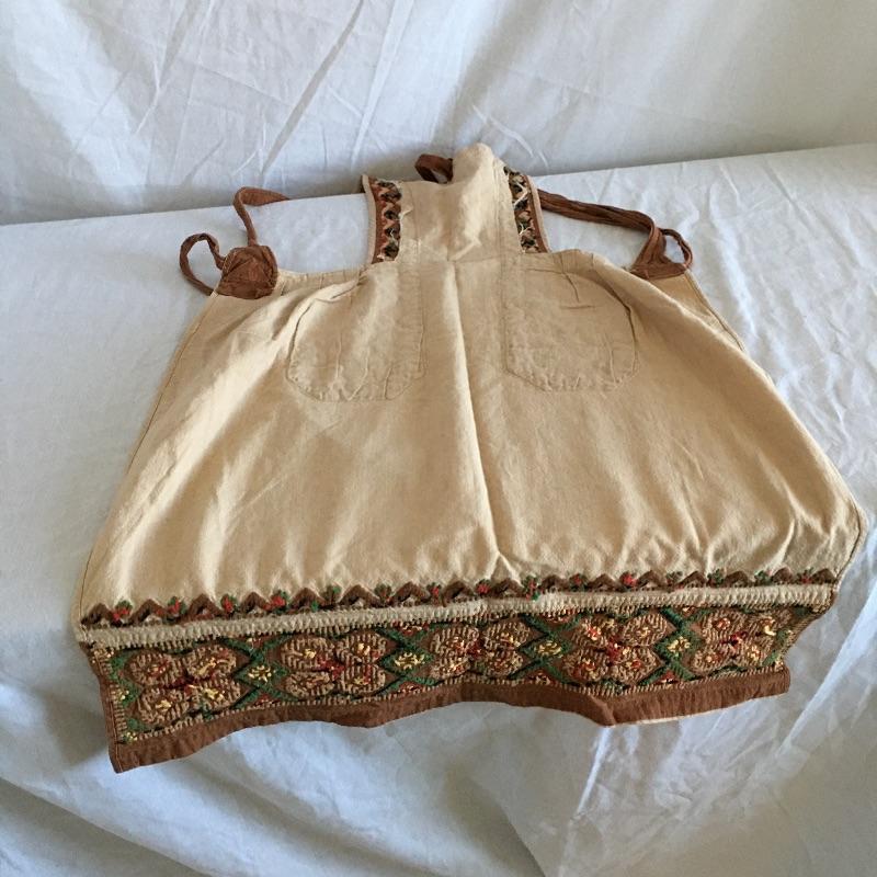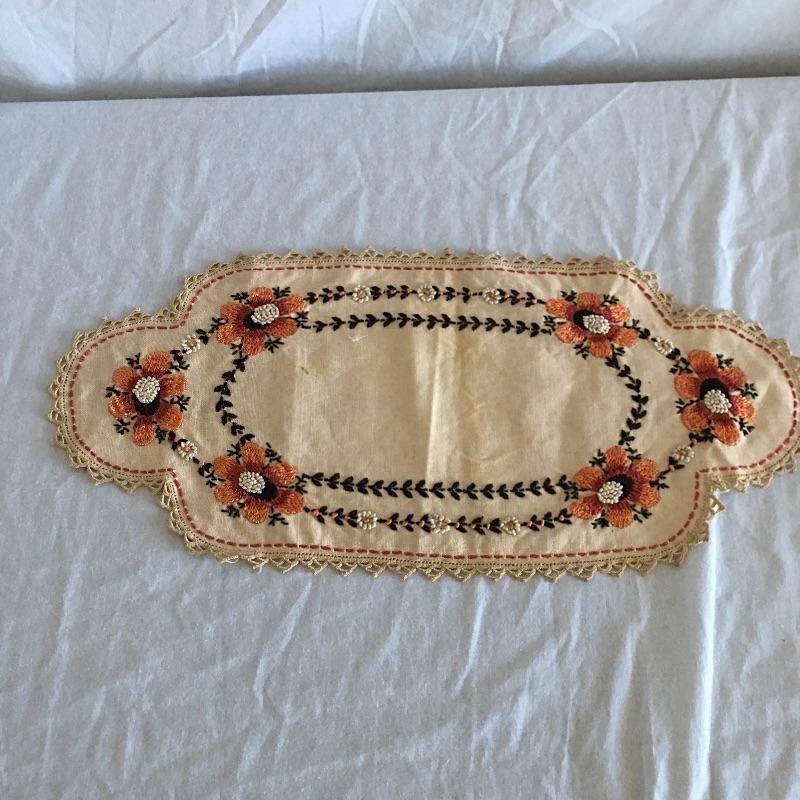 Vintage craftsman linens and catalog includes round and rectangular tablecloths, apron, placemat and a reprint of a vintage catalog. Some of the most lovely linens you will find, the craftsmanship is on display with the details in the work. The two bags have small stains, see pictures. Largest cloth measures 45” x 60”.