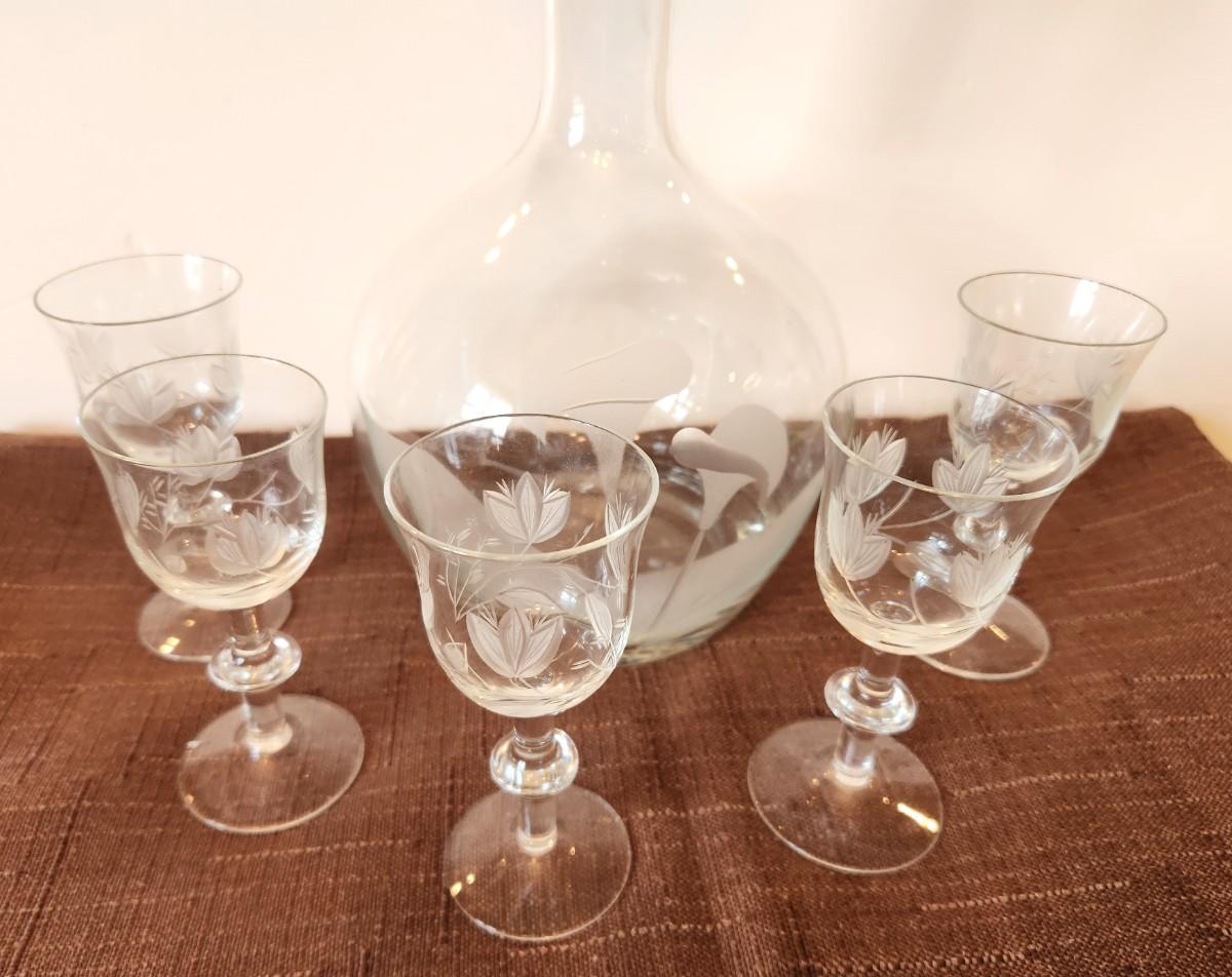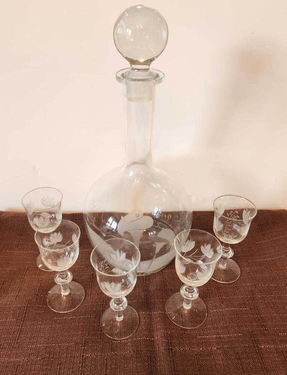Vintage Crystal decanter with Lily motif - 5 matching cordial or liqueur glass. Decanter is 13" tall, glasses 5" tall. Good condition.
