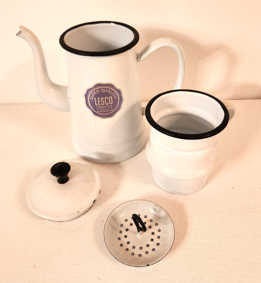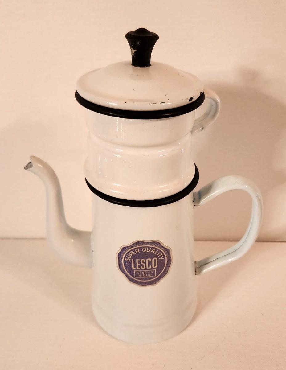 Nice vintage French drip coffee pot - white enamel - complete - 10" tall - Lesco brand. 4 Cup pot - looked unused.