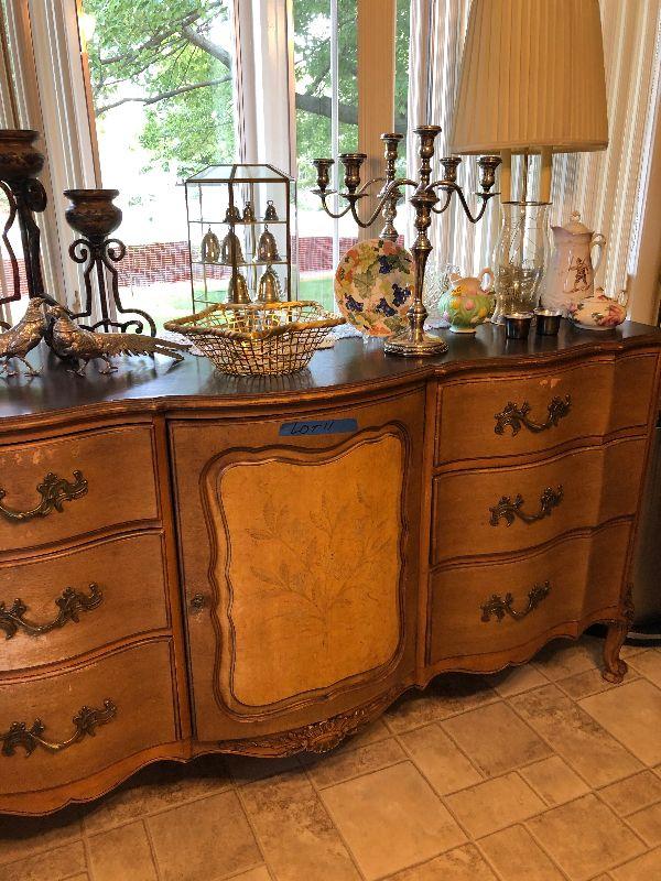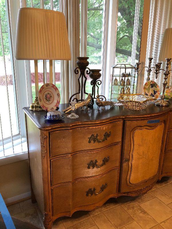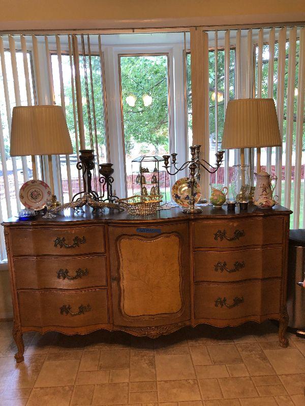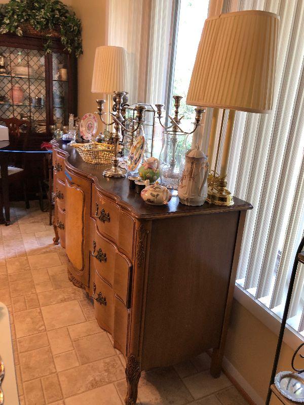 68" French Provincial Buffet, 2 matching lamps, Weighted Sterling Silver candelabra, and other miscellaneous items.