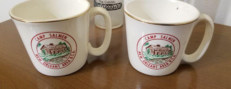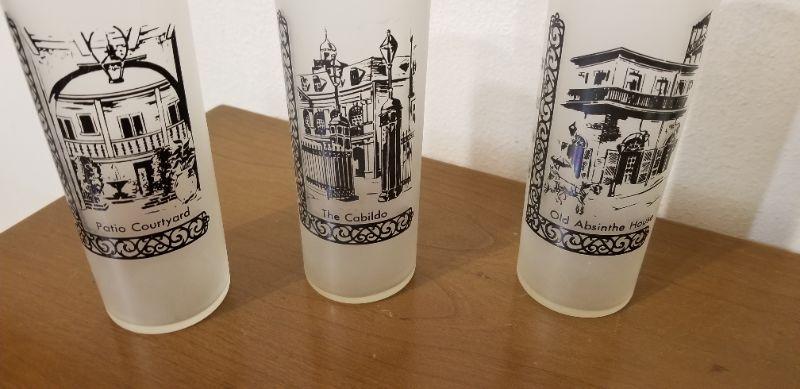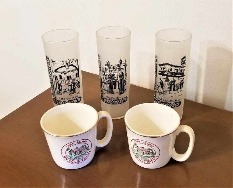 You get all you see here - 3 vintage New Orleans Hi-Ball Bar glasses "In Old New Orleans series" - Cabildo, Patio Courtyard and Old Absinthe House" and two Camp Salmen Boy Scouts Camp mugs. All in good condition. Glasses are 7" tall, cups 3.5" tall.