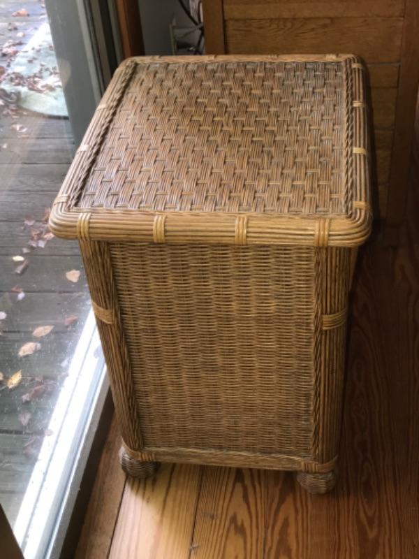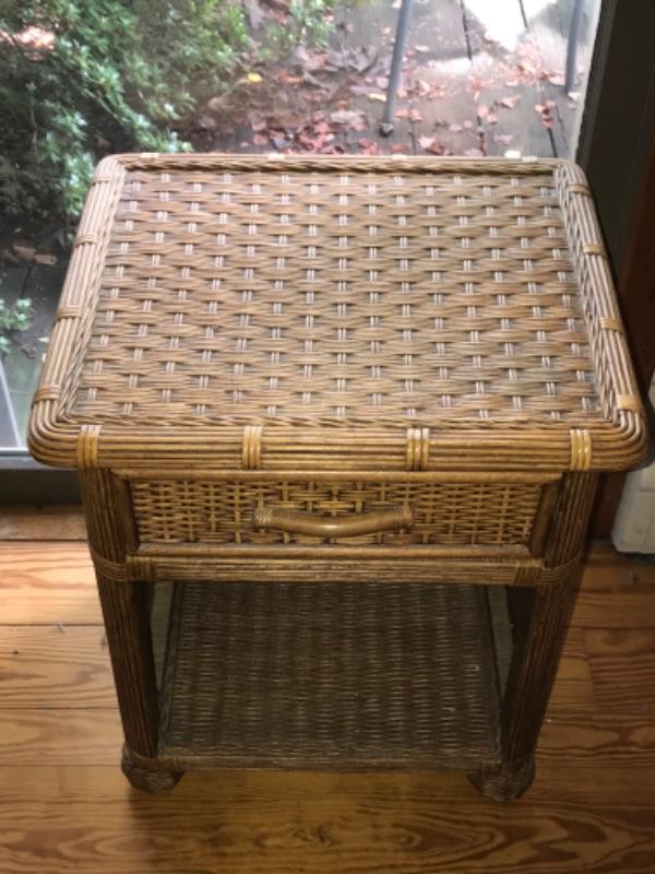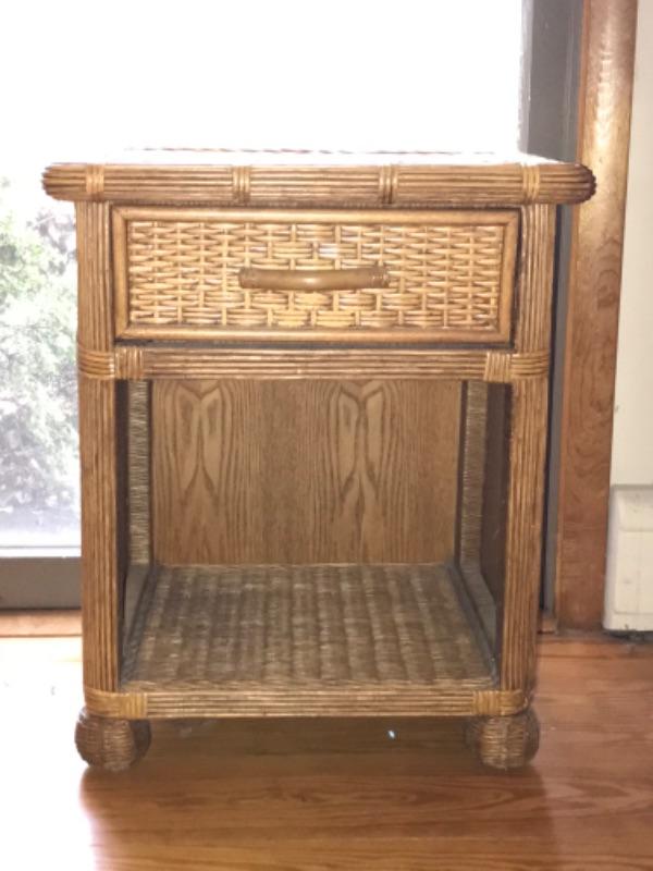 Wicker headboard measures 4’6” high and 4’10-1/2” wide. Nightstand has one drawer and measures 2’2-1/2” high 1’9” wide and 1’6” deep