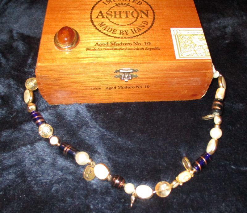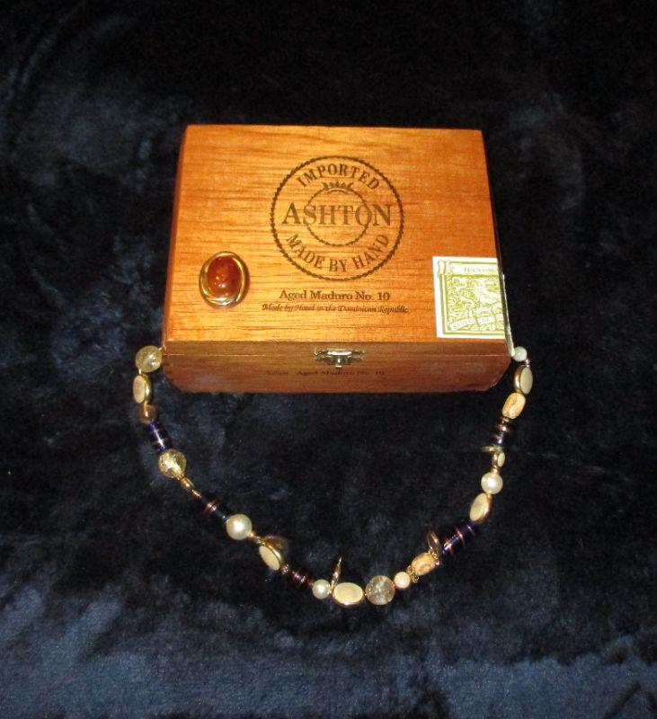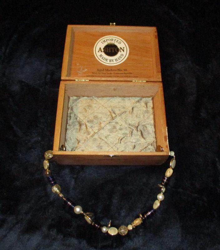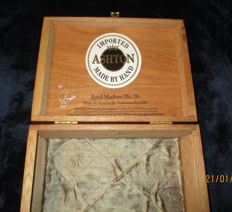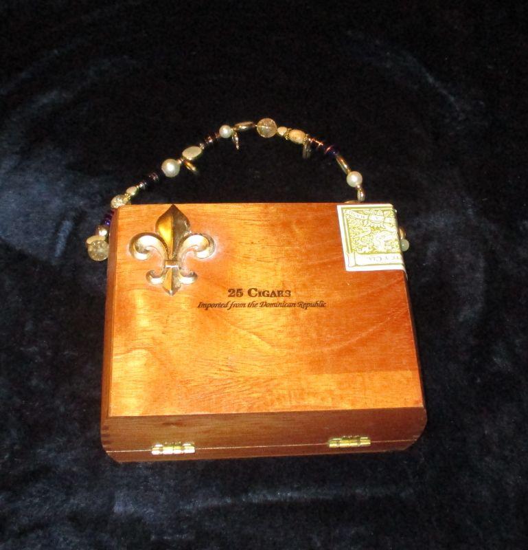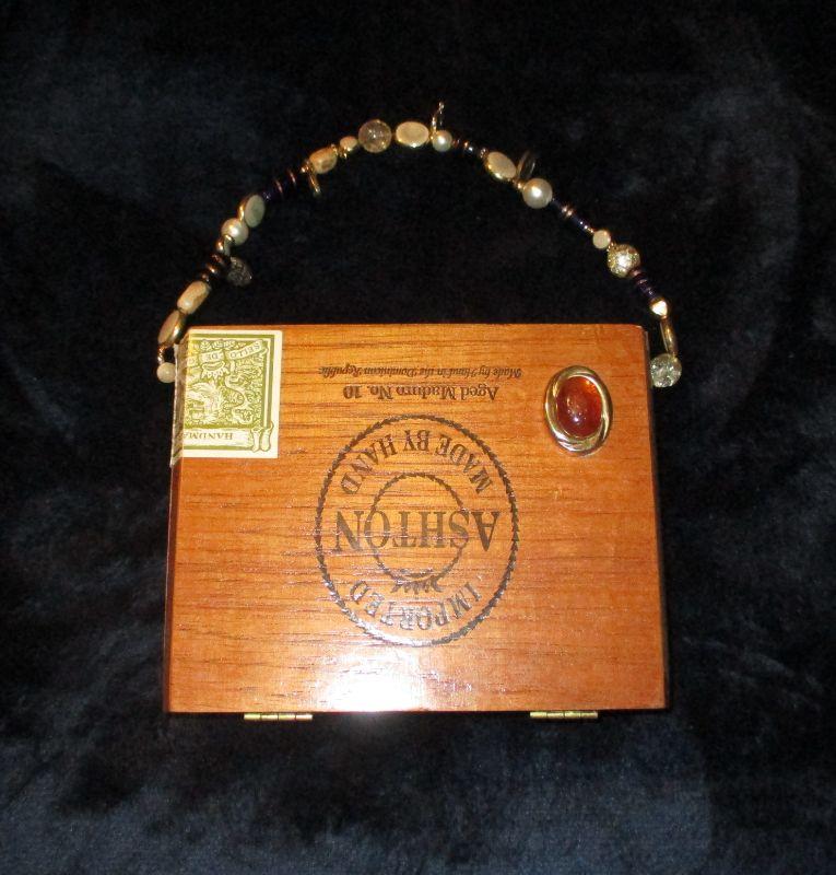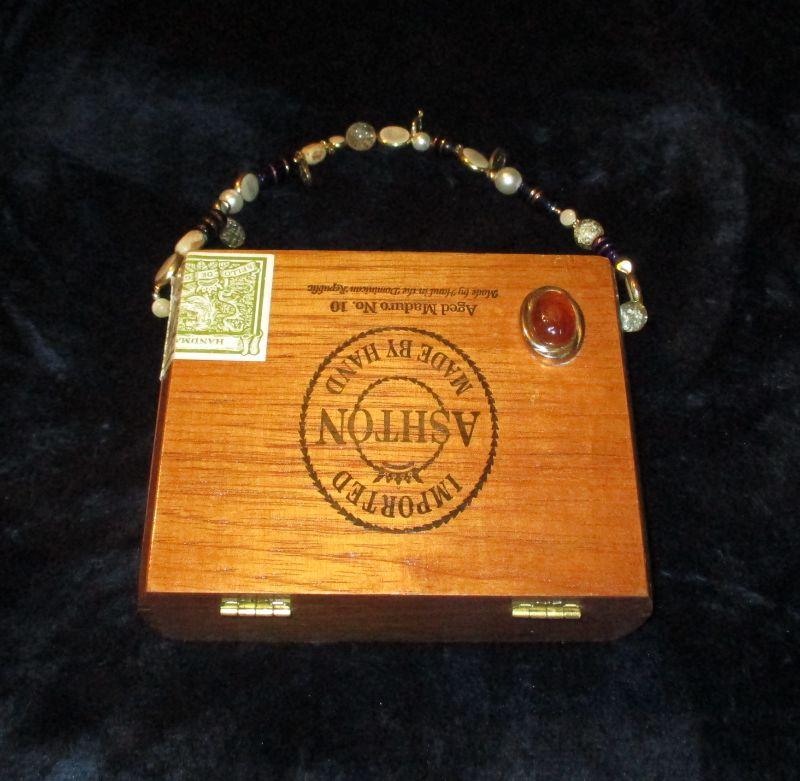 Solid wood Ashton Cigar box that has been coverted to a purse. In very good condition. 7.5" x 6" x 2.5".