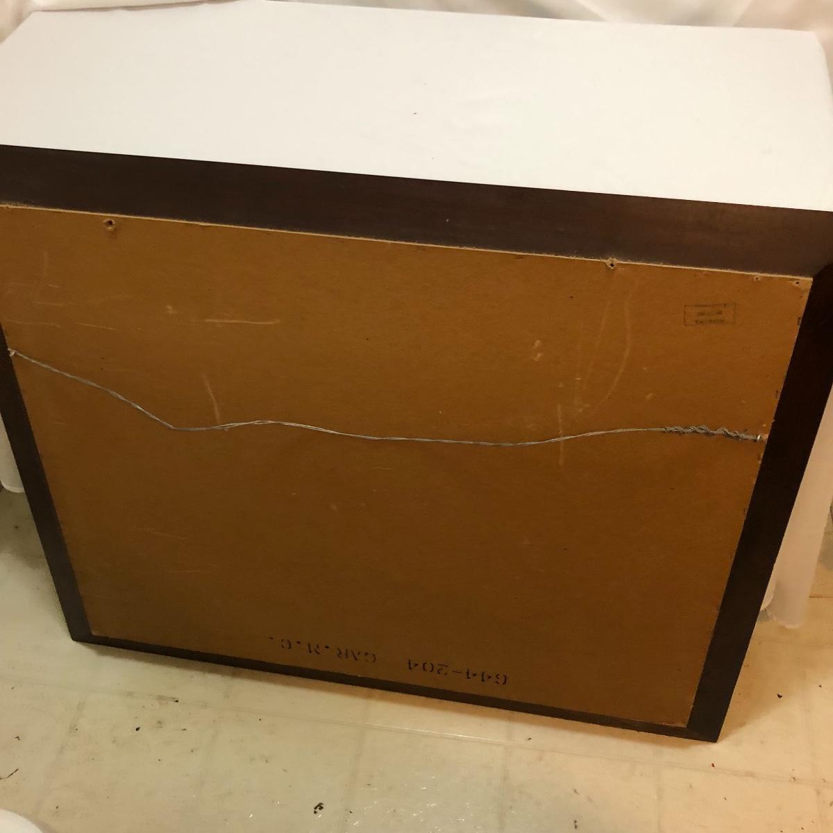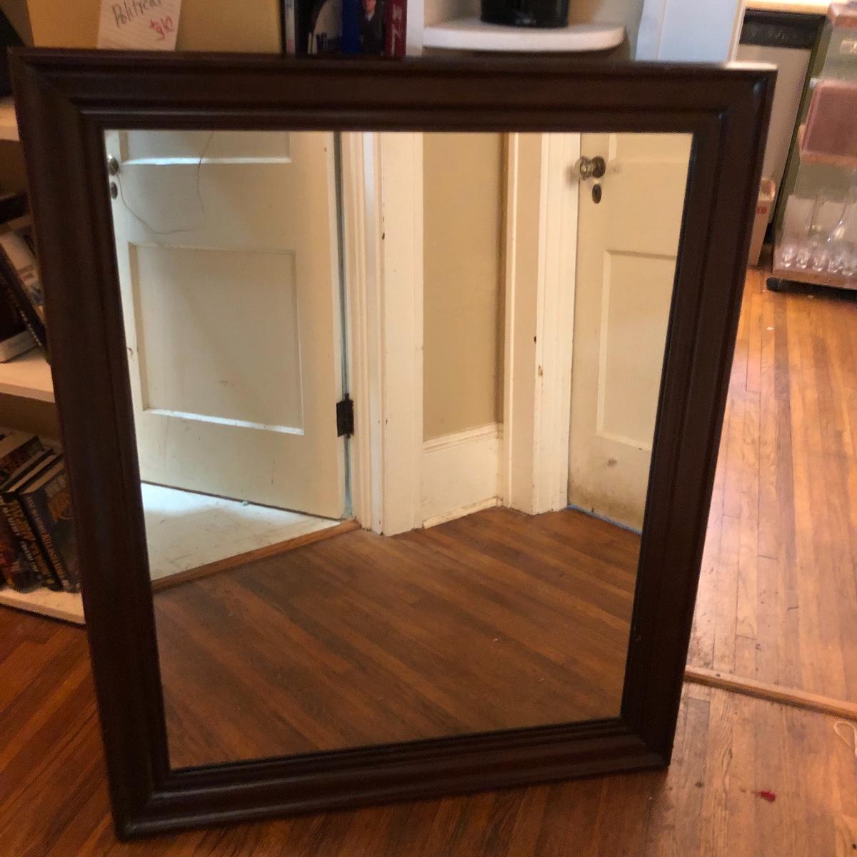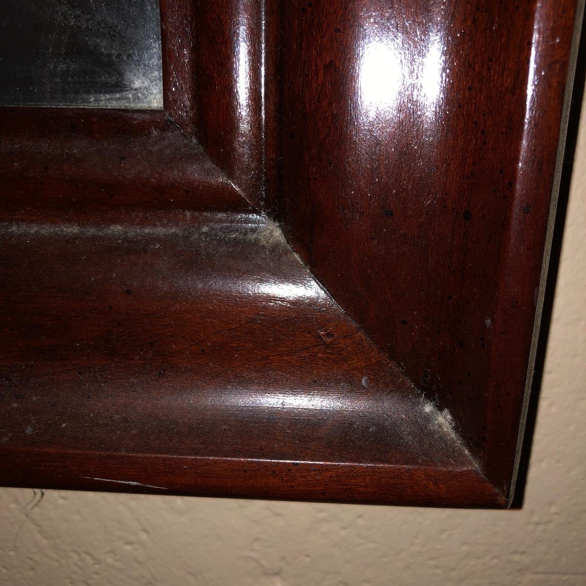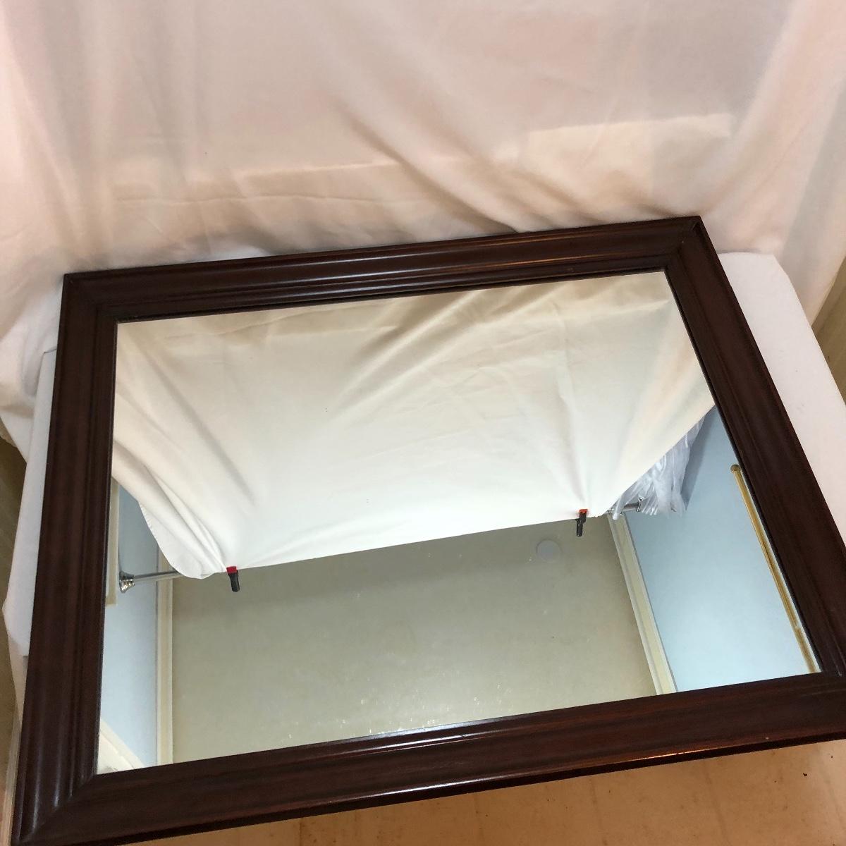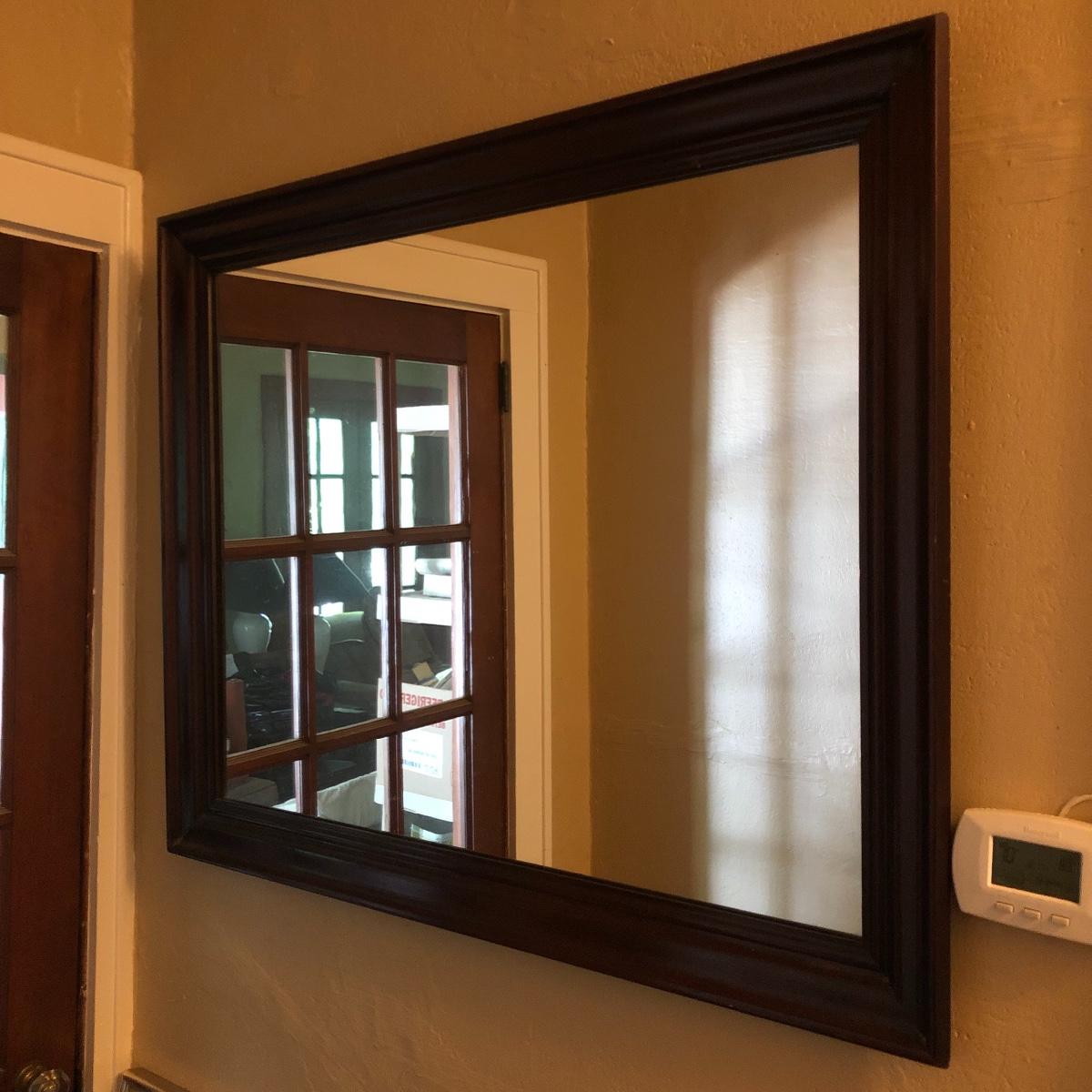 This mirror will be great over the fireplace as a focal point in your living room. Mirror has wooden frame and wire to hang on wall. Mirror measures 33.5” x 42”.