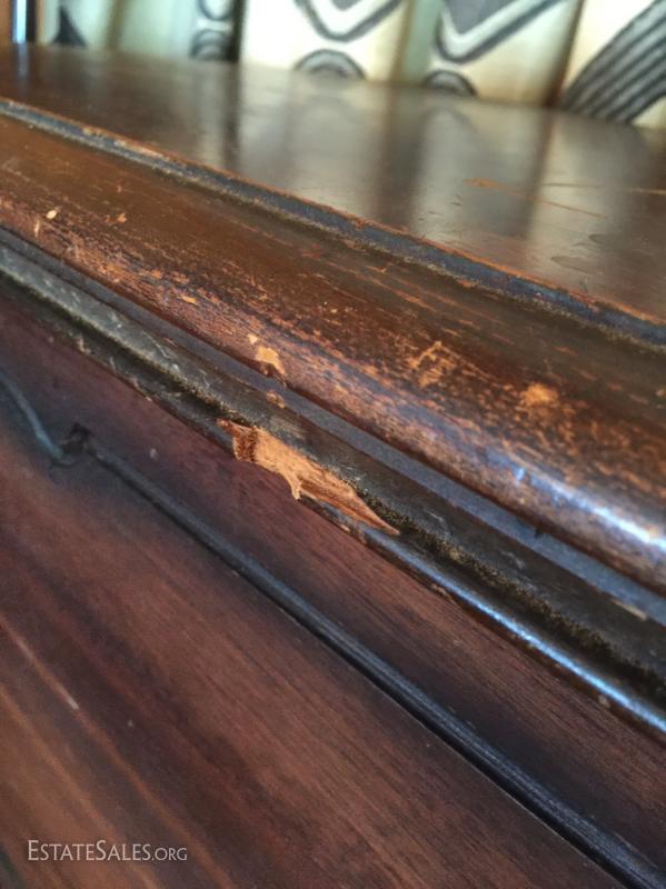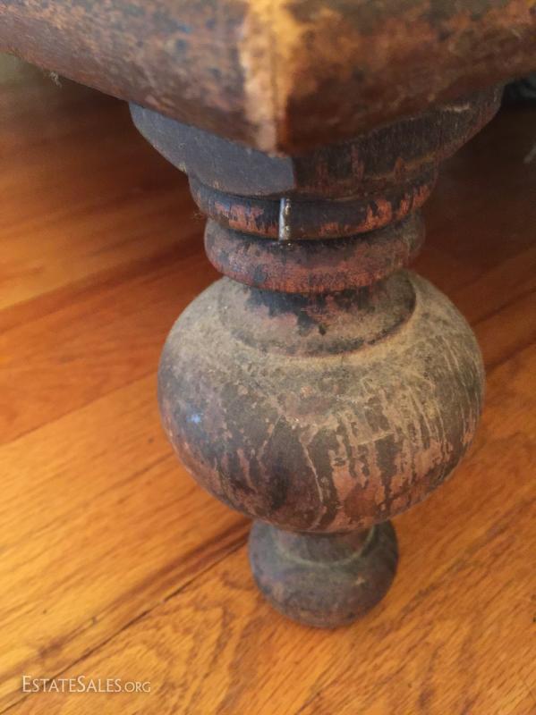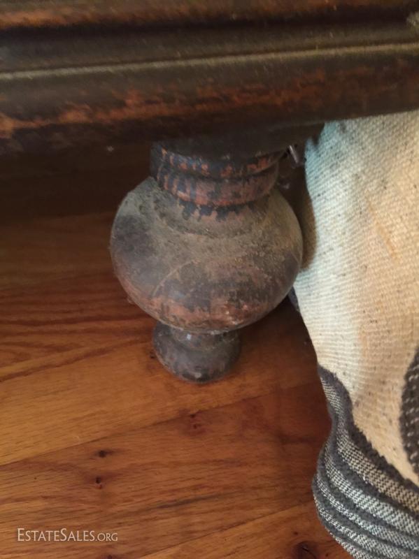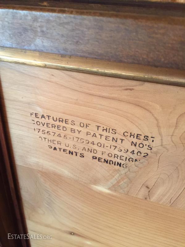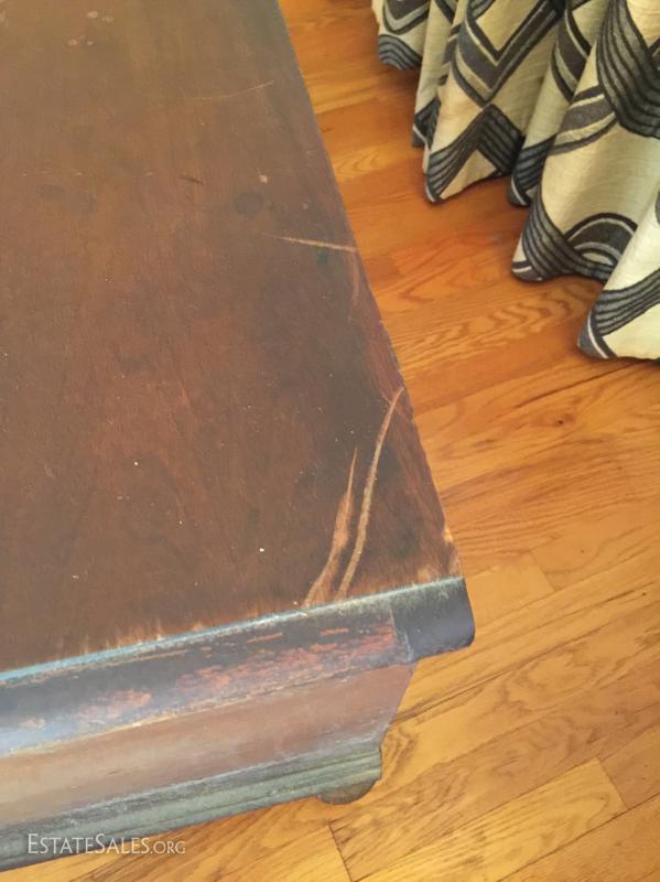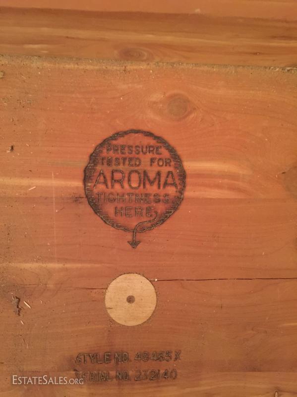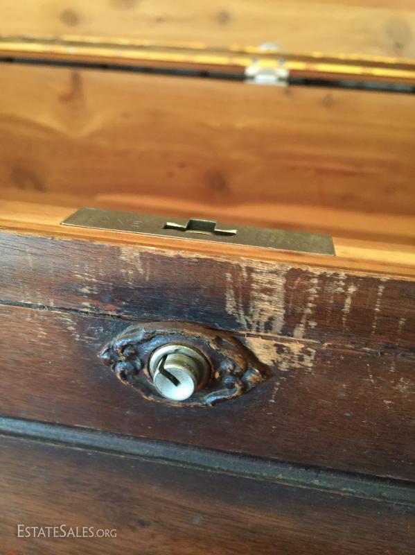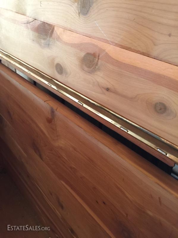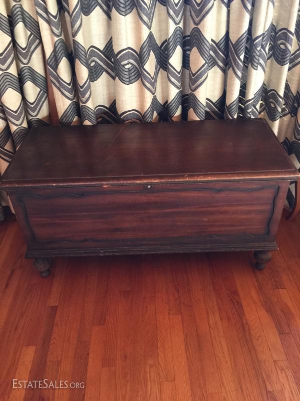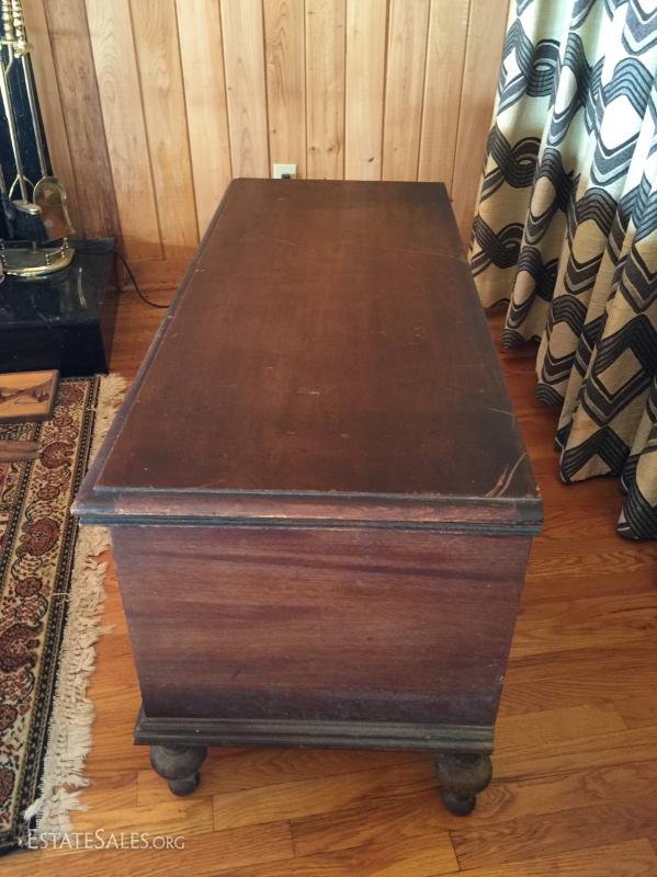 Footed. Latch top. Cedar inside. Legs are wobbly. Imperfections on wood. See photos for details. Sold as is. Approximately 25”L by 48”W by 20.5”D