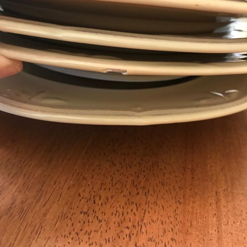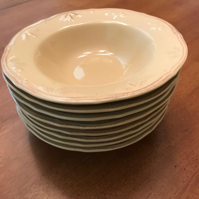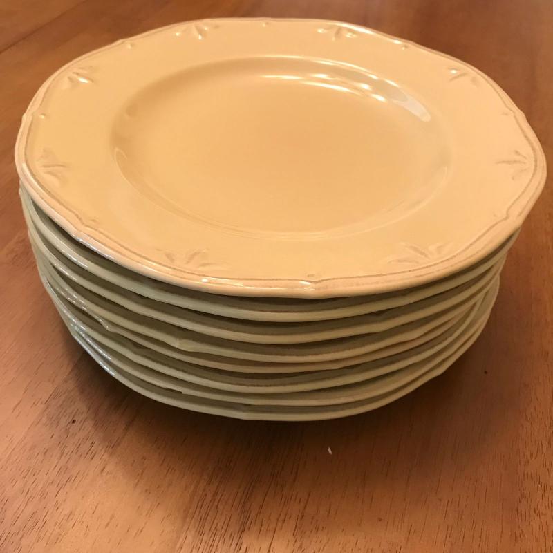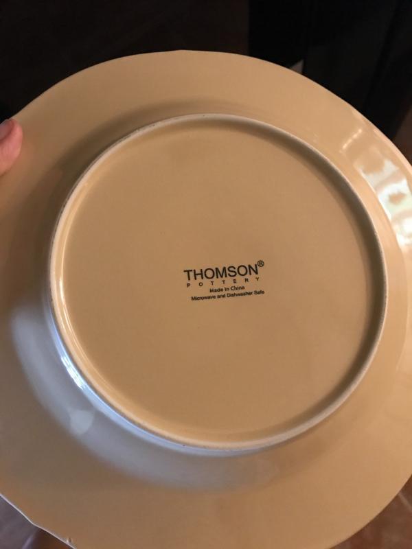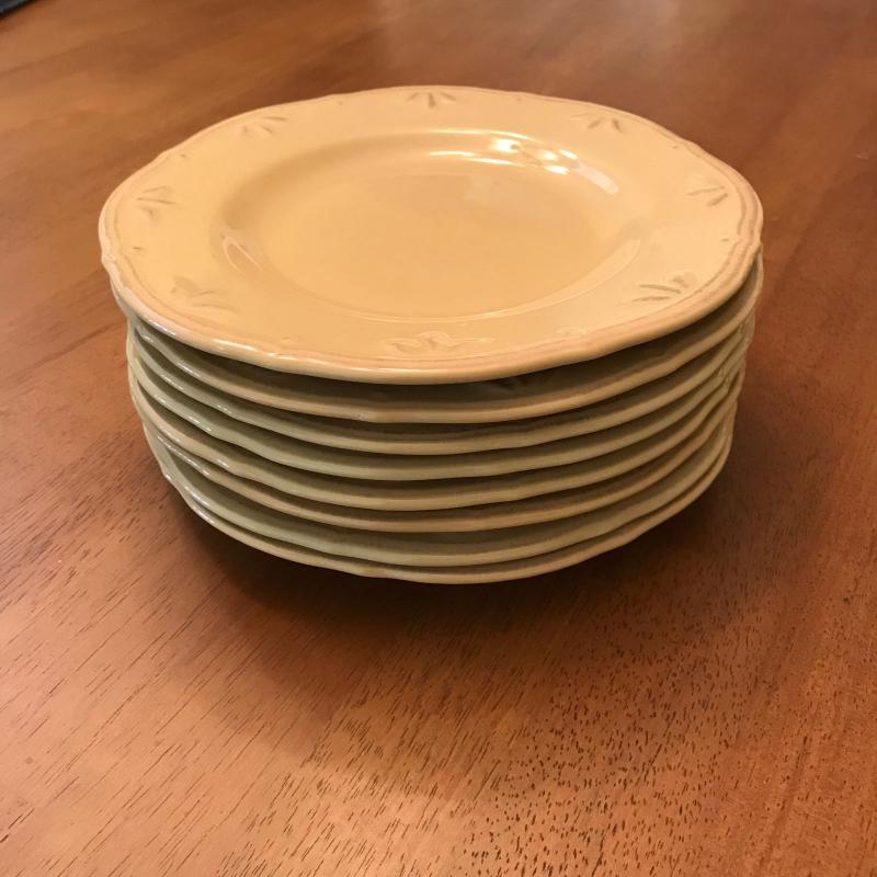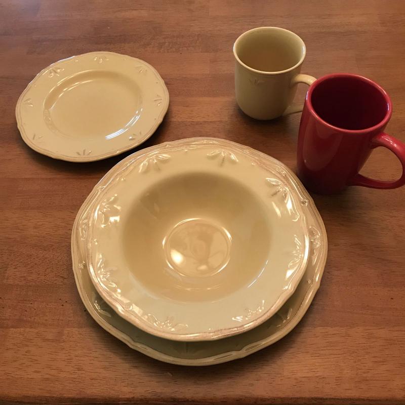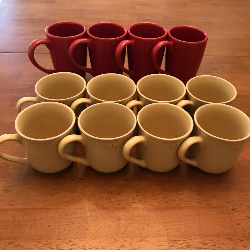 Yellow dish set (with brown undertones) by Thomson Pottery. Includes plates,,bowls and mugs. Lot also includes a set of red mugs by Home. No shipping.