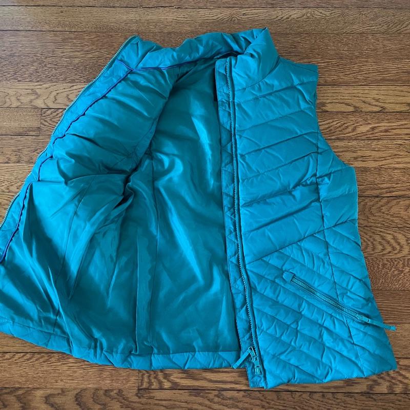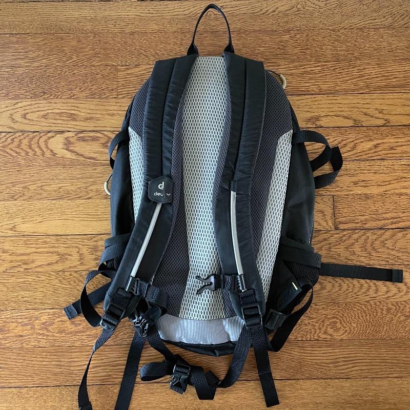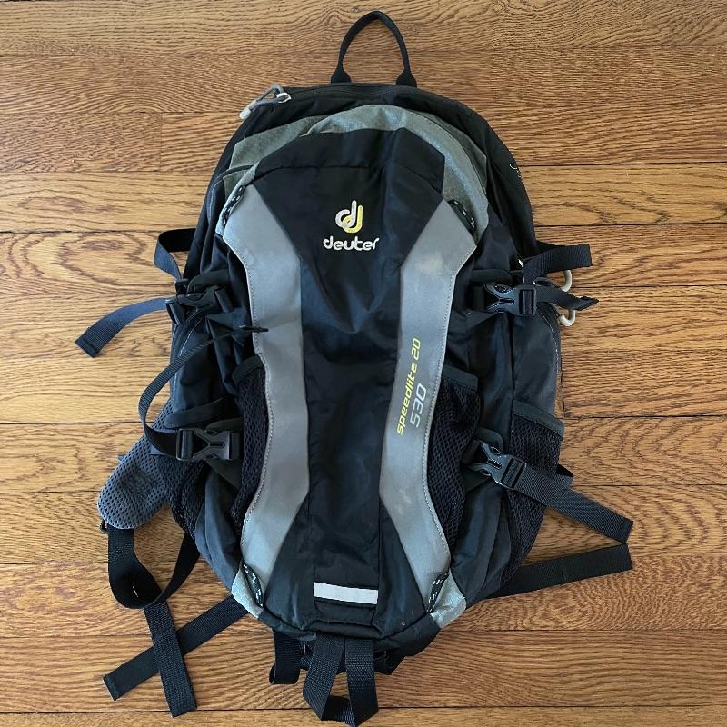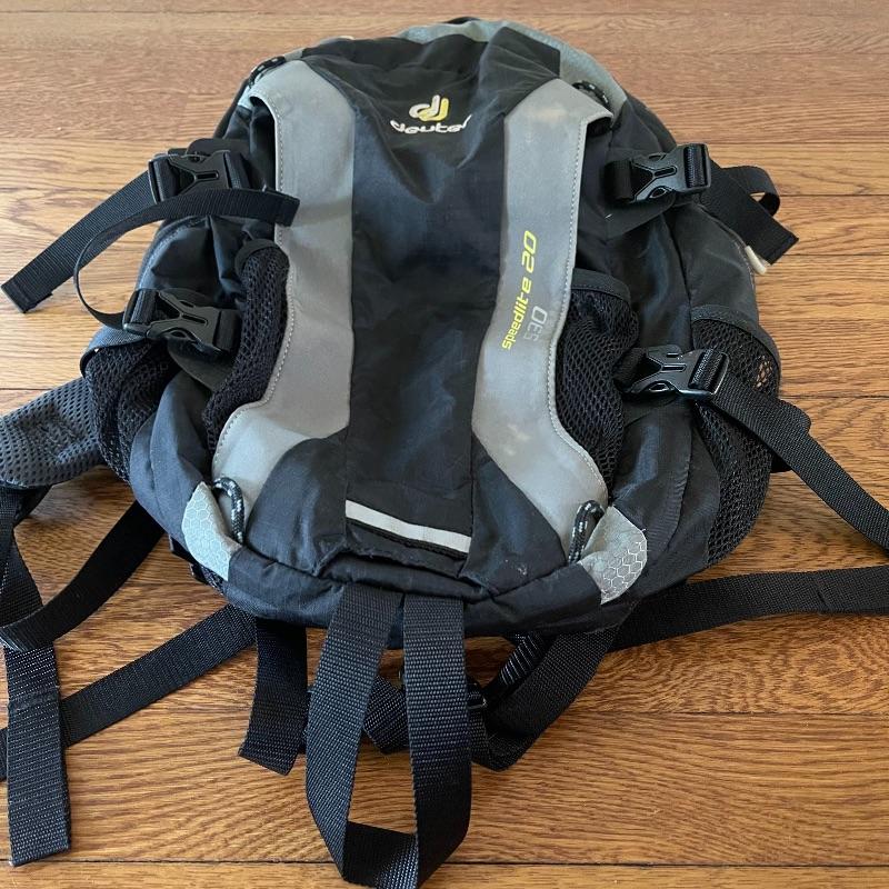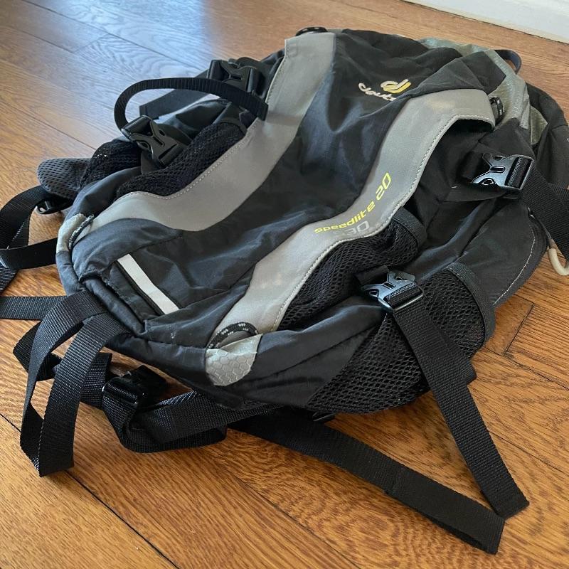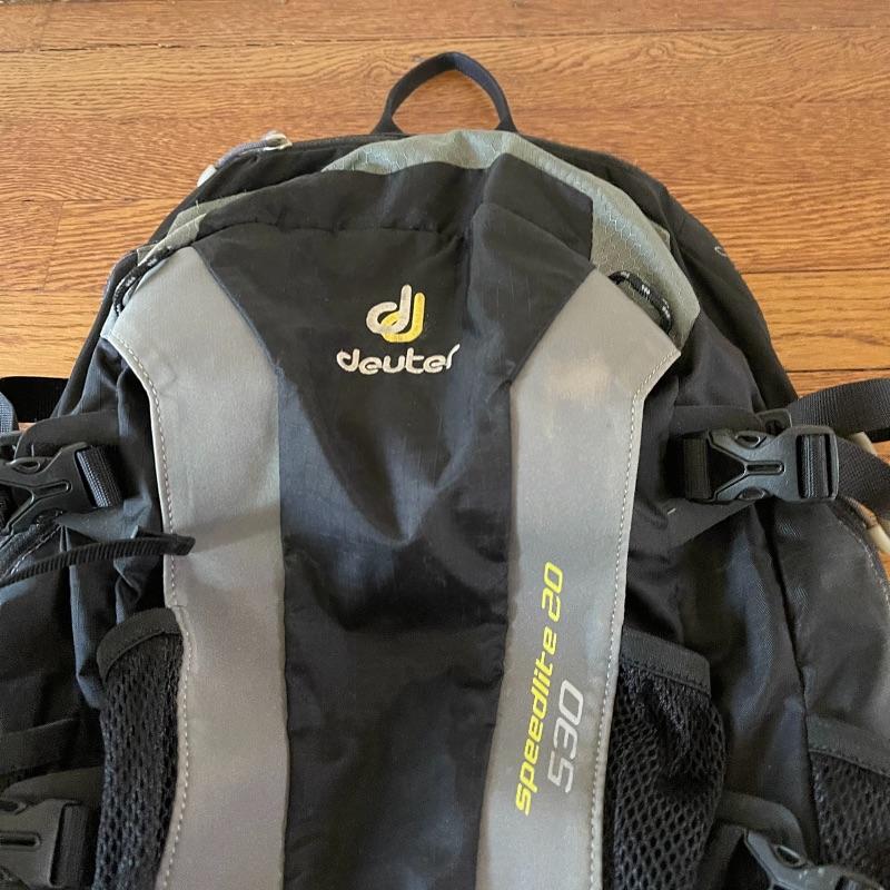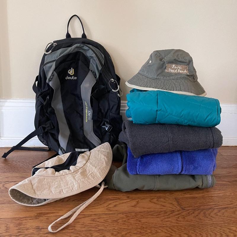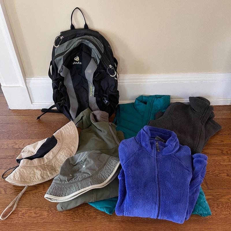 Women’s outdoor gear, includes a backpack, two bucket hats, one vest, and three fleece jackets. Small and medium sizes. The backpack is a Deuter speedlite 20 53. One of the bucket hats is a Teva and the other is from Canada. The jackets and vest are Talbots, Land’s End, White Sierra, and Eddie Bauer.