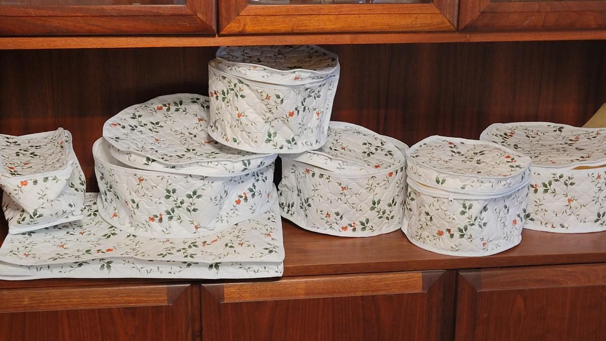 A few pieces have chips. Comes with storage bags but not enough for all dishes.